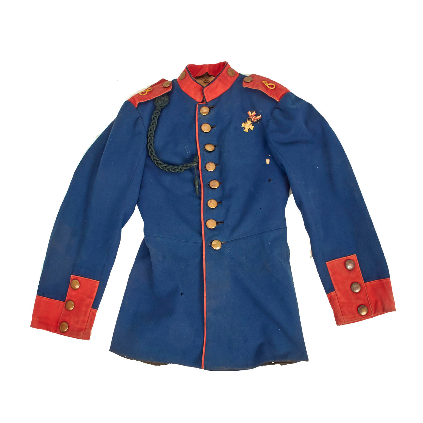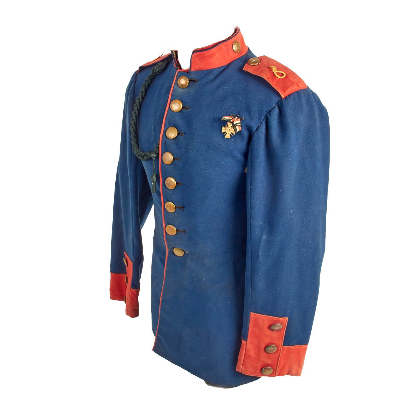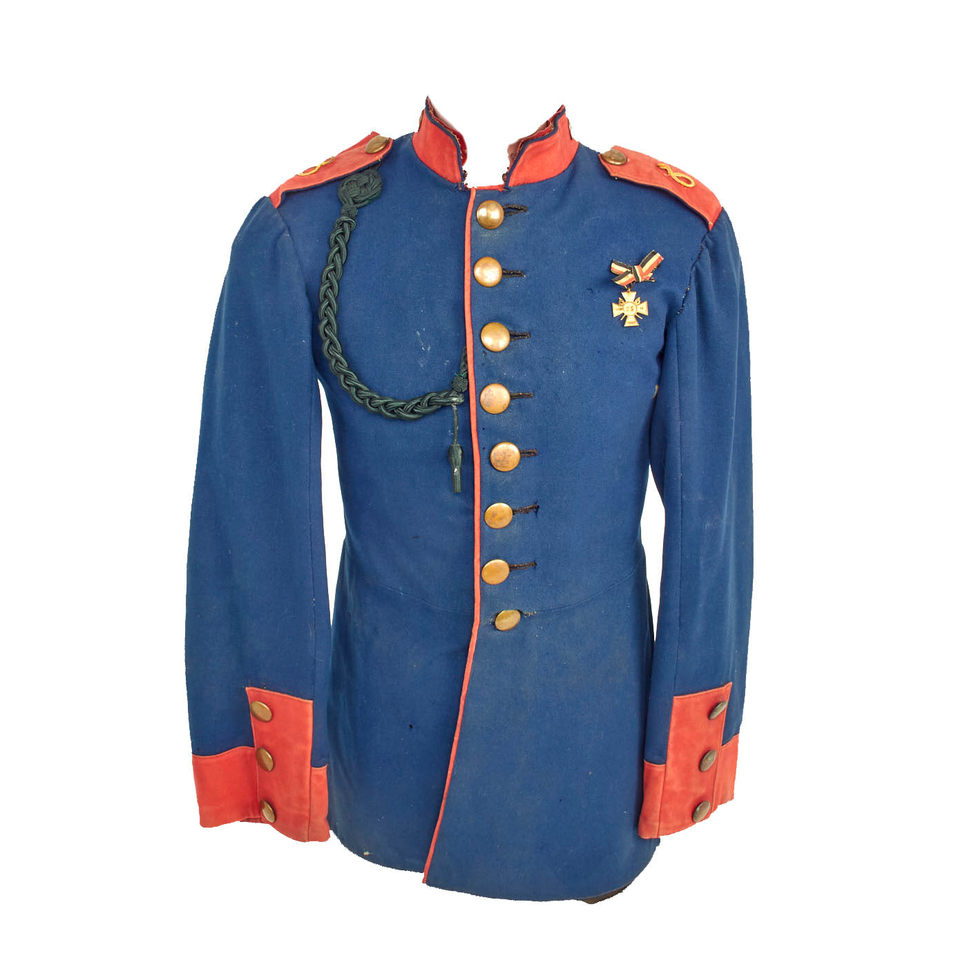 Original Item: Only One Available. This is a lovely M-1867 Bavarian Waffenrock, featuring the beautiful Brandenburg Cuffs! In 1842, Preußen (Prussia) introduced a new pattern of uniform for all foot-troops consisting of a uniform called a Waffenrock to be worn with a tall leather spiked helmet called a Pickelhaube. This form of dress was considerably different from the short Kollet (a waist-length jacket with tails) worn with the high leather Tschako during the Napoleonic wars.