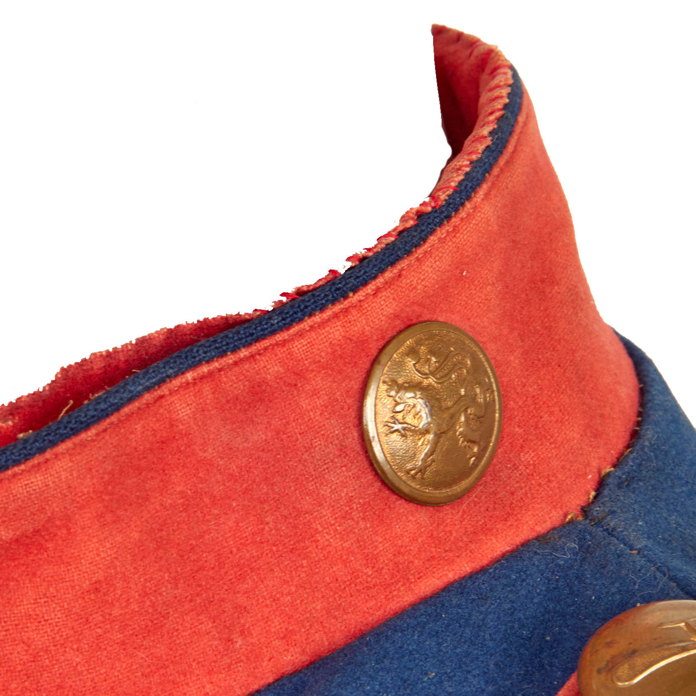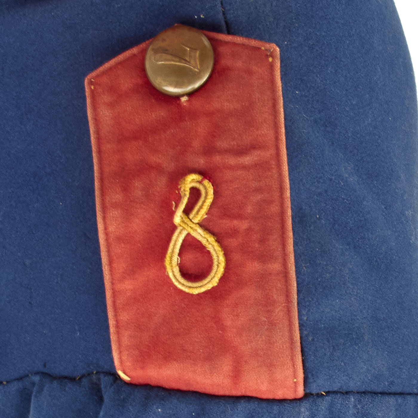 This M1867 has a lovely 1.5” standing collar, which is an indication of this being an issued one and not a private purchase. The color is the correct Dunkelblau and has red Brandenburg Cuffs. The Brandenburg cuff has a horizontal panel (usually red) around the circumference of the cuff, with a vertical panel superimposed on top. The vertical panel has three buttons. Both horizontal and vertical panels are often piped in the Army Corps color.