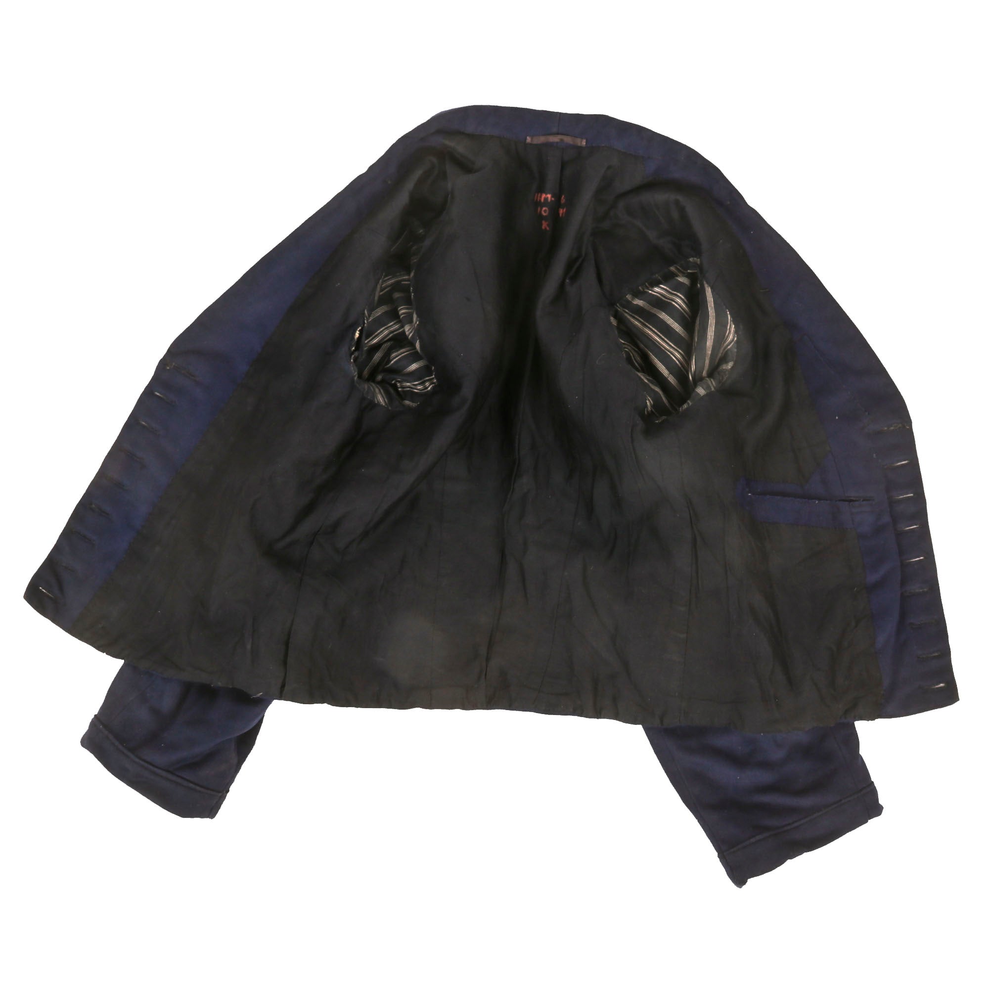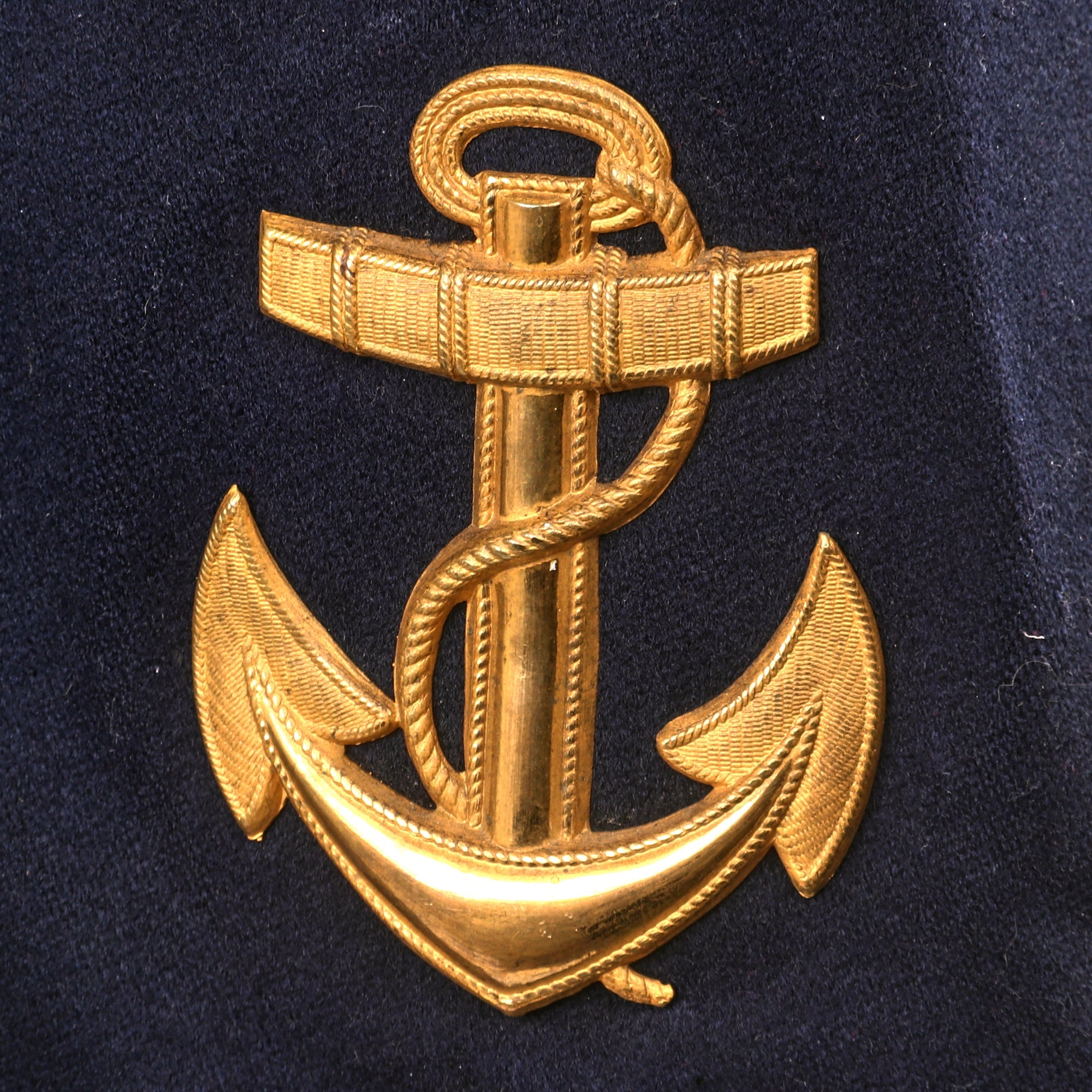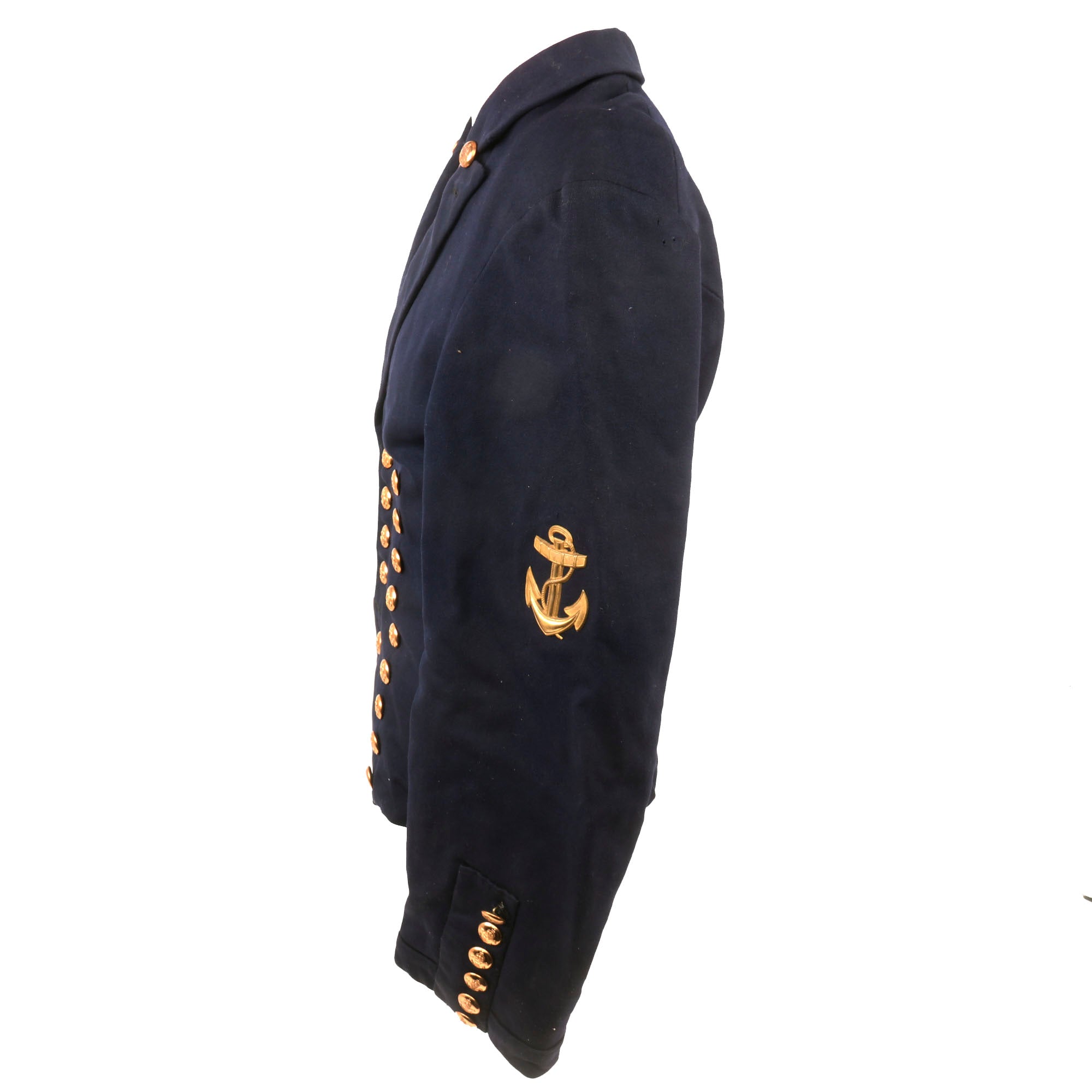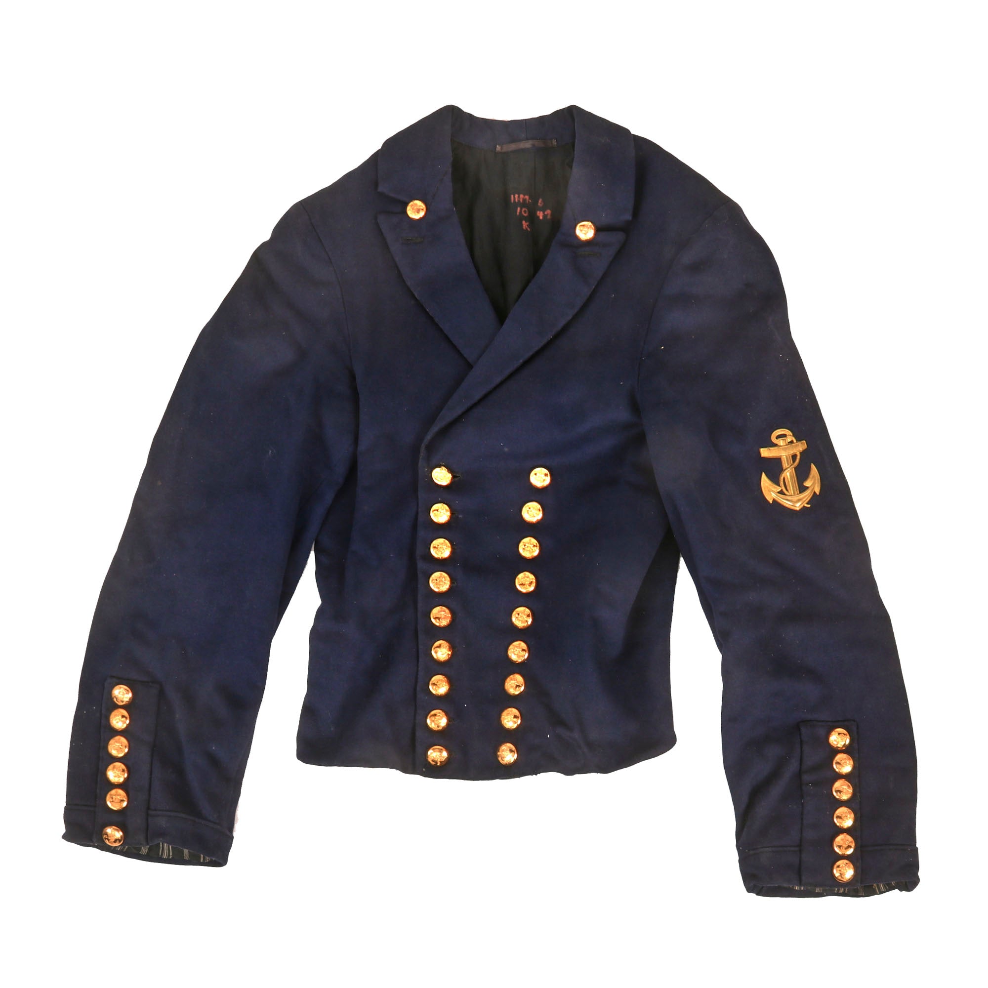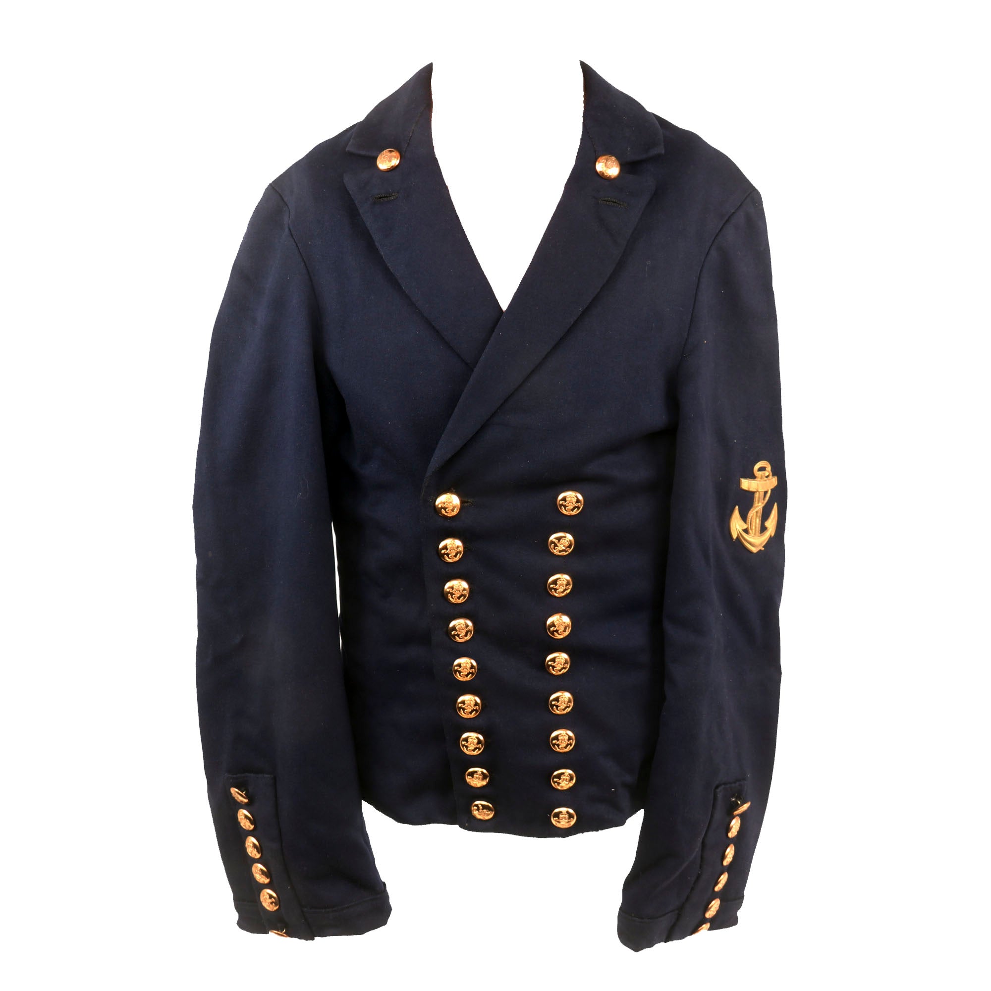 Original Item: Only One Available. The Dress Jacket ("Affenjacke") was made of dark blue wool and had eight brass (or white metal) buttons down either side, although it was often loosely held by a small chain between two additional buttons. This example retains all buttons and doesn’t have the chain. The cuffs had six buttons which are all retained on this example. NCO rank was displayed by a single chevron on the upper left arm for junior NCOs and lace on the cuffs for senior NCOs, but this example has a lovely Ship’s anchor insignia on the sleeve, indicating the rank of Petty Officer, or Maat. In the mid 19th Century the dress jacket had been standard wear for Prussian (and later German) sailors, but in the early twentieth century it was worn only on parade or for special occasions.