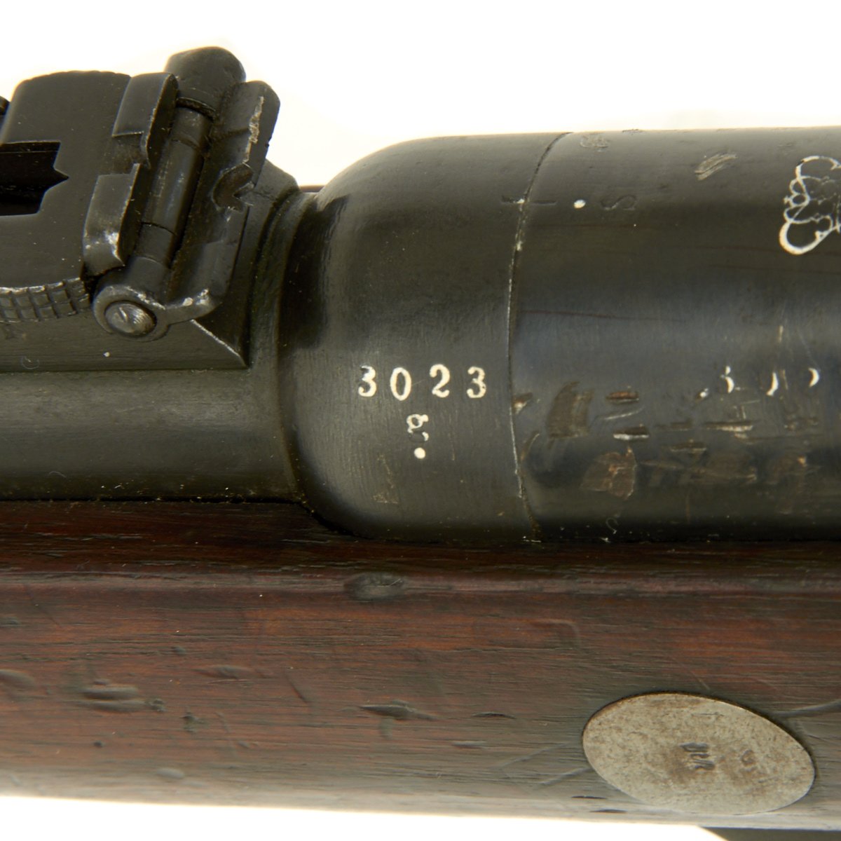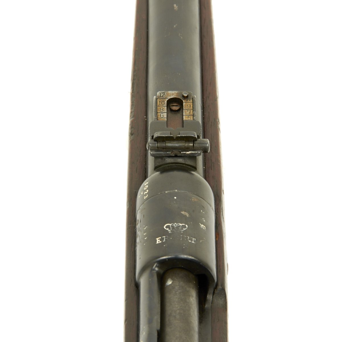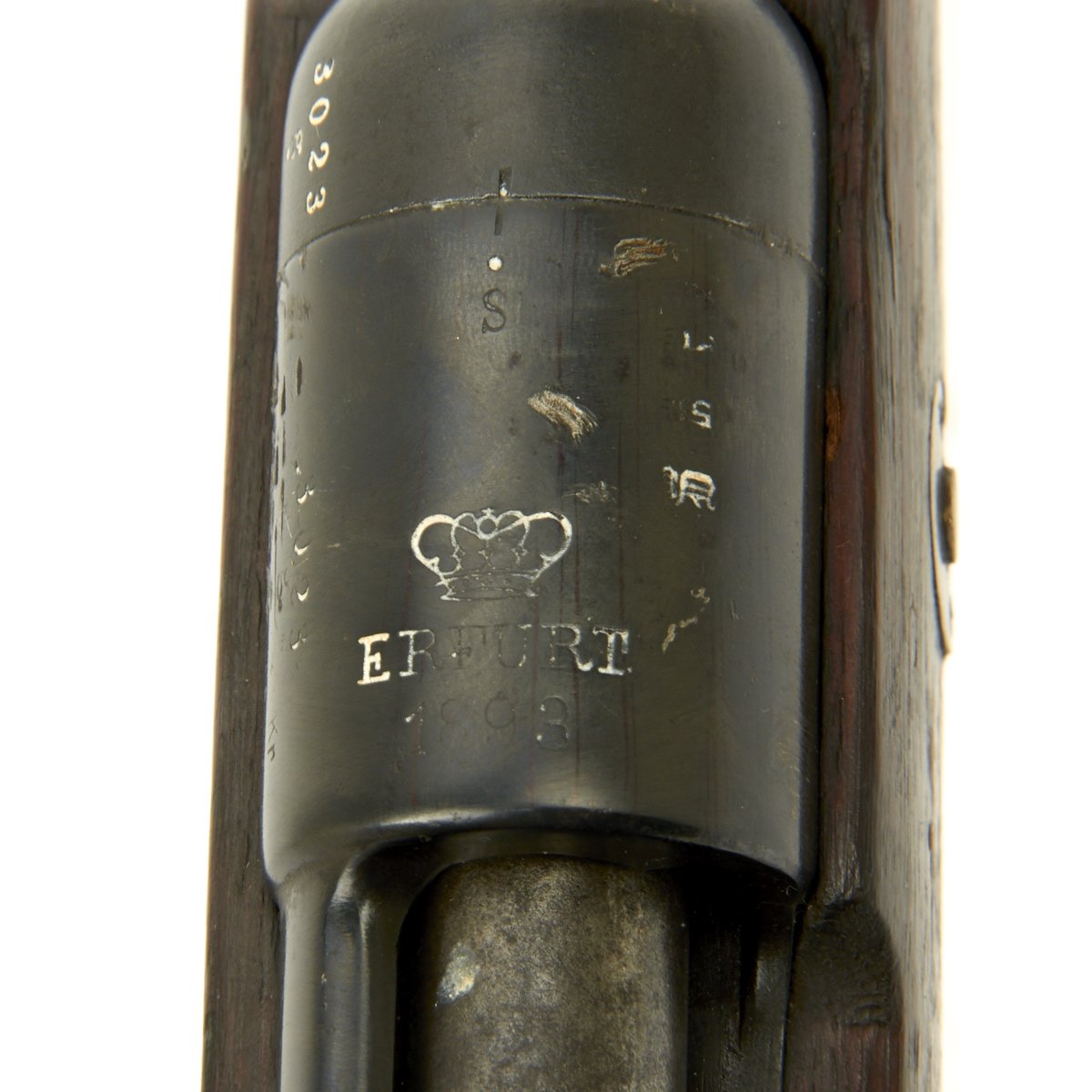 Our example is of the Cavalry Carbine and is made at the great Arsenal outside Berlin ERFURT and is dated 1893. The Barrel, Receiver, Stock, Butt Plate, Trigger Guard and barrel band are marked with serial # 3023, , while the bolt is not matching. The carbine has an 18" barrel and a good bore, though the rifling is somewhat worn. It bears an S marked over the chamber to indicate modification for the S-PATRONE cartridge introduced in 1903 (we do not recommend firing the S-cartridge in this carbine). This short carbine was intended for use by cavalry units.