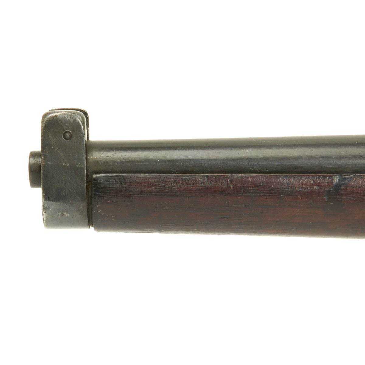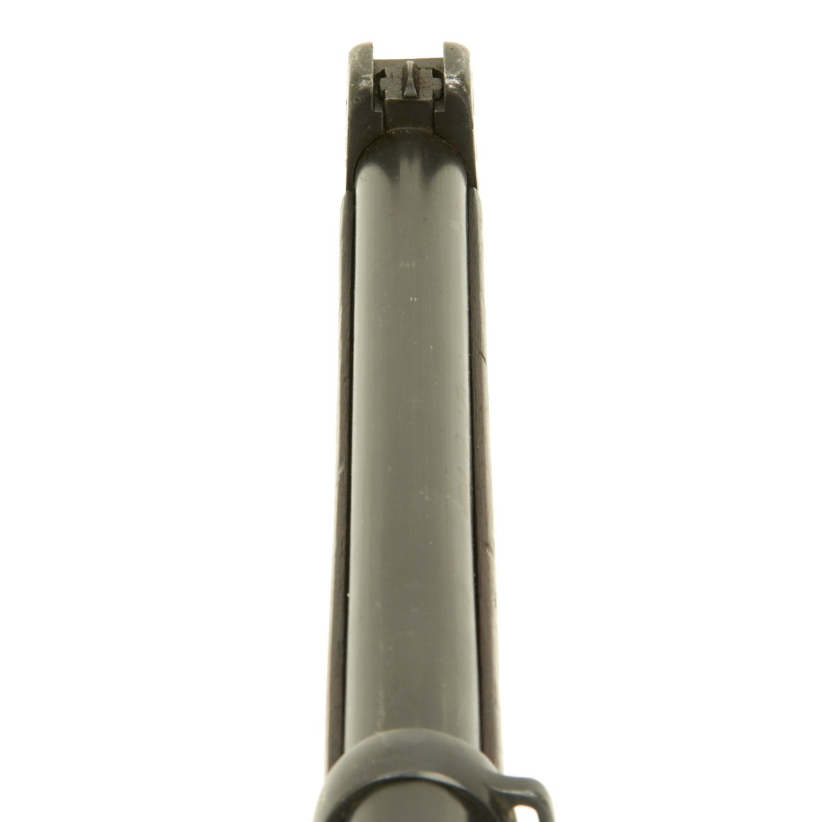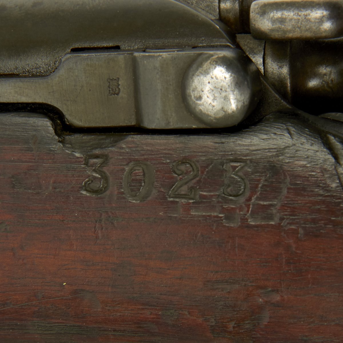 Our example is of the Cavalry Carbine and is made at the great Arsenal outside Berlin ERFURT and is dated 1893. The Barrel, Receiver, Stock, Butt Plate, Trigger Guard and barrel band are marked with serial # 3023, , while the bolt is not matching. The carbine has an 18" barrel and a good bore, though the rifling is somewhat worn. It bears an S marked over the chamber to indicate modification for the S-PATRONE cartridge introduced in 1903 (we do not recommend firing the S-cartridge in this carbine). This short carbine was intended for use by cavalry units.