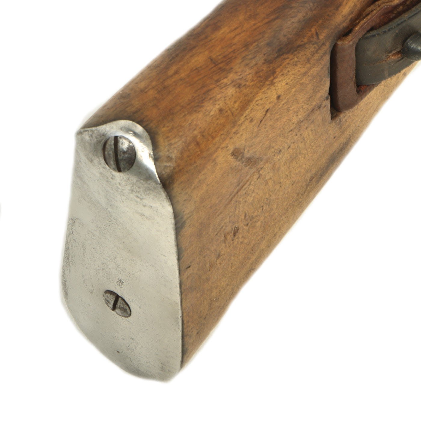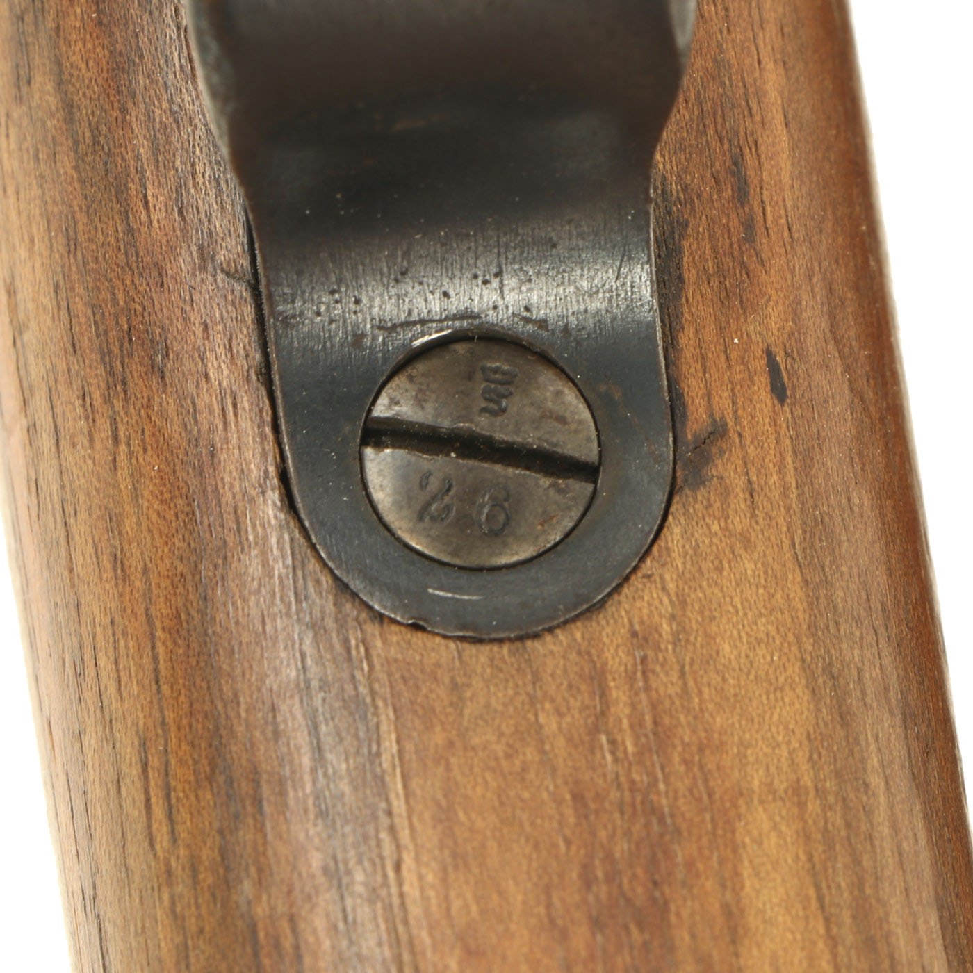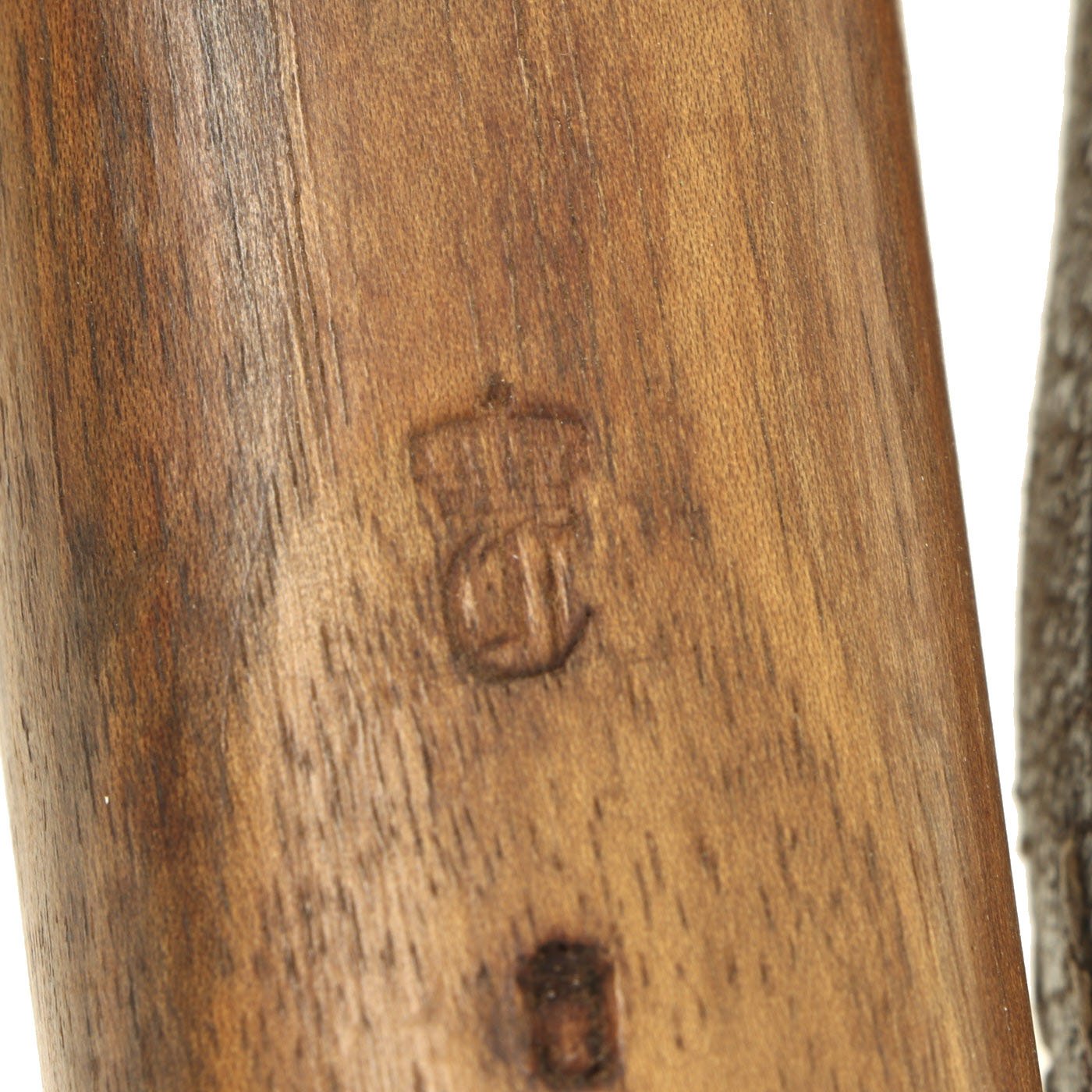 The stock is in great shape, with a honey colored stock, most likely made from Beechwood. It shows minimal reconditioning, and still has clear proof marks stamped into the wood. There are some light dents from service, but no major damage or repairs we can see. The finish on the metalwork is quite good, with a bright steel finish on the receiver, and blued barrel and other hardware, as originally issued. There is even a very nice modified sling attached to the rifle, though there are some modern replaced parts.