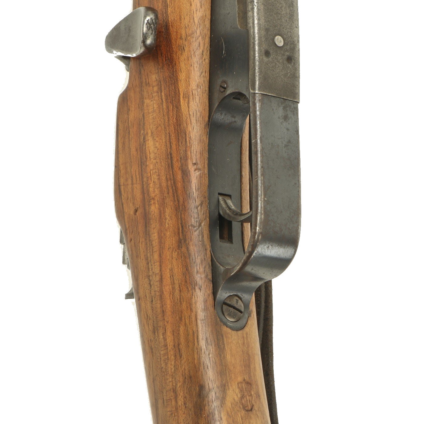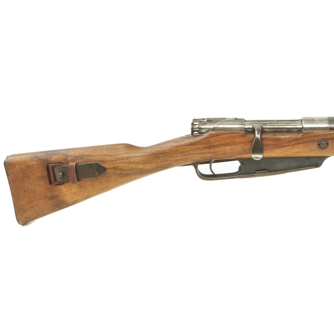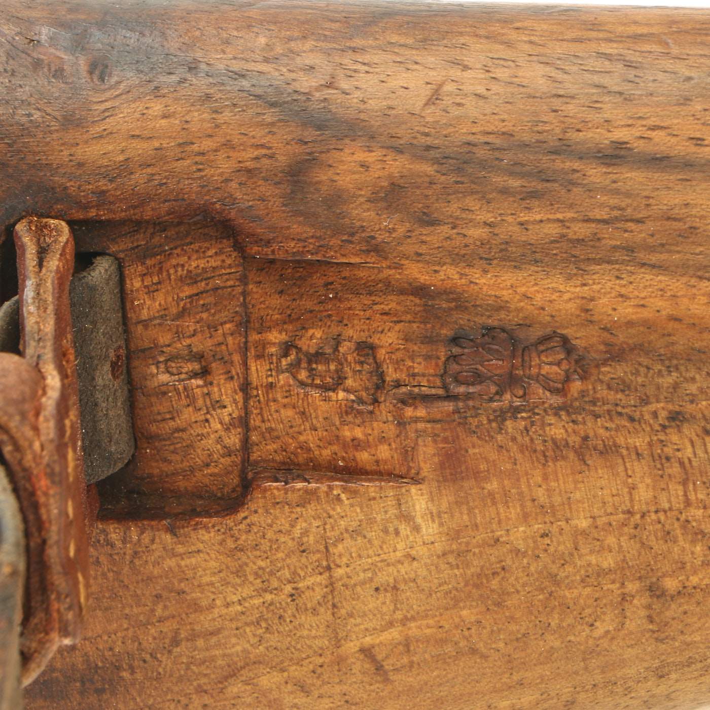 The stock is in great shape, with a honey colored stock, most likely made from Beechwood. It shows minimal reconditioning, and still has clear proof marks stamped into the wood. There are some light dents from service, but no major damage or repairs we can see. The finish on the metalwork is quite good, with a bright steel finish on the receiver, and blued barrel and other hardware, as originally issued. There is even a very nice modified sling attached to the rifle, though there are some modern replaced parts.