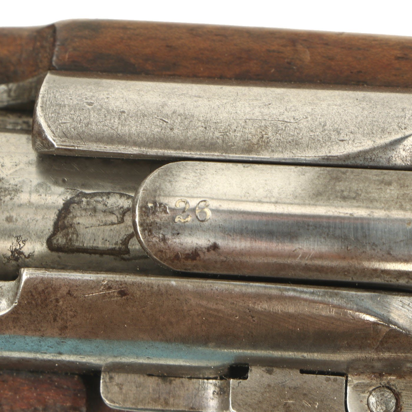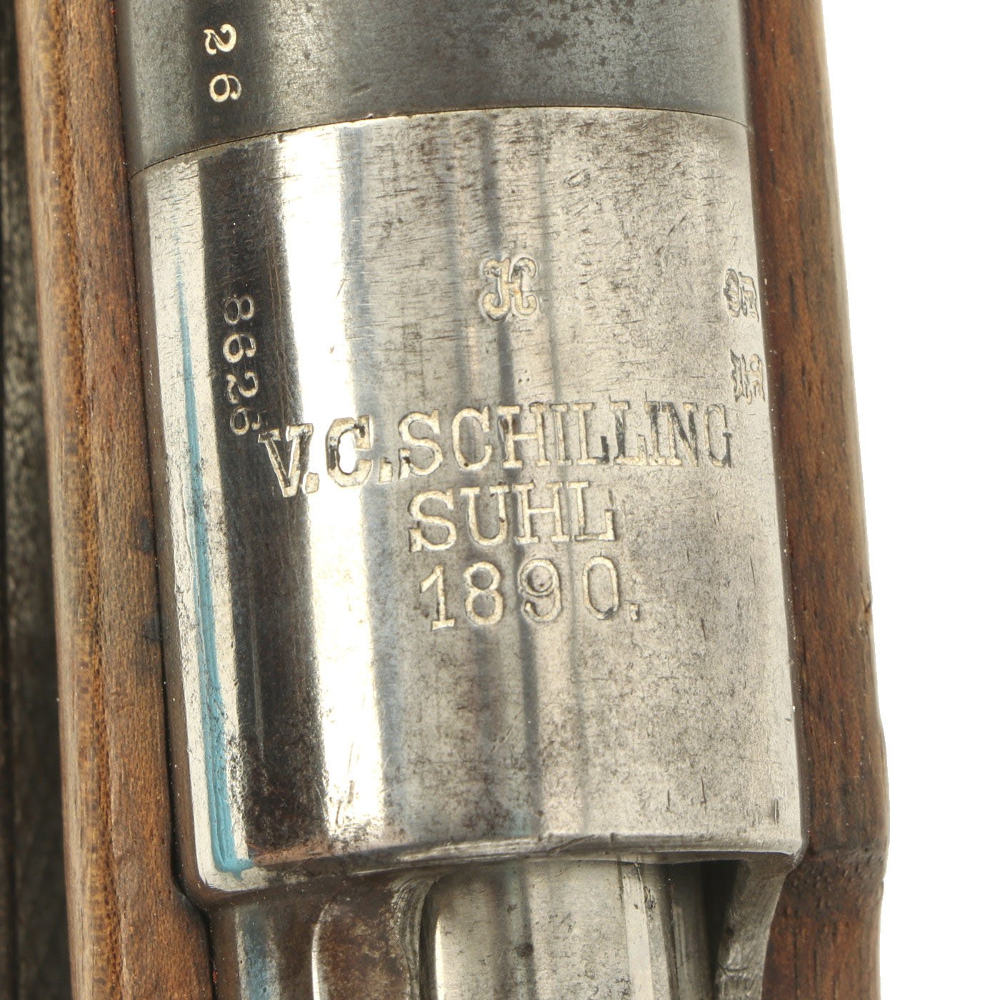 Our example is of the Cavalry Carbine and was made by government contractor V.C. SCHILLING, located in SUHL in 1890, as indicated on the top of the receiver. There is another marking above this which looks like two opposed letter Cs. The right side of the receiver is marked with Kar. 88. in German blackface type, and there are additional proof marks on various components of the carbine. The barrel, receiver, bolt, and other components are marked with serial number 8626, or shortened number 26. The only major component not matching is the magazine housing, marked with 7300. Many of the markings have been highlighted with white paint.