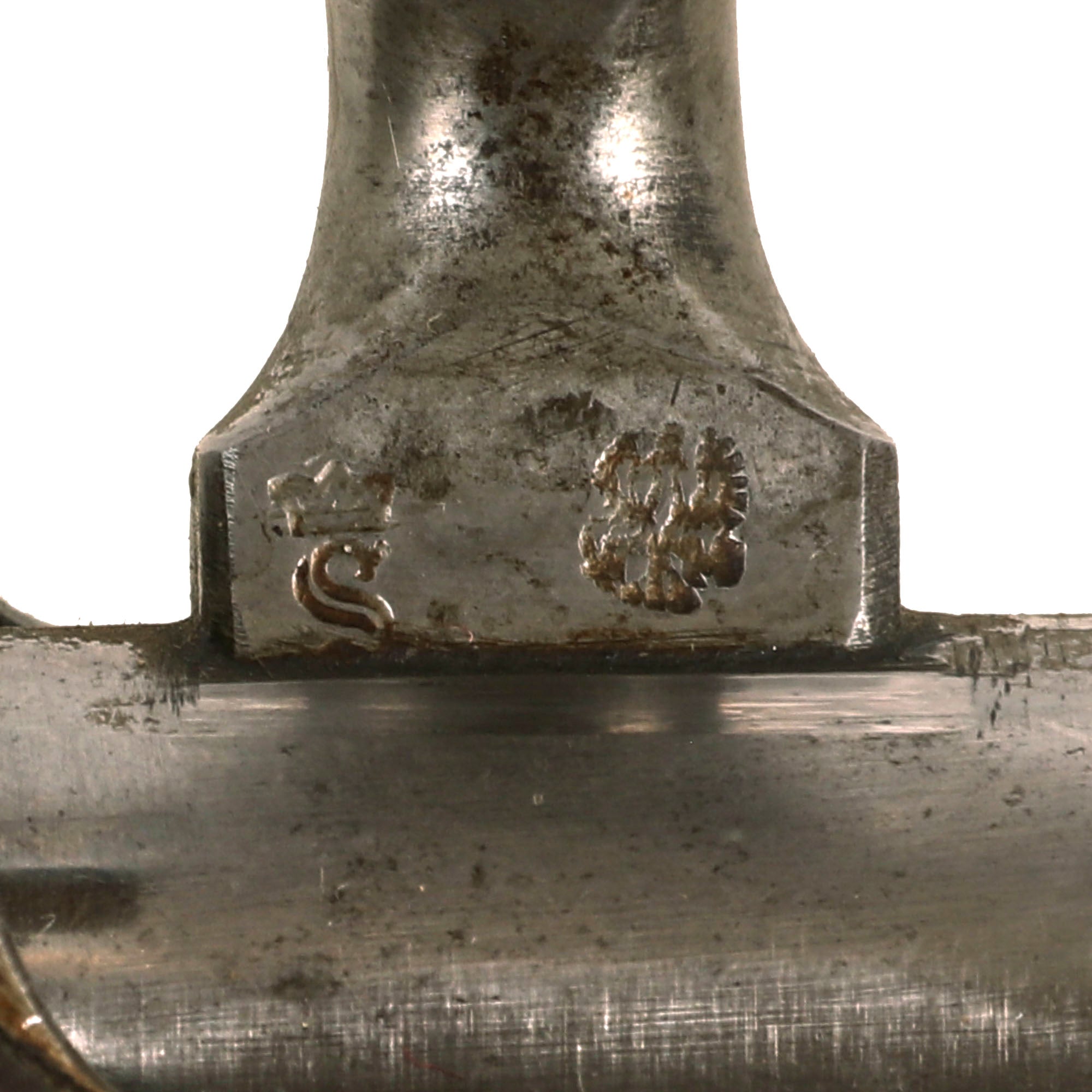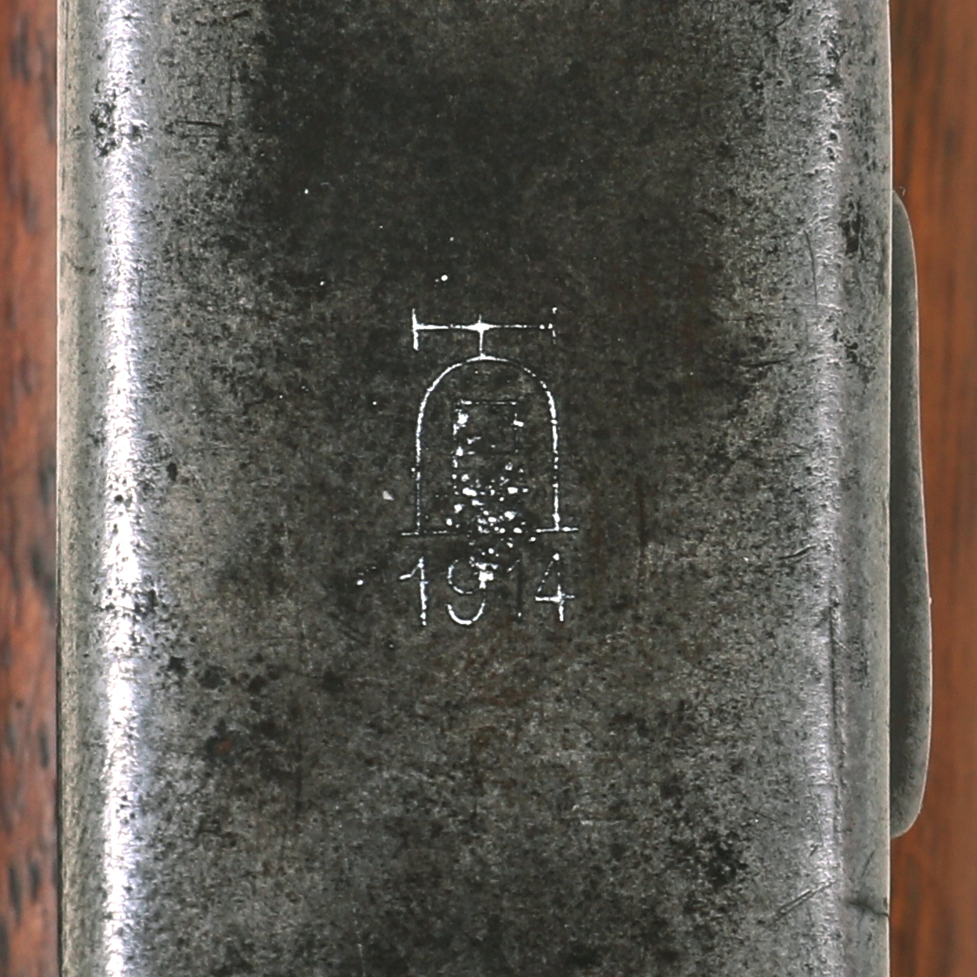 The carbine has an 18" barrel, which has a very good condition bore, showing a mostly bright finish with clear lands and grooves. There is a bit of light wear to the lands, and some past fouling in the grooves, but nothing out of line with a carbine that saw light service. The rifle cycles and dry fire well, and the firing pin is fully intact, as is the often lost cartridge ejector on the bolt face. We checked the safety and it is fully functional. It bears a stylized "H" marked over the chamber to indicate modification for the S-PATRONE cartridge introduced in 1903 (we do not recommend firing the S-cartridge in this carbine). We have seen this marking used in place of the "S" on carbines before. This short carbine was intended for use by cavalry units.