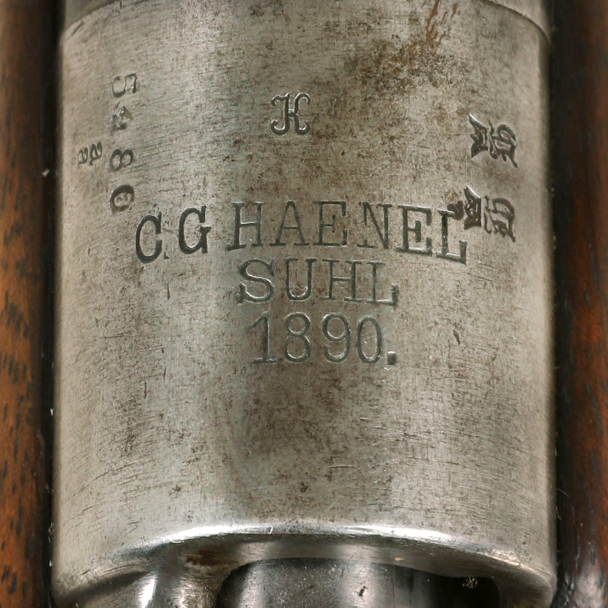 Our excellent example is of the Cavalry Carbine and was made by government contractor C.G. HAENEL, located in SUHL in 1890., as indicated on the top of the receiver. The right side of the receiver is marked with Kar. 88. in German blackface type, and there are additional proof marks on various components of the carbine. The receiver, barrel jacket, bolt, magazine housing, and other components are marked with serial number 5480 / a, or shortened number 80. That makes this a very desirable ALL MATCHING example, with no parts swapped out over the years, and it's a great one!