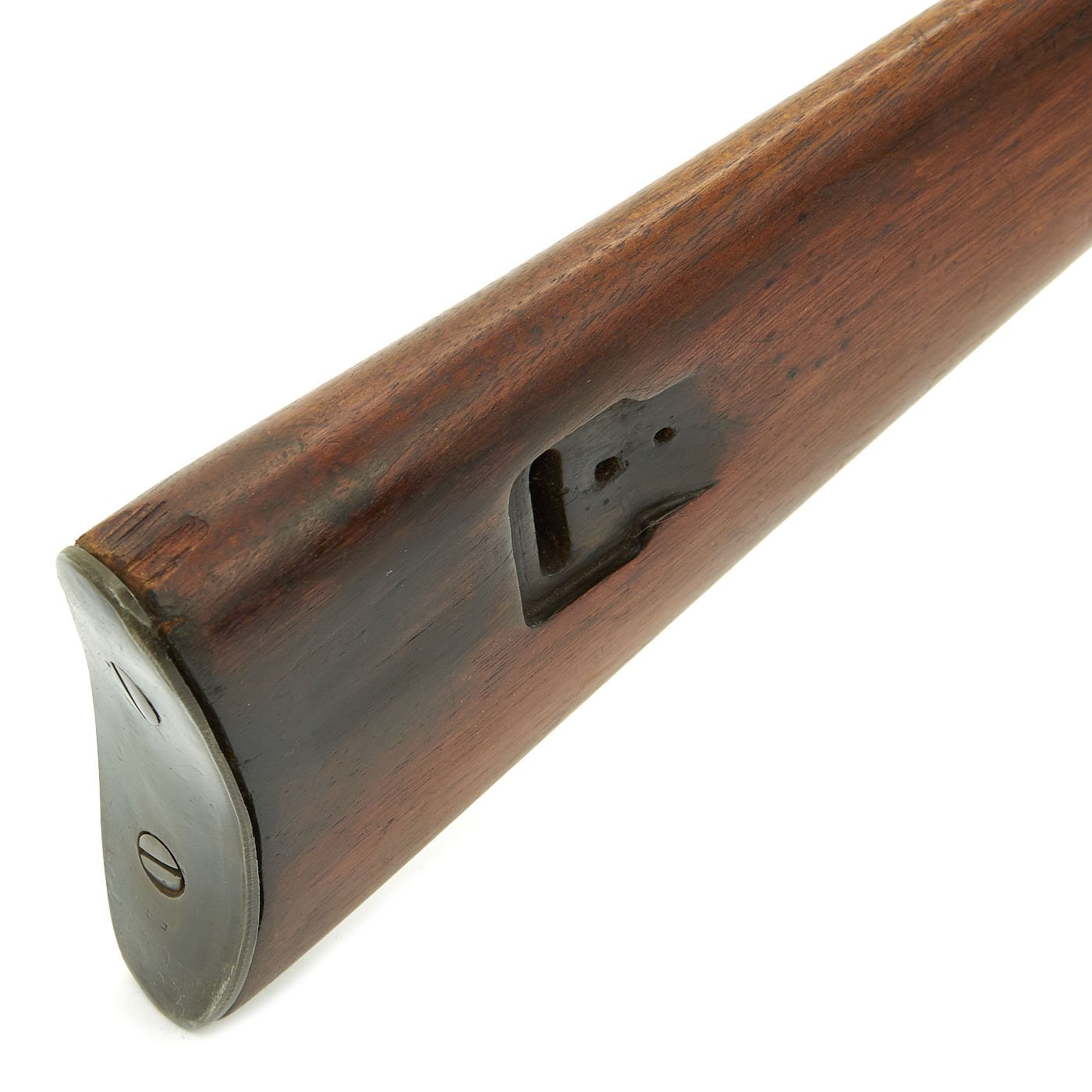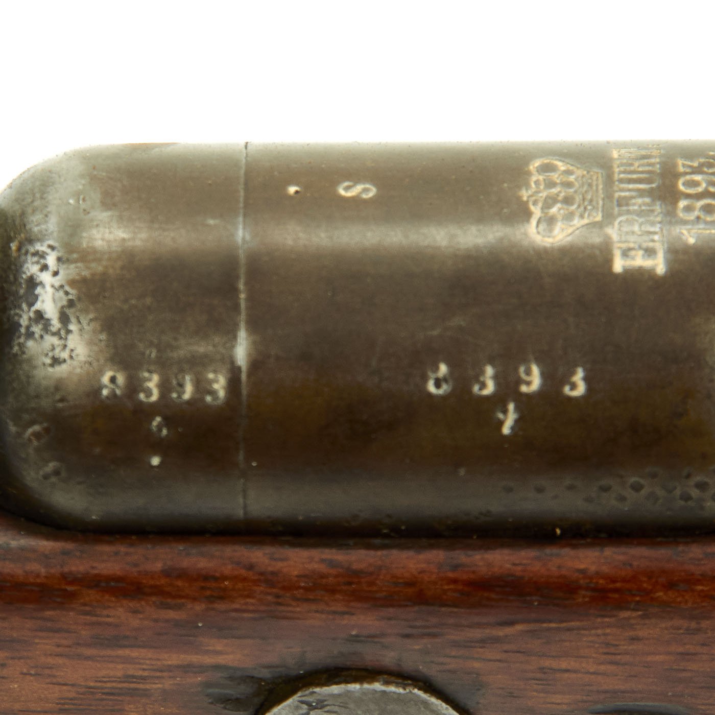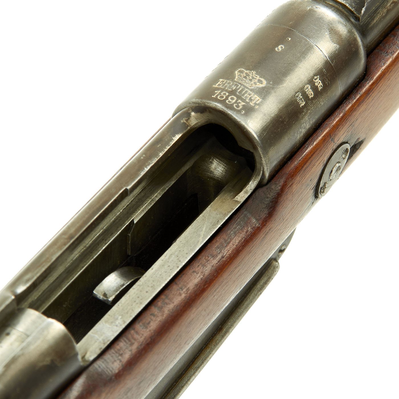 Our example is of the Cavalry Carbine is marked over the chamber with (CROWN) / ERFURT. / 1893., for 1893 manufacture at the Imperial Erfurt Arsenal, located in Thuringia. The right side of the receiver is marked with Kar. 88. in German blackface type, and there are additional proof marks on various components of the carbine. All parts of the gun that we can see are marked with serial number 8393 / g, or the shorter 93. This is a very nice ALL MATCHING example.