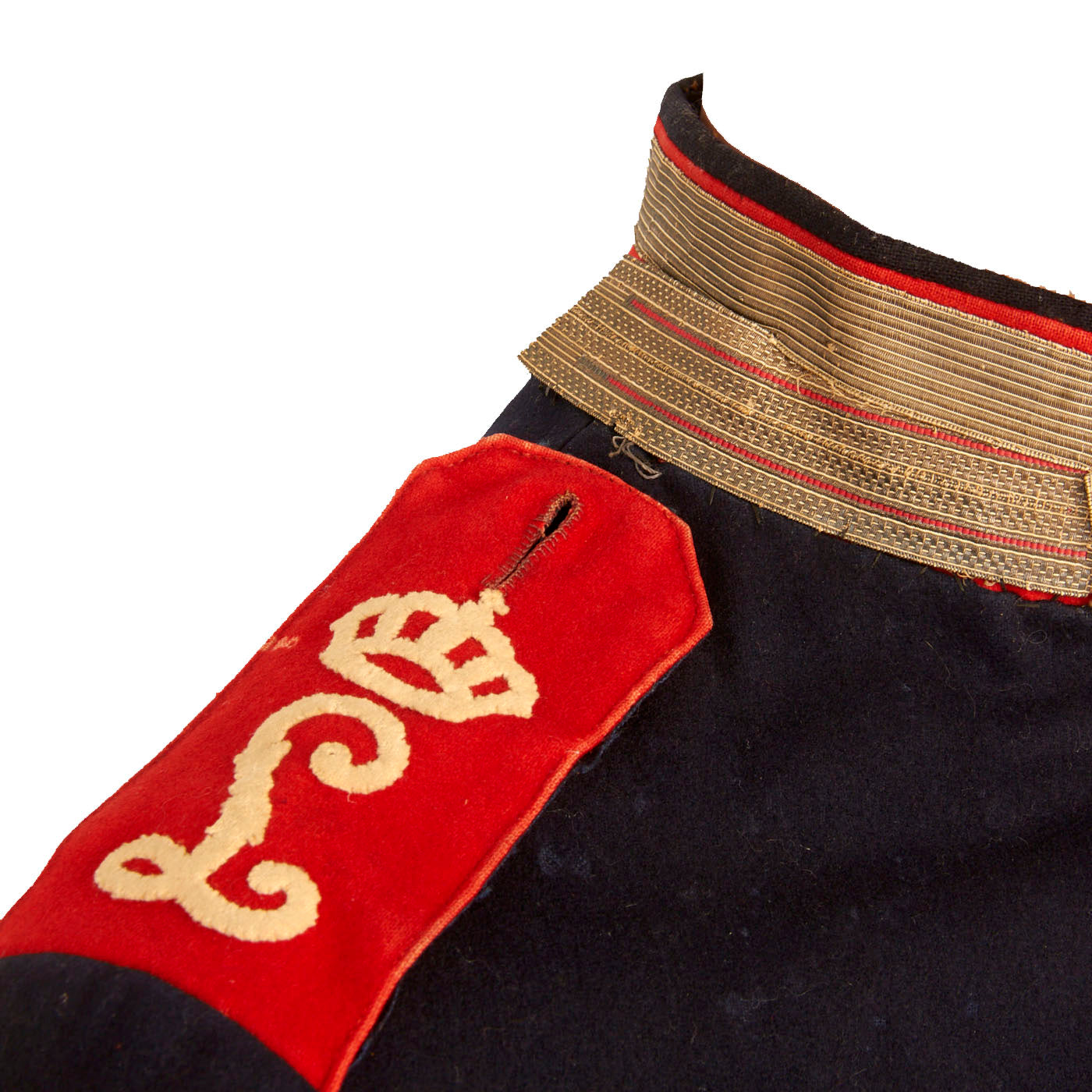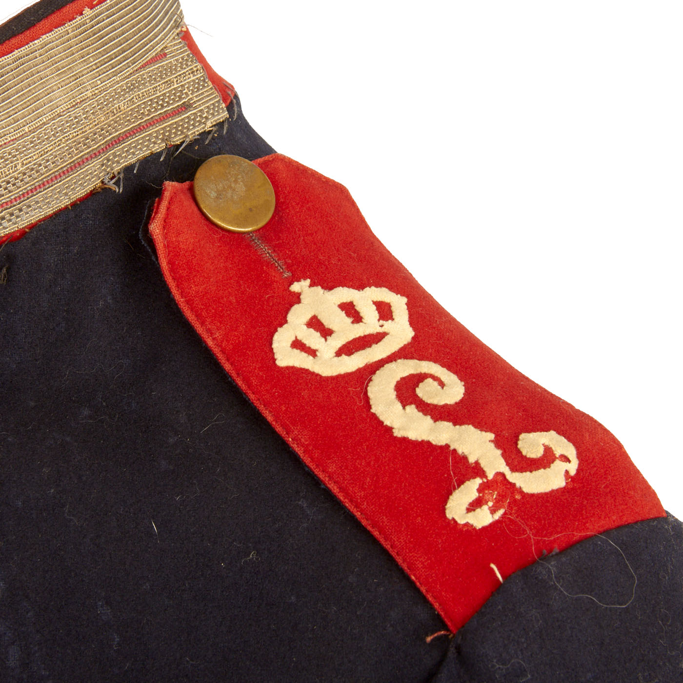 This M1895 has a lovely 2” (5cm) standing collar, which is an indication of this being an issued one and not a private purchase. The color is the correct Dunkelblau and has red Brandenburg Cuffs. The Brandenburg cuff has a horizontal panel (usually red) around the circumference of the cuff, with a vertical panel superimposed on top. The vertical panel has three buttons. Both horizontal and vertical panels are often piped in the Army Corps color.