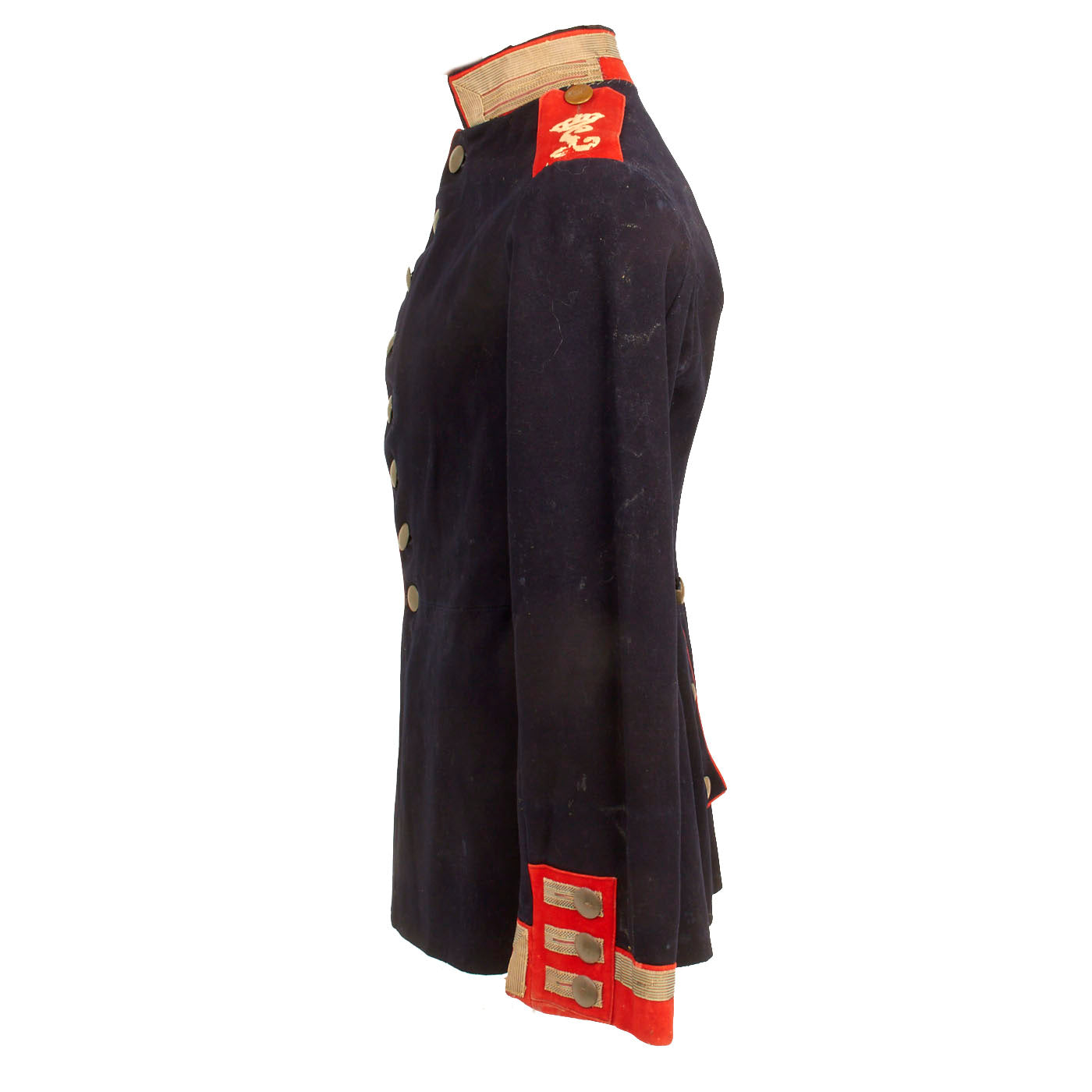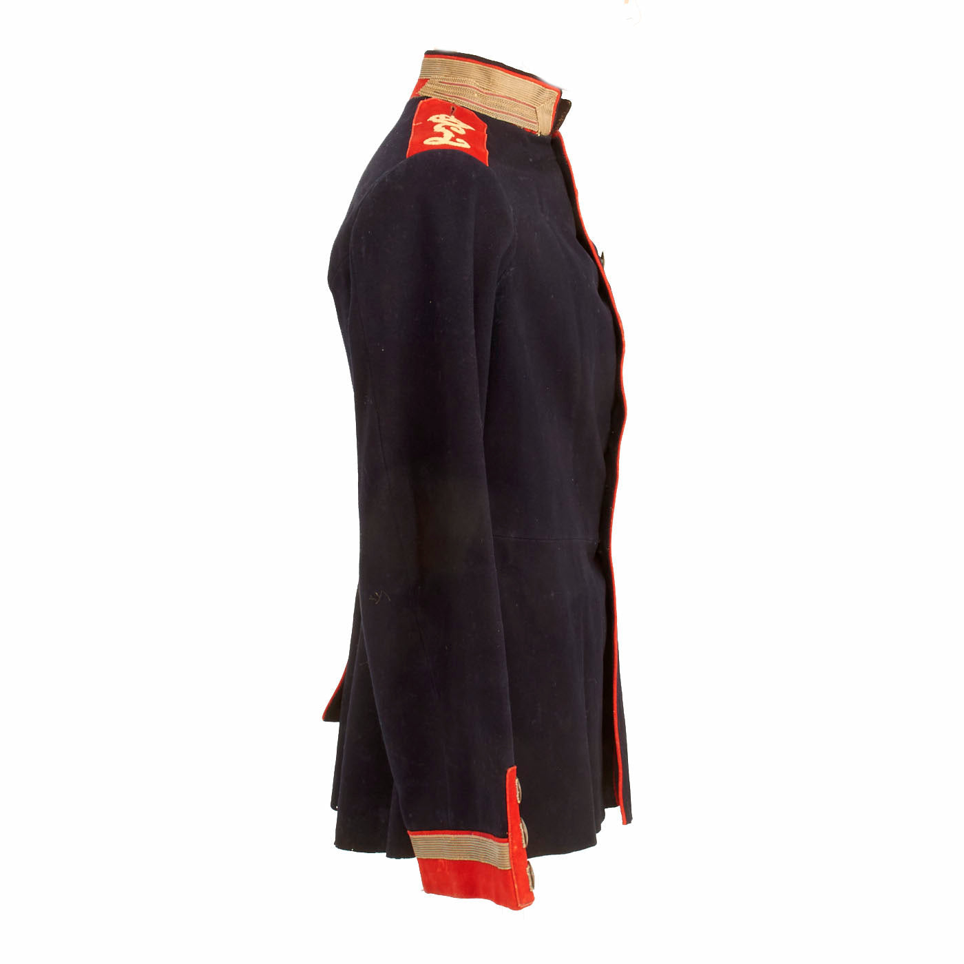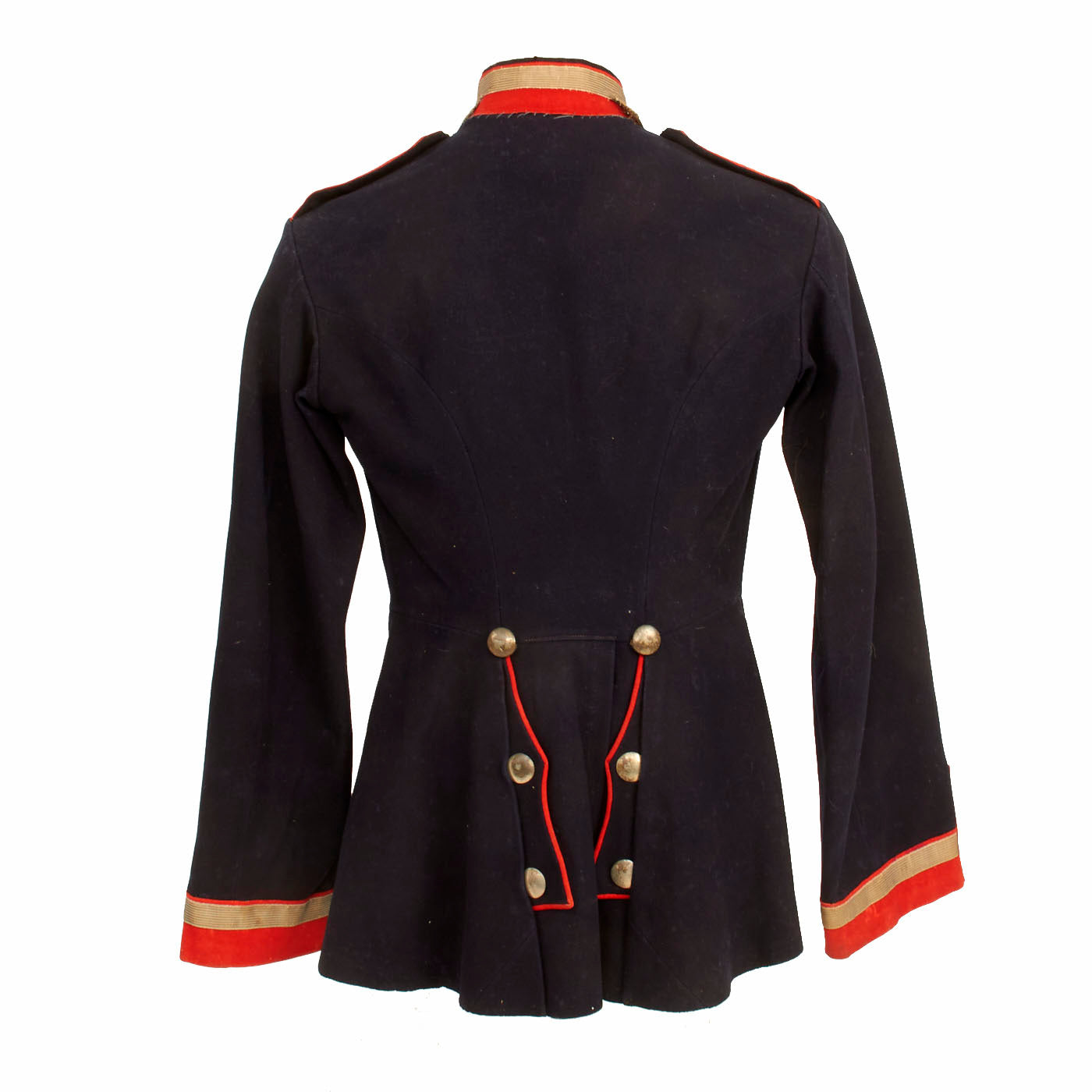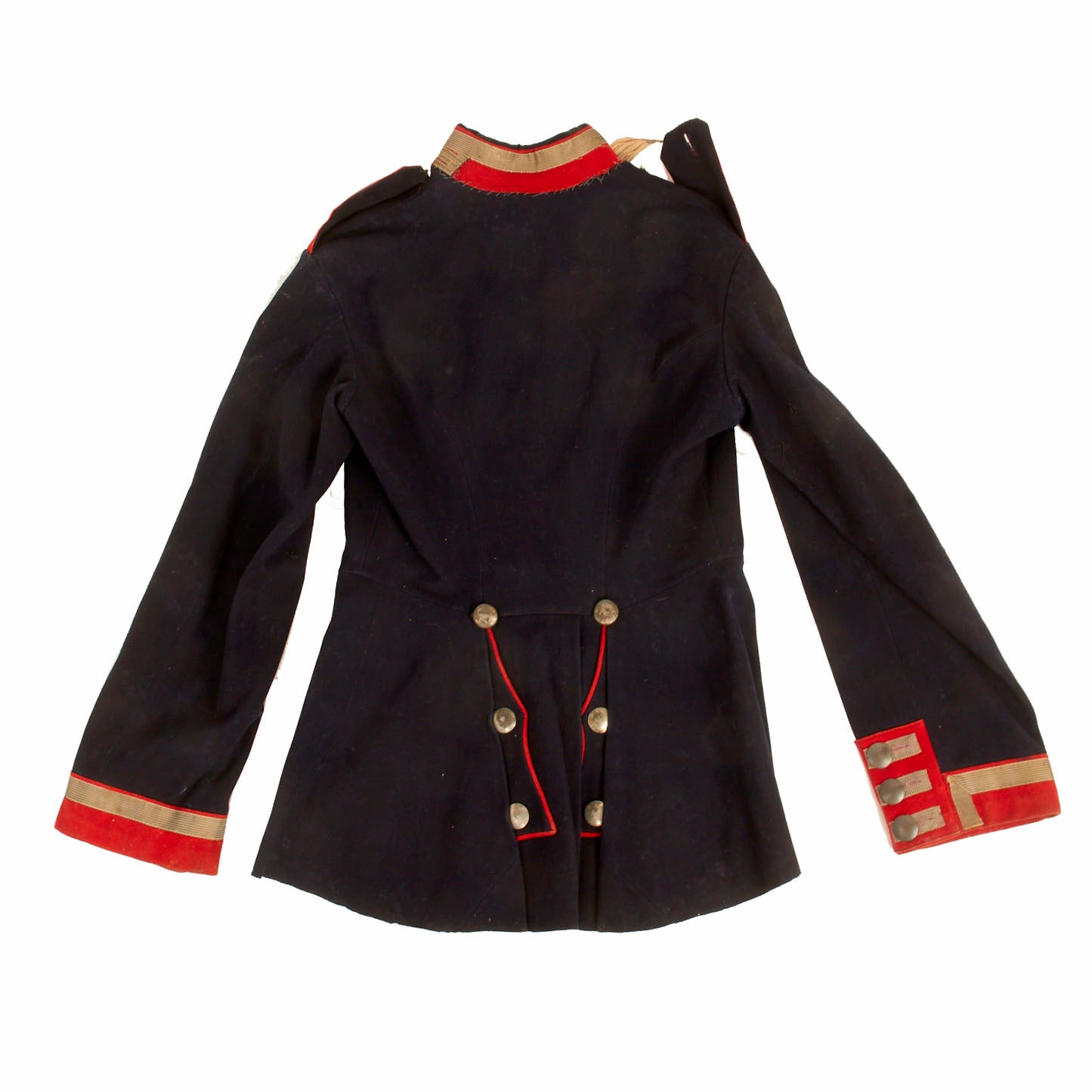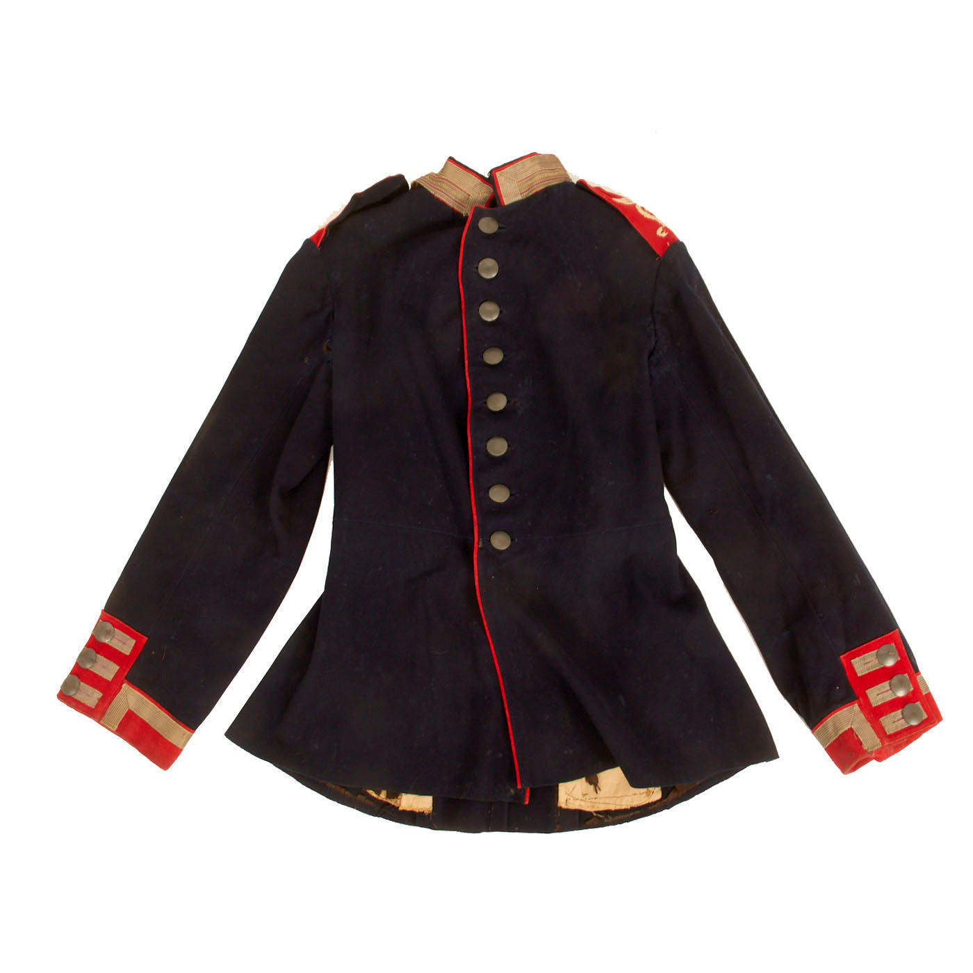 The overall condition is nice but there are some factors that affect the condition. The piping on the collar is missing from the back with deteriorated stitching. There is also minor separation in the collar as well. All buttons are present and there is some deterioration to the inner lining, as well as staining, an indication of this uniform being worn.