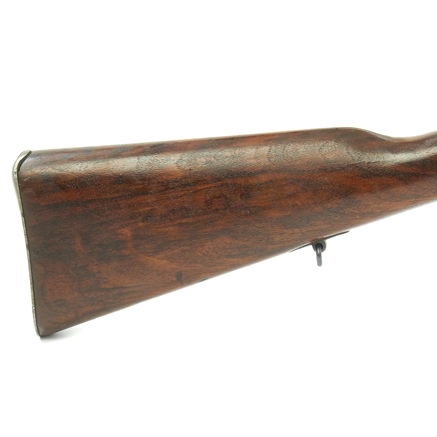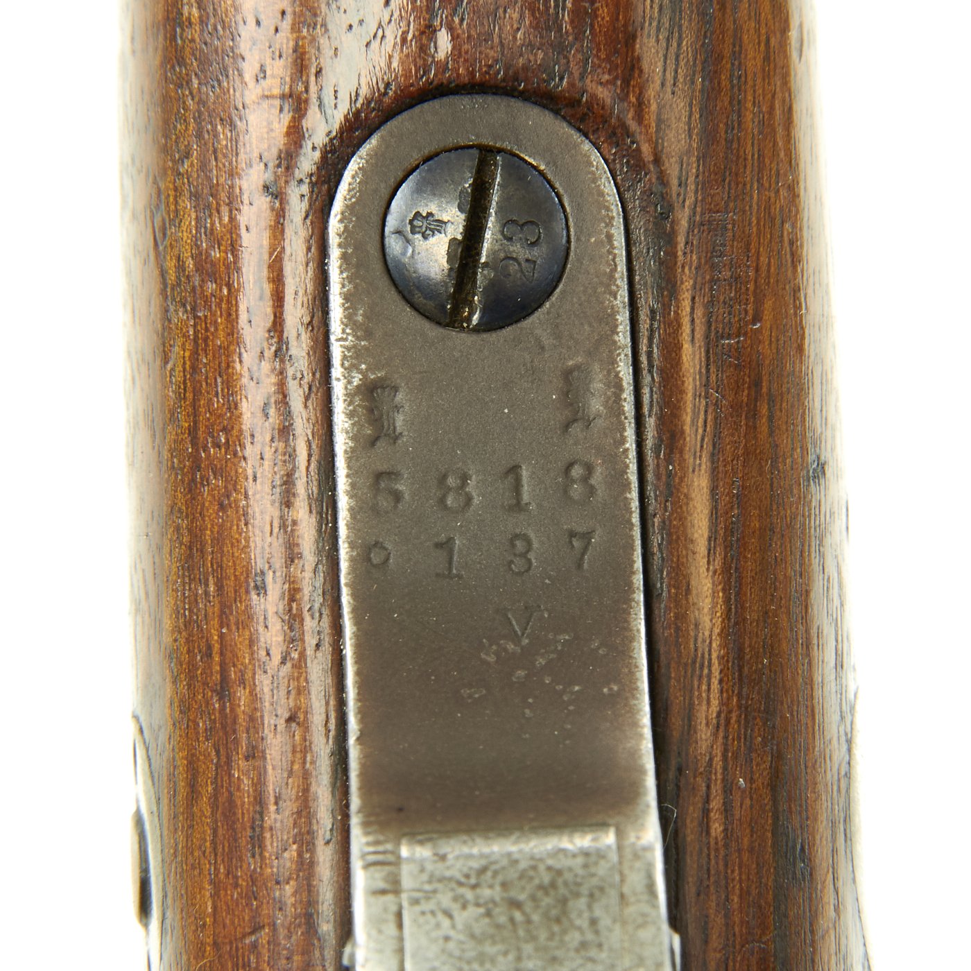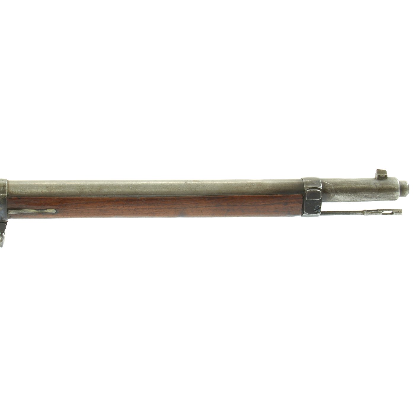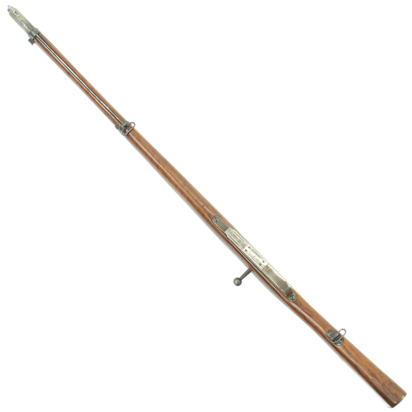 Rifle is in good used condition, with a solid refinished stock and metalwork with a nice gray patina. As the stock has has been sanded and refinished, the proofs are unfortunately worn away. Also the upper but plate screw is missing. It does have wear on the bolt bearing surfaces, however the bore is actually pretty good. It has clear lands and grooves, with a partly bright finish, and light oxidation in the grooves. The rare double-slot cleaning rod is still present, as is the bolt extractor, which is easily lost during cleaning.