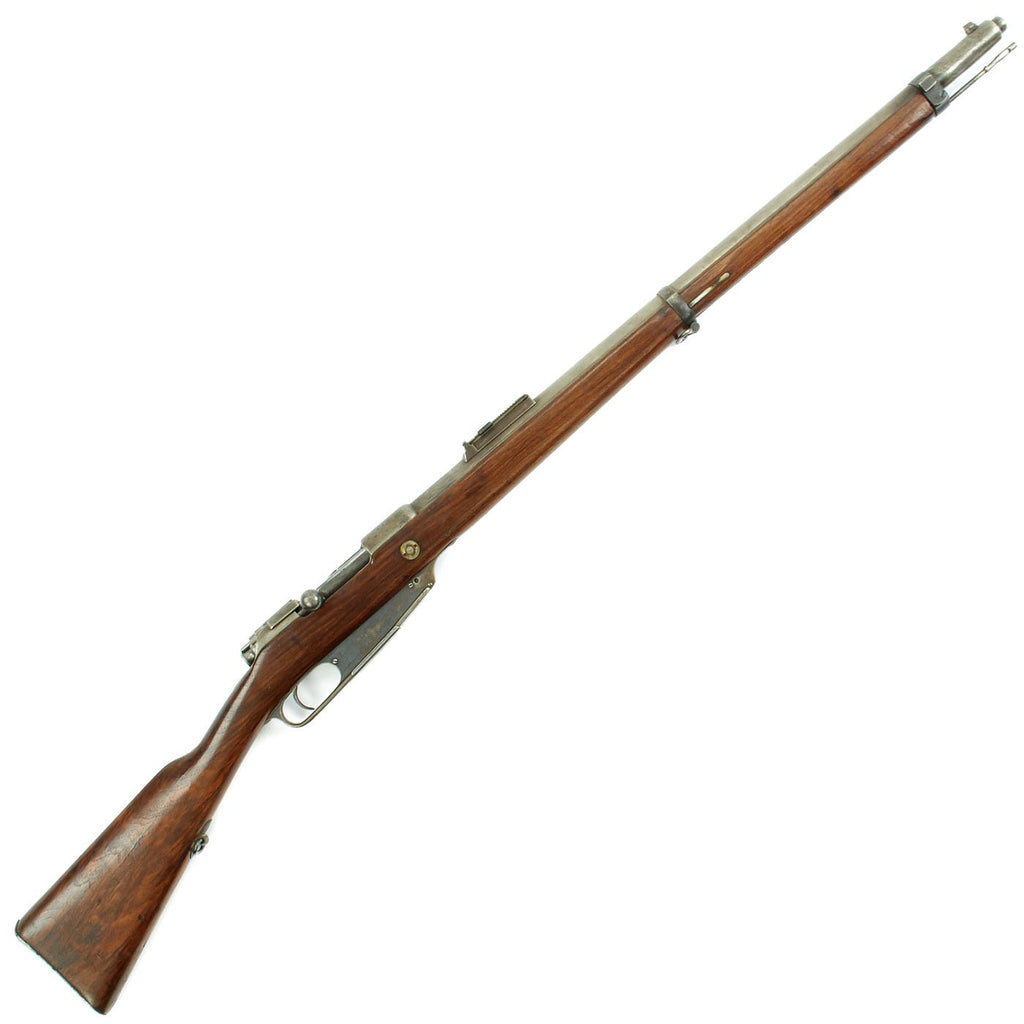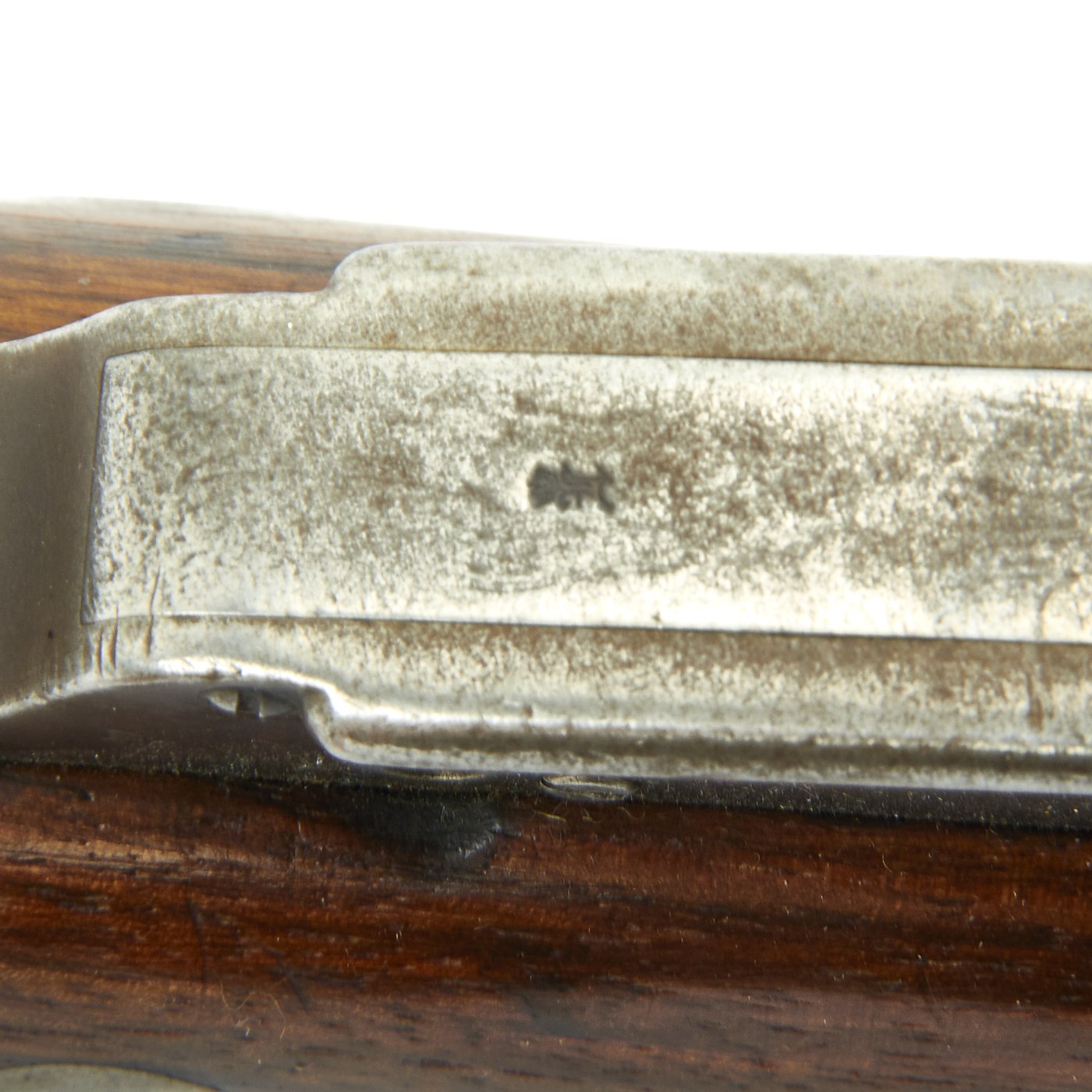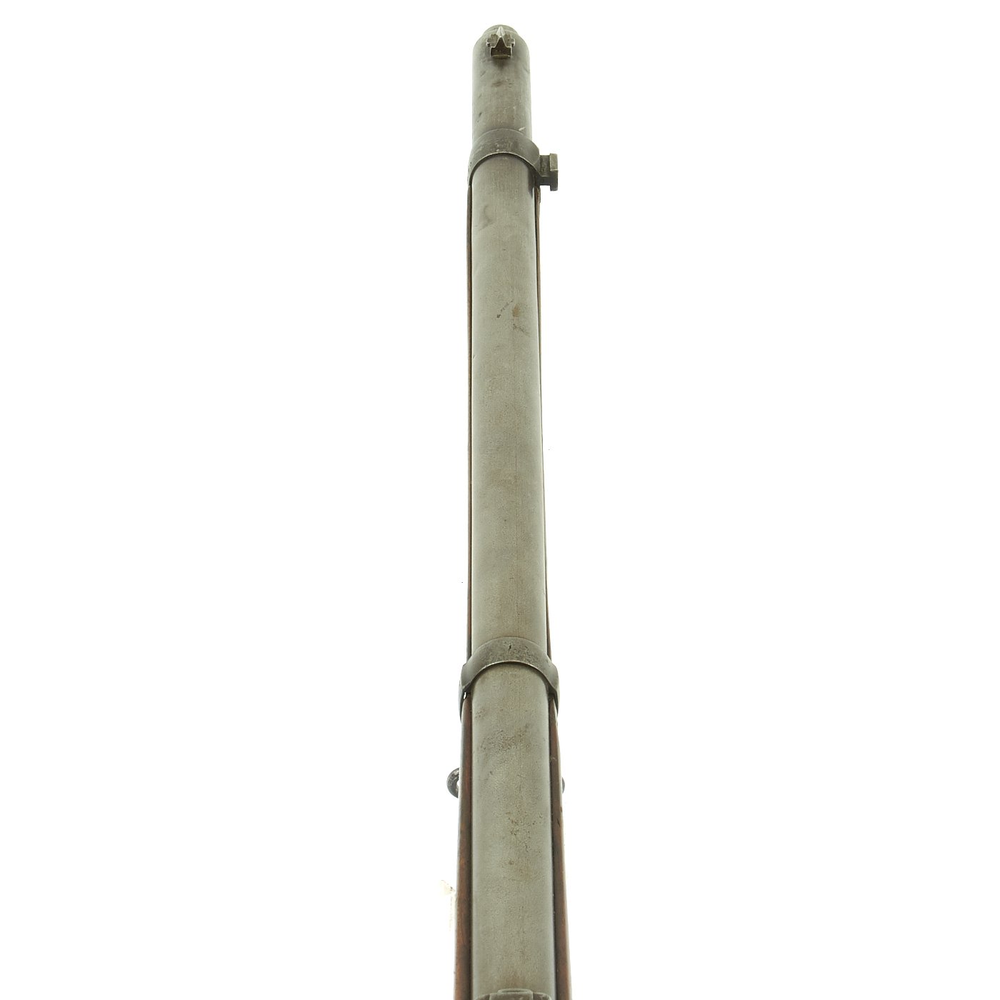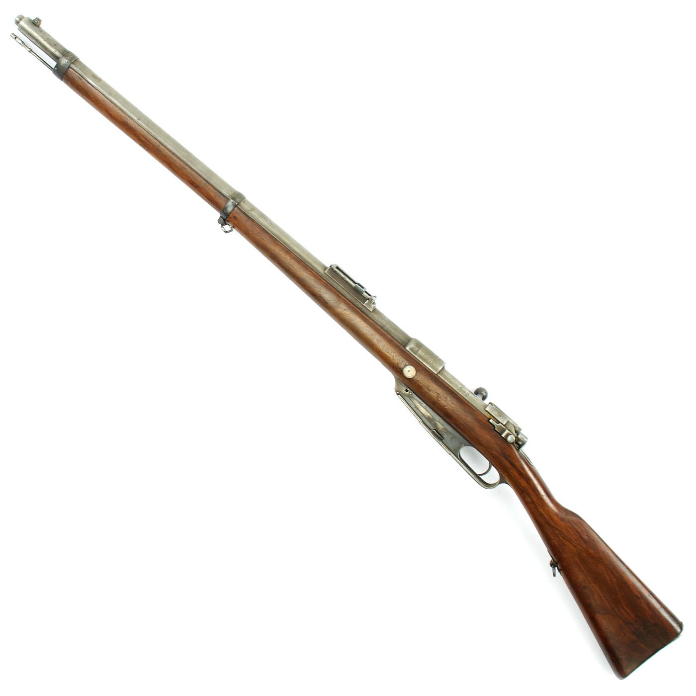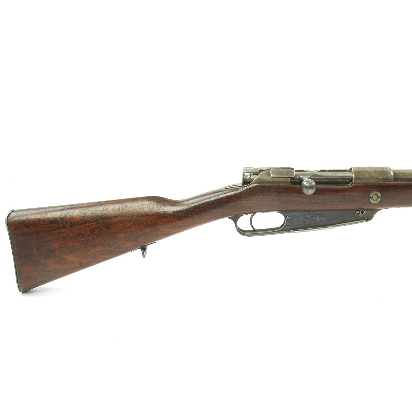 Rifle is in good used condition, with a solid refinished stock and metalwork with a nice gray patina. As the stock has has been sanded and refinished, the proofs are unfortunately worn away. Also the upper but plate screw is missing. It does have wear on the bolt bearing surfaces, however the bore is actually pretty good. It has clear lands and grooves, with a partly bright finish, and light oxidation in the grooves. The rare double-slot cleaning rod is still present, as is the bolt extractor, which is easily lost during cleaning.