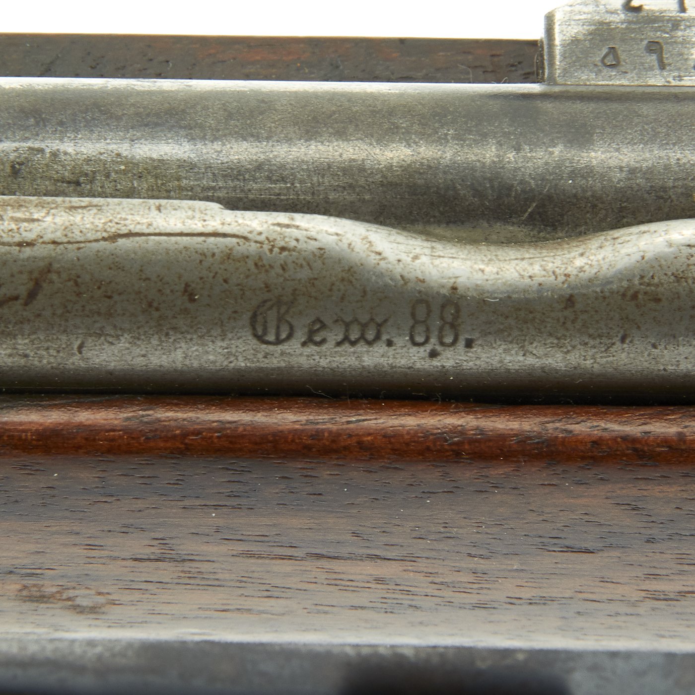 These rifles were originally chambered for 7.92mm Patrone 88 ammunition and had a fixed magazine. As with virtually all Gewehr 88 rifles in service, this example was converted to take the 7.92×57mm Mauser S Patrone, and has an S stamped above the chamber, indicating the conversion. The Spitzer-shaped S Cartridge was ballistically superior to the M/88, however the chamber required modification to accept the thicker walled shell casing. This particular rifle does also has notched plates welded to the rear of the receiver on either side to accept the 1905 pattern stripper clips, making this a Gewehr 88/05 S. It also has the tell tale "notch" cut into the rear of the receiver, as the loaded clip would run into this area.