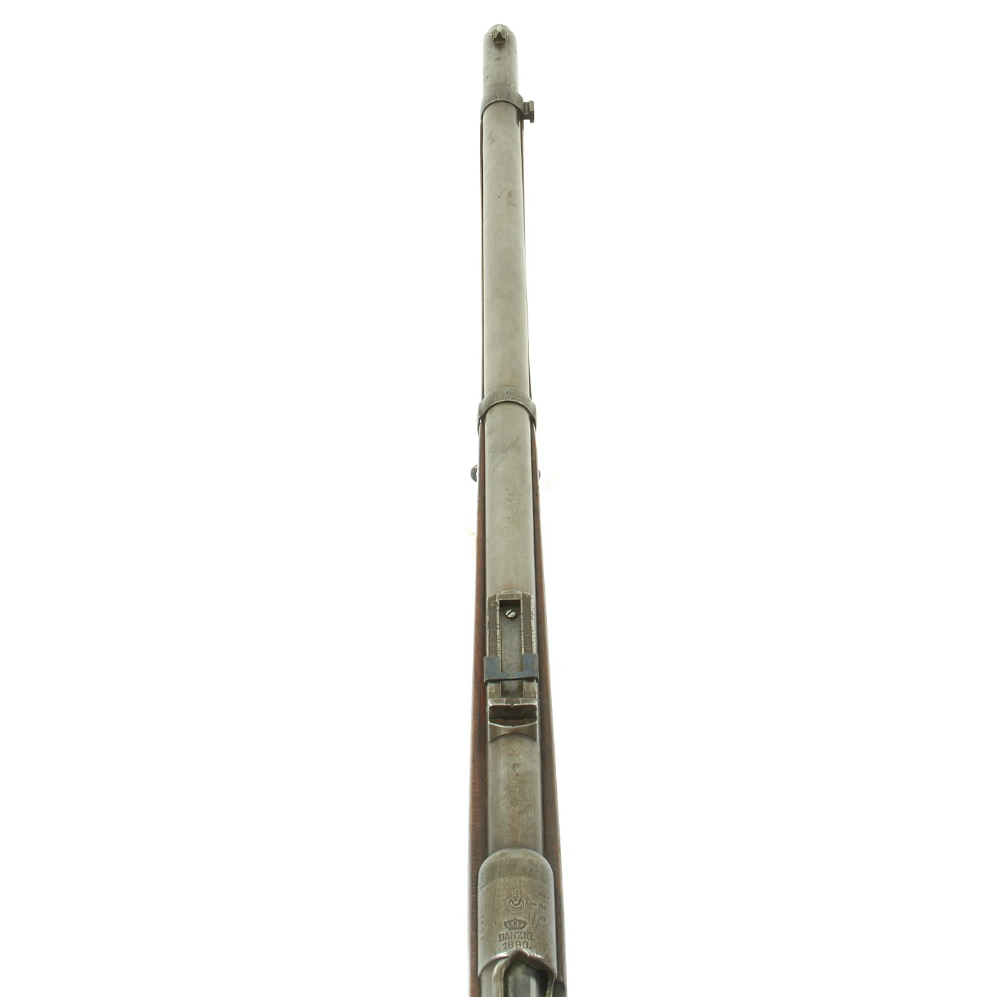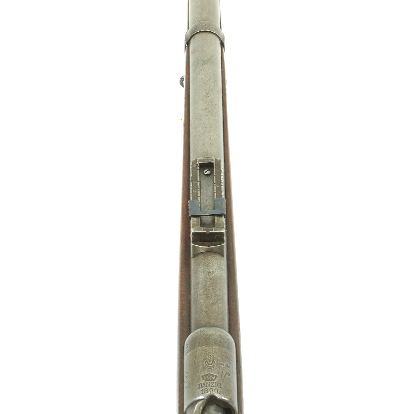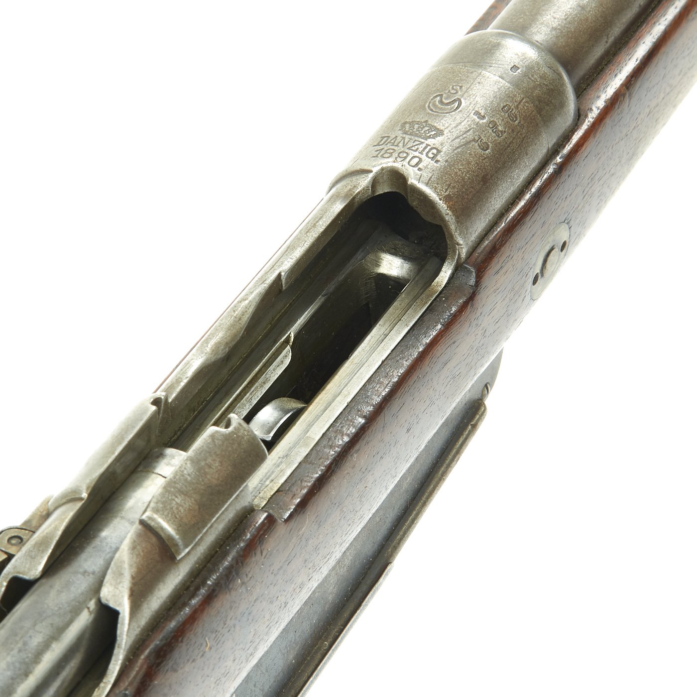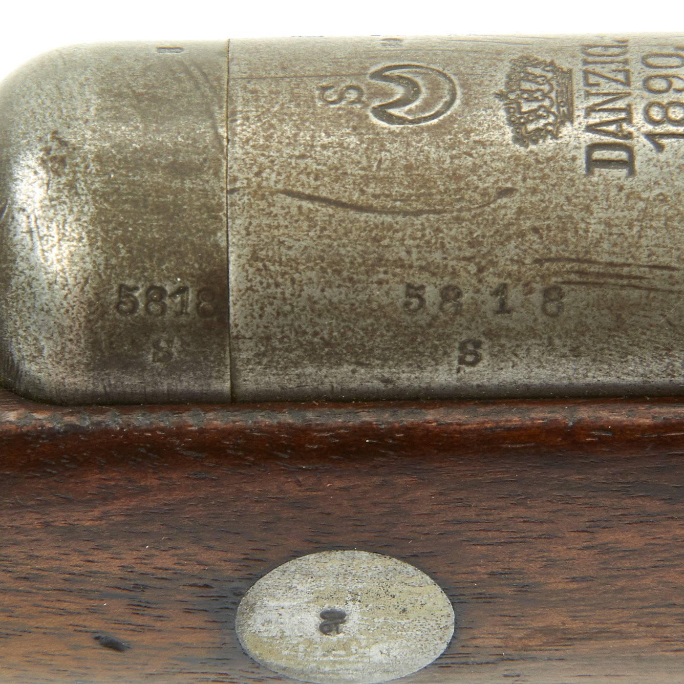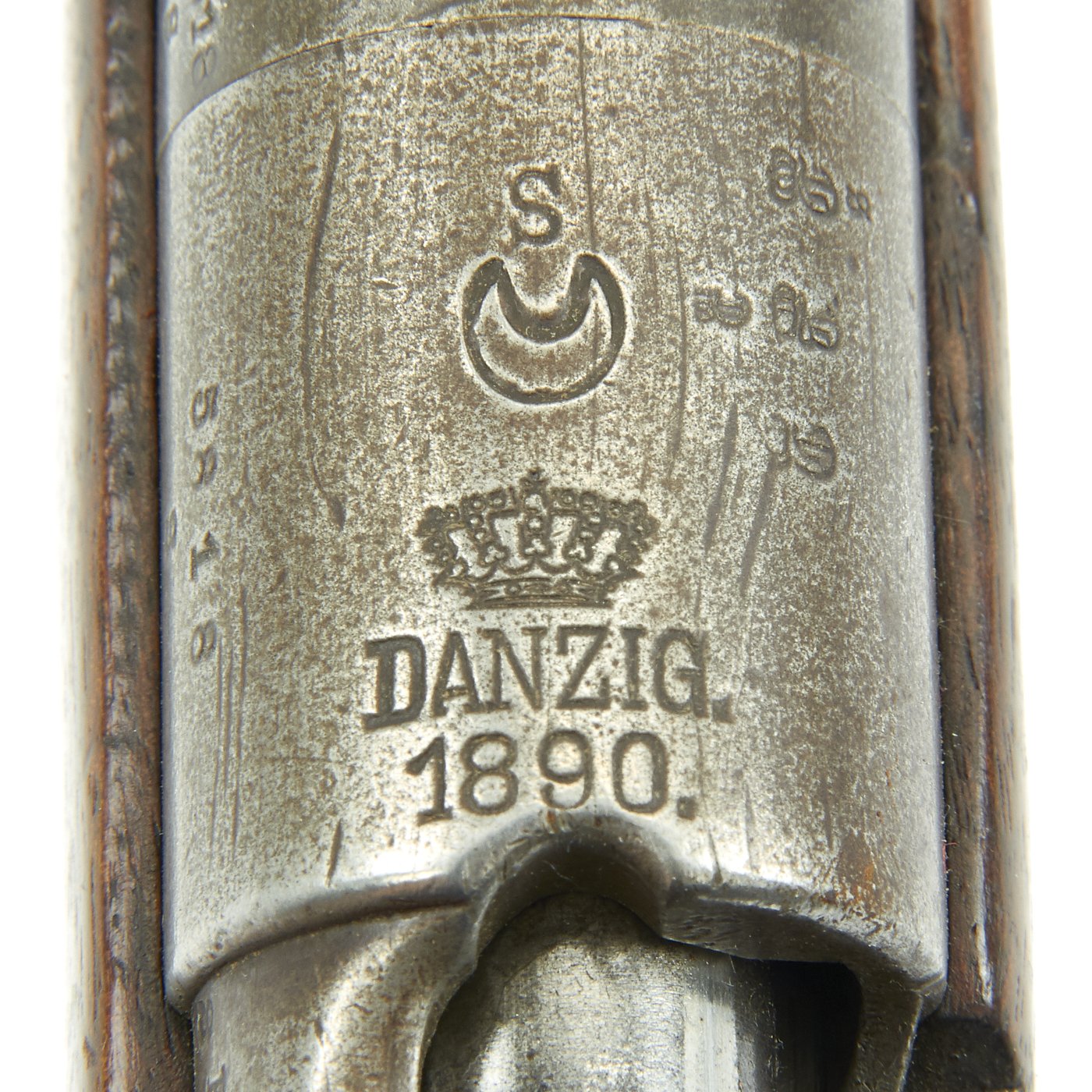 The right side of the receiver is marked Gew. 88 in German blackface type and also has serial number 5818 / S on the barrel and receiver. Over the chamber it is marked (CROWN) / DANZIG / 1890, indicating production at the Imperial Arsenal in Danzig, which is today Gdańsk in Poland. However in addition this rifle was then shipped to Germany's World War One Ally TURKEY, who stamped a CRESCENT MOON above the arsenal mark, and on all of the bolt components.