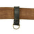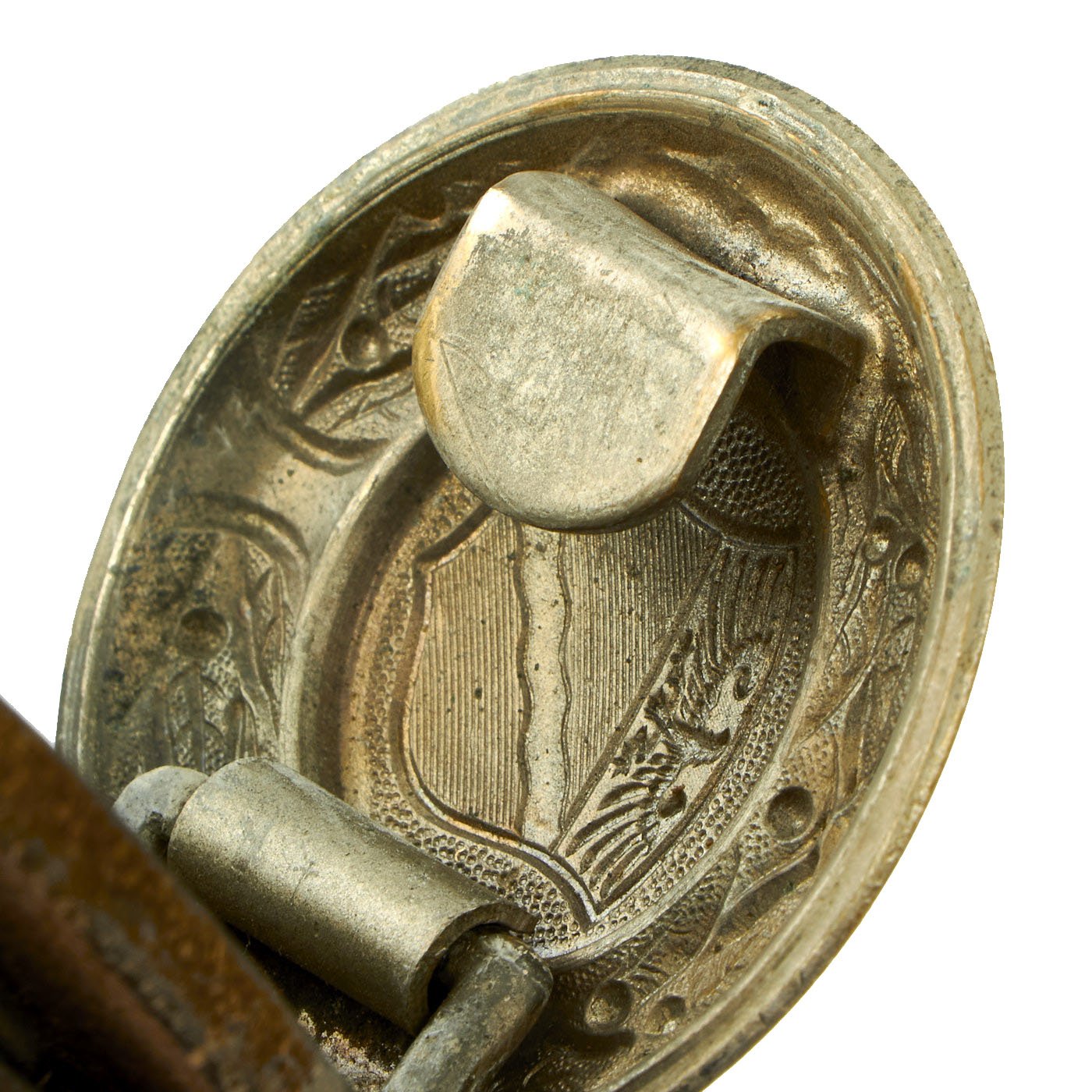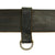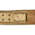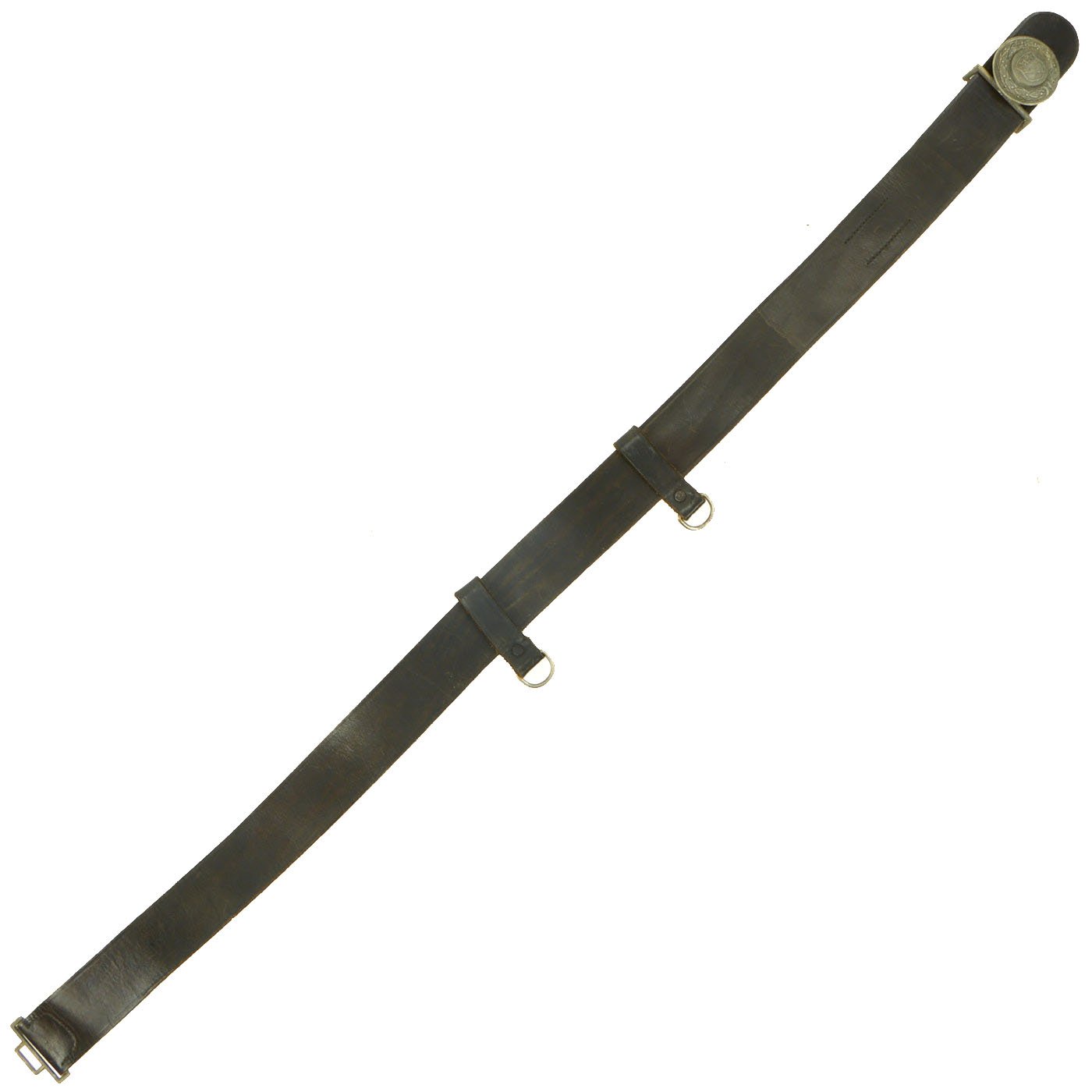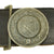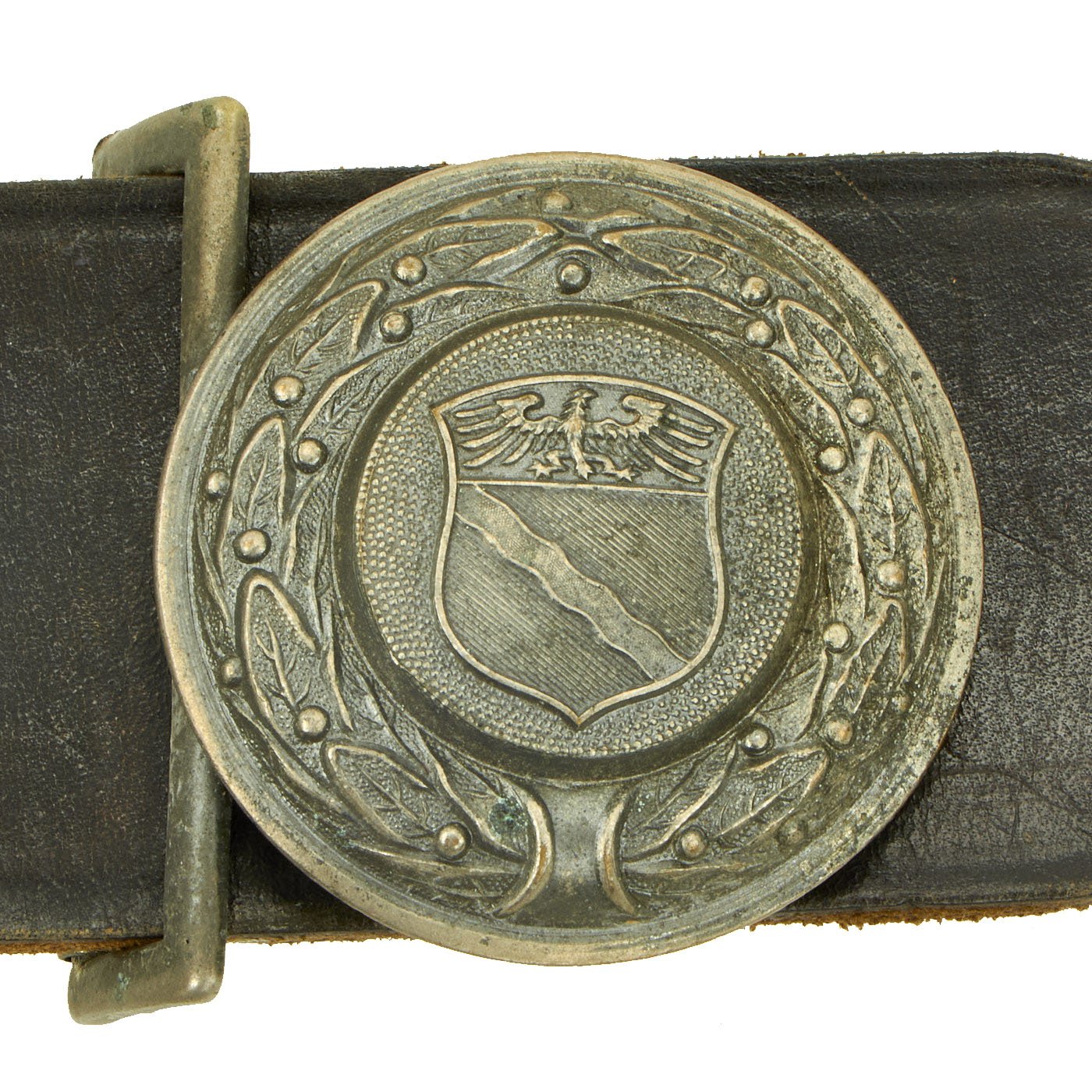 It has a plated bronze buckle on the right end, which has coat of arms of the Rheinland, a shield with a river flowing at a 45 degree angle, surmounted by a spread-winged Weimar Republic eagle. This itself is surrounded by a laurel wreath, and the back of the buckle has a clip for attaching to the end clasp. The belt also features two sliding keepers with metal rings on the bottom, for attaching a sword or dress bayonet, a symbol of authority.