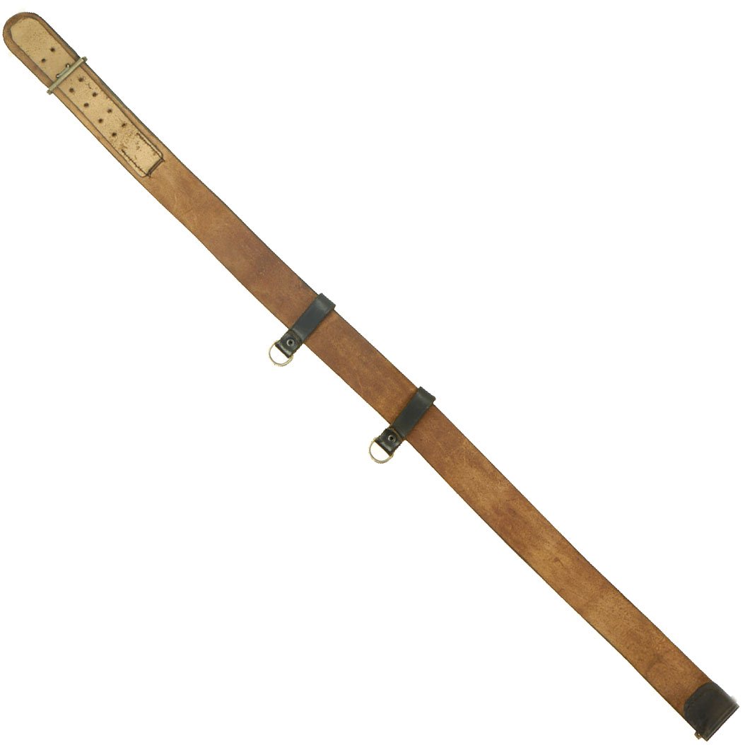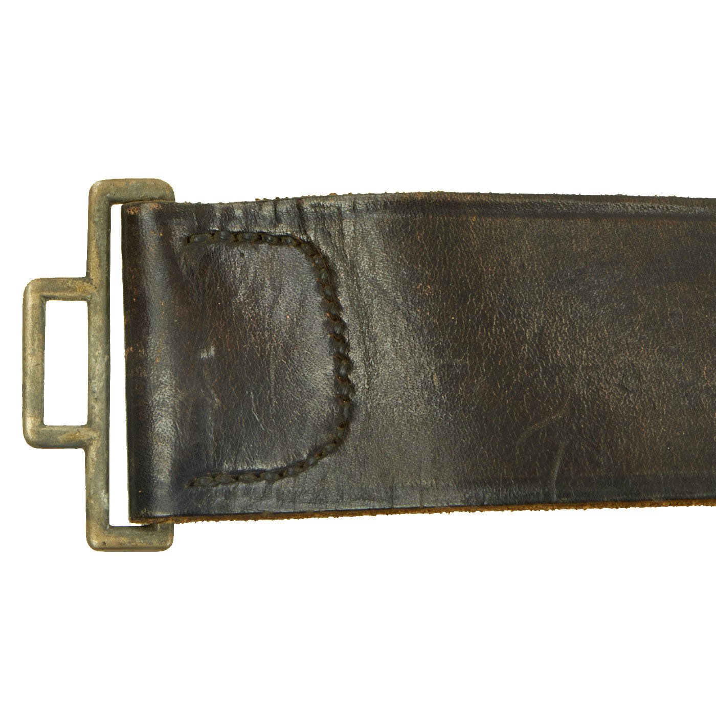 Condition is quite good, with lots of the original plating present on the buckle and clasp, with some brass showing through on the wear points. The belt is in great shape, with minimal wear, and is currently somewhat stiff. The belt does not appear to have seen much use at all, though it does have some cracking in the finish due to age.