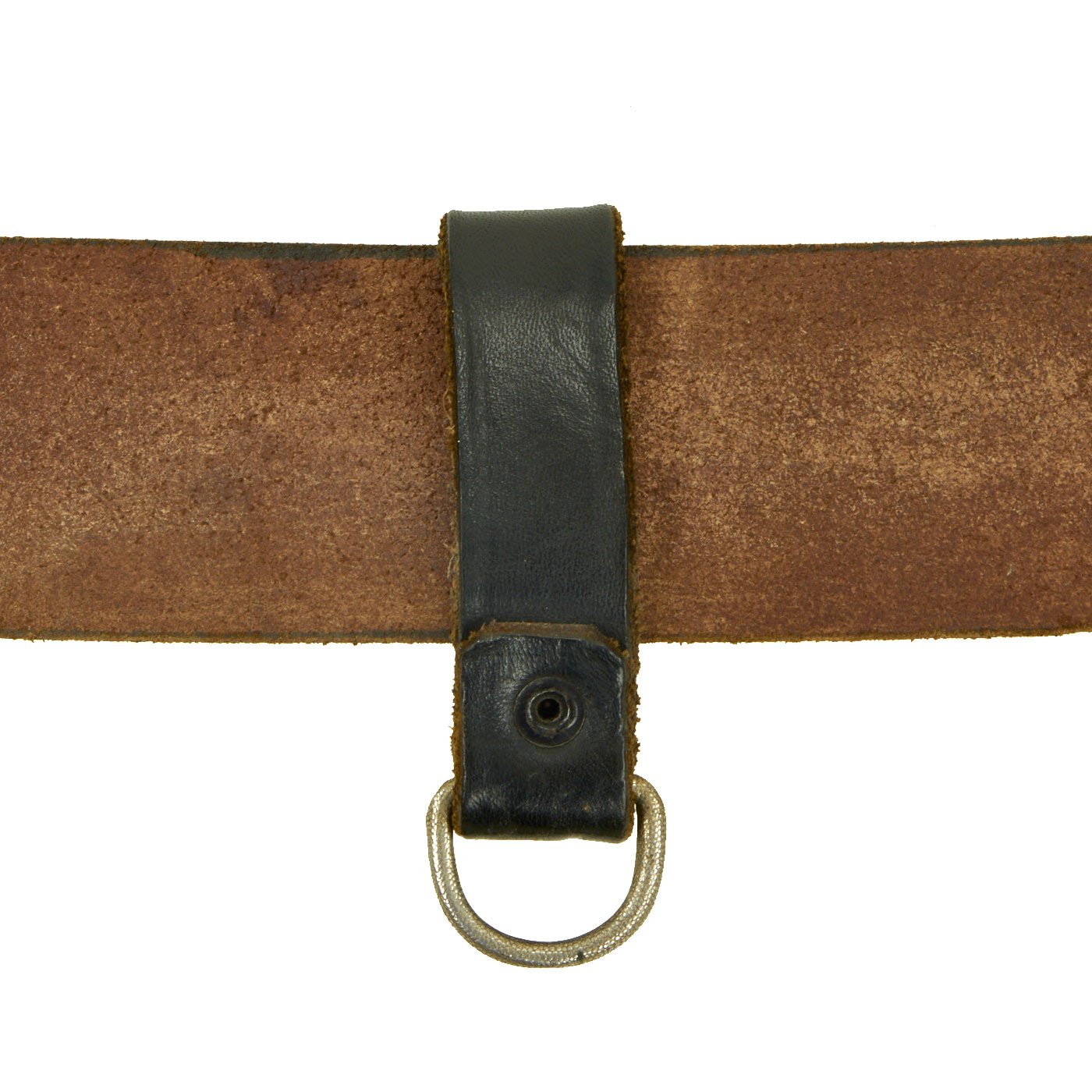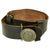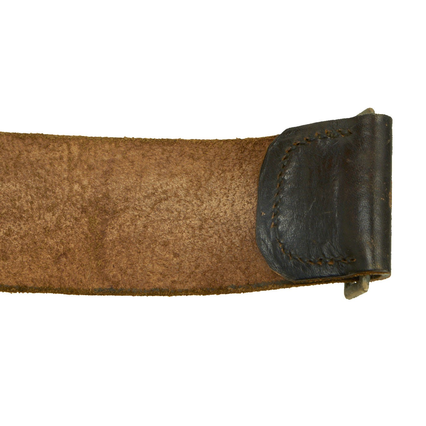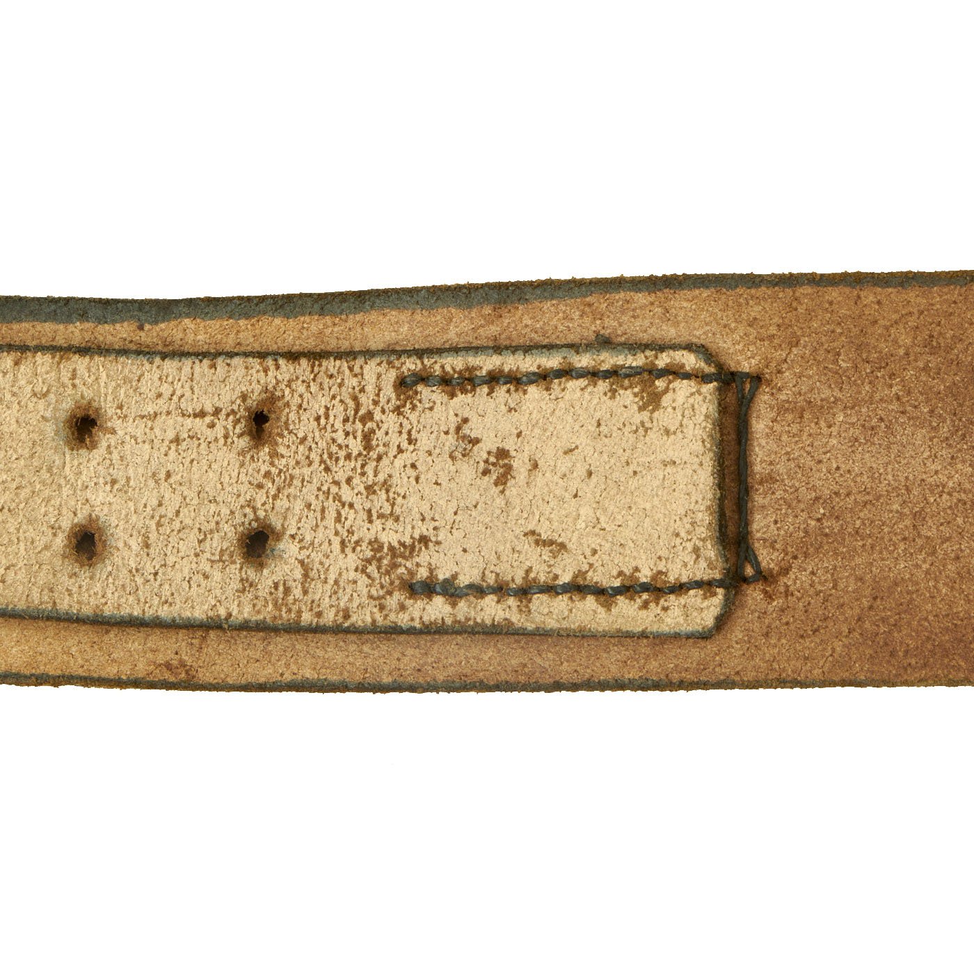 The belt is fabricated from a thick leather, smooth dark brown upper, raw underside with the typical long leather tab with two rows of holes, which allow the pronged end clasp to adjust the length of the belt. Overall this belt is about 38-39 inches long when let out all the way.