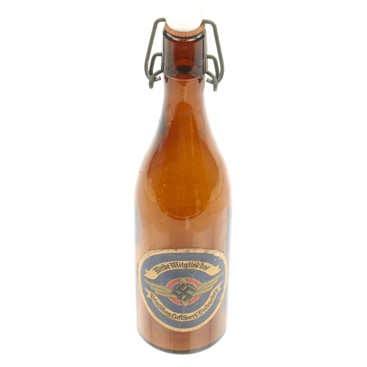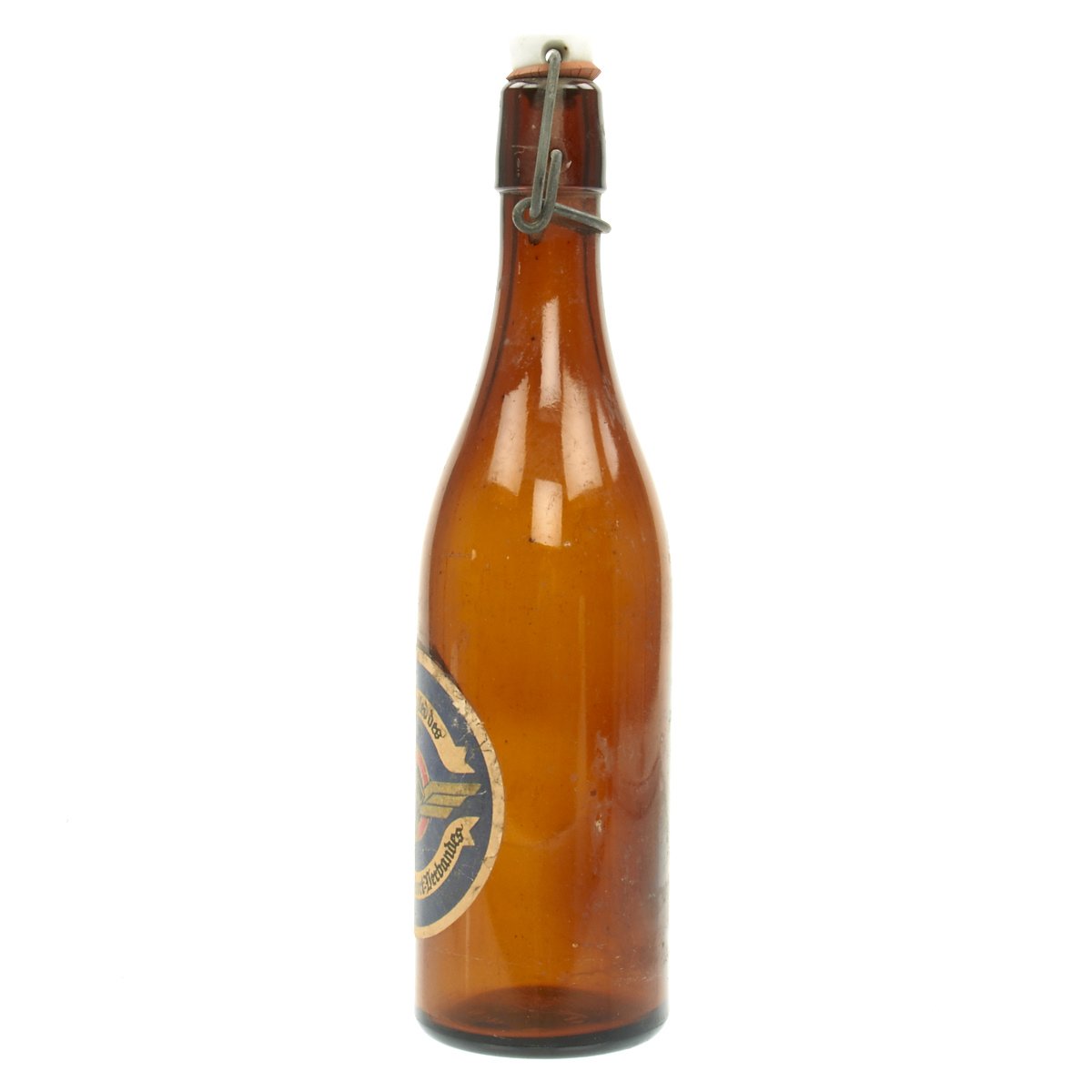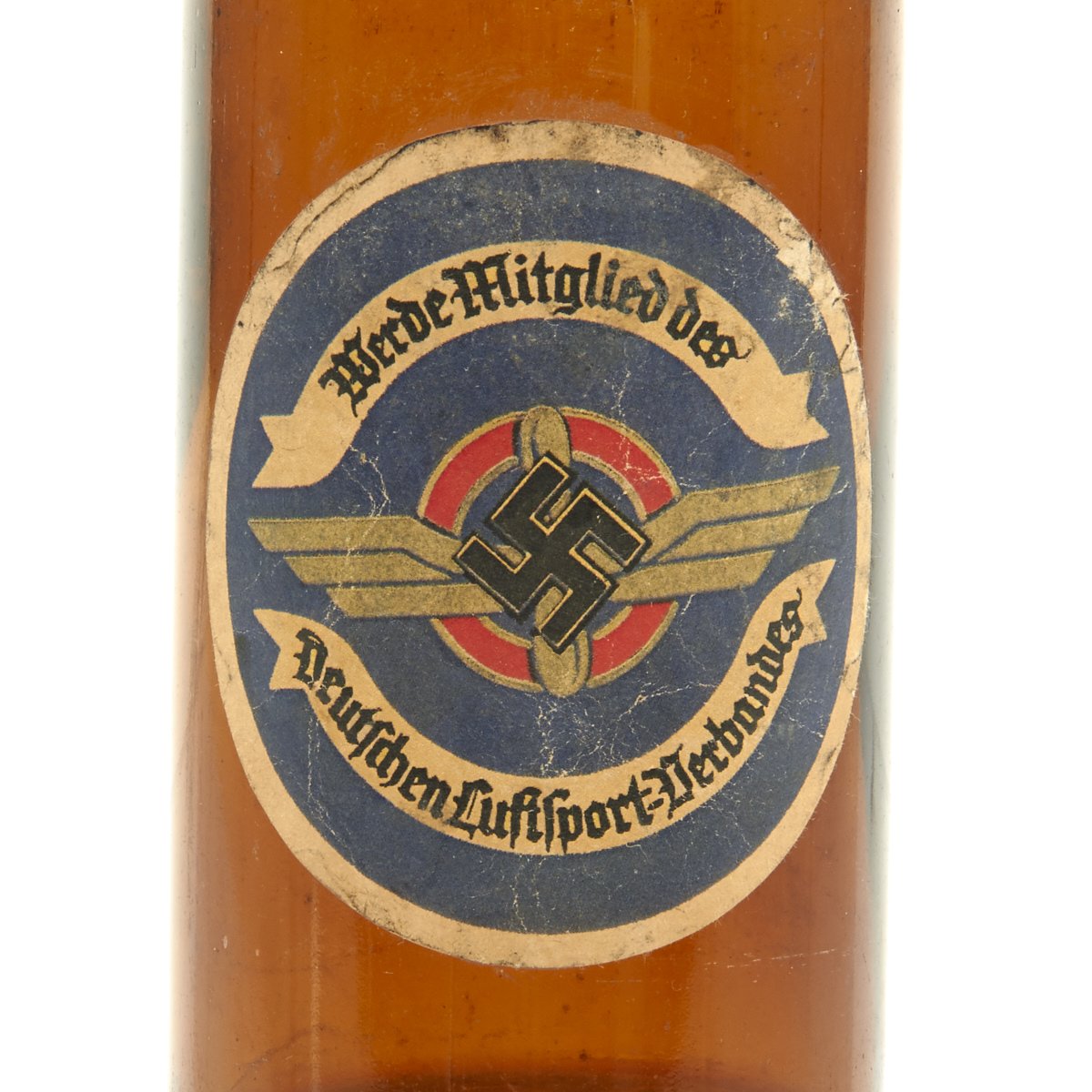 These bottles are made from brown glass with various markings cast into the bottom of the glass. Offered in fine condition just a bit soiled from 75 years storage in a basement in Bremen on the North Sea not too far from Hamburg. This was a promotional item used to generate interest in the flying club, which was actually a front for Luftwaffe recruitment.