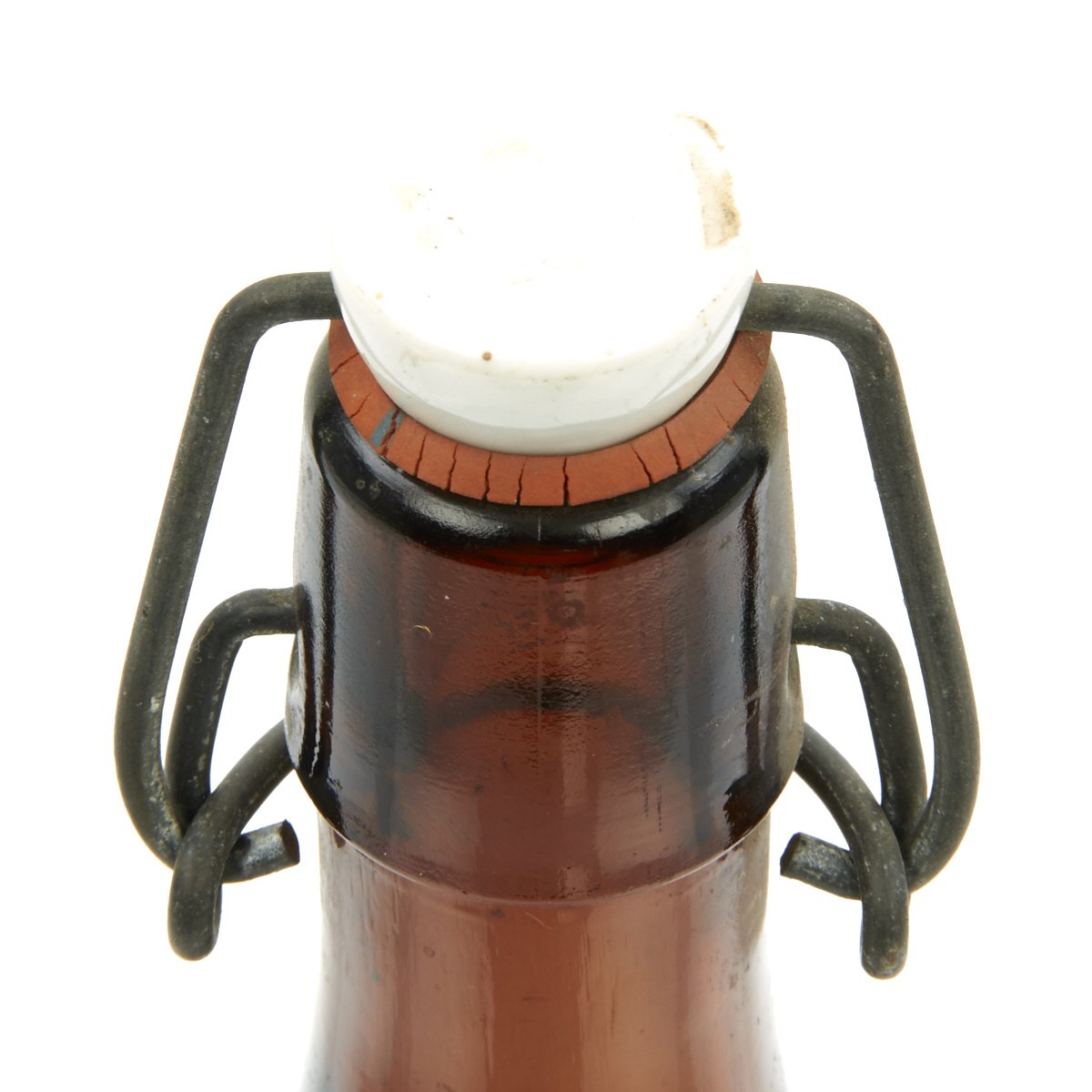 Original items: Very Few Available. We got a few of these identical WW2 German Beer bottles, all complete with wired on porcelain flip-top and original swas marked paper label. Some even still have the original rubber sealing washer, though it will have cracks from age. The labels are all legible and marked in black letter typeface: