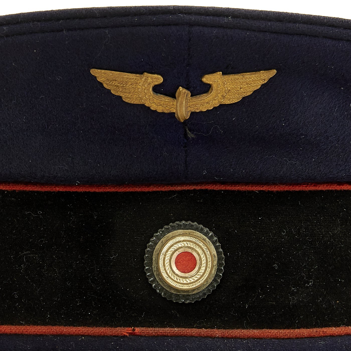 The cap is of Dark blue wool construction is clean and shows moderate use. It features a nice velvet cap band, with a standard Tri-Color medal cockade with red felt center and a brass "Wings through a Train Wheel" insignia. This was the emblem of the Early Reichsbahn, before it was "NSDAPfied" and replaced with the standard NSDAP Reichsadler, while the DRB logo was moved lower on the cap.
