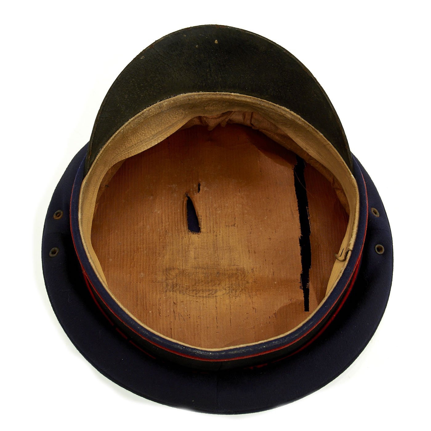 The leather visor/peak of the cap is in good condition, though it does have some cracks in the leather finish. Interior is very clean with a faced makers mark on the crown. The sweatband is leather, with light wear and a nice finish. It is stamped with a size 56 marking. This pattern does not have any chin strap, and never had one installed.