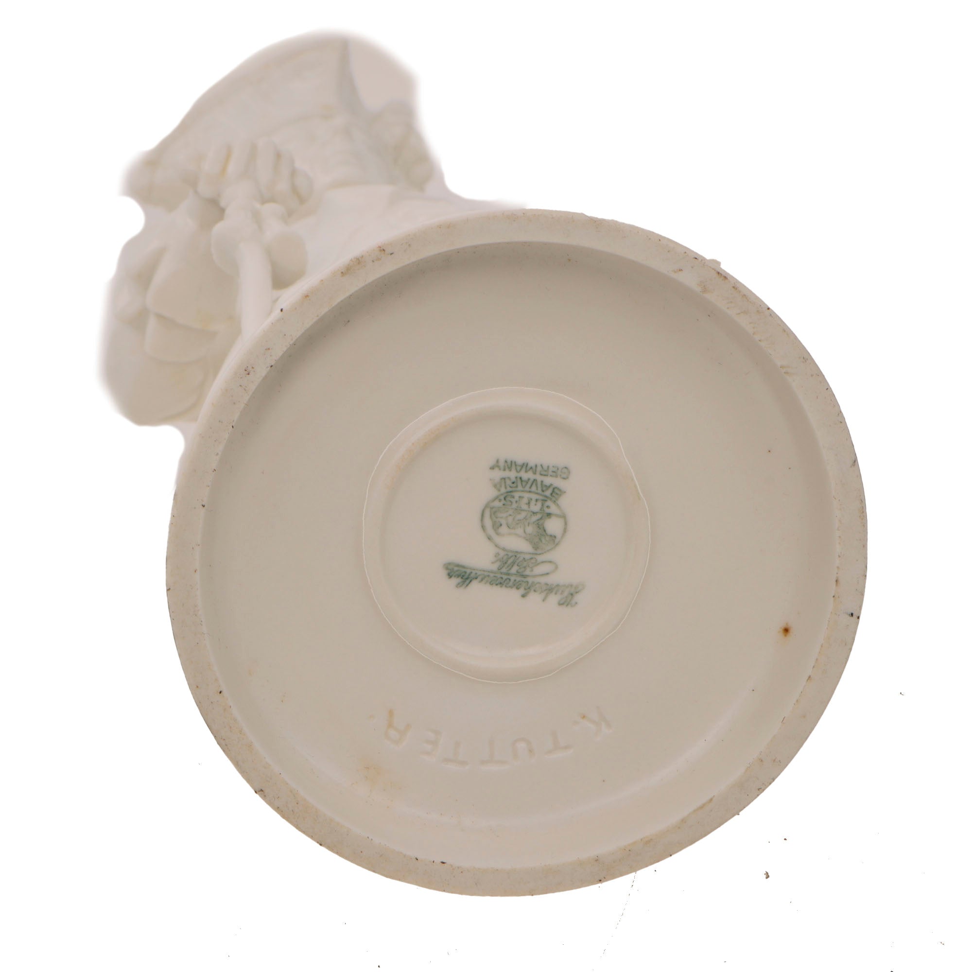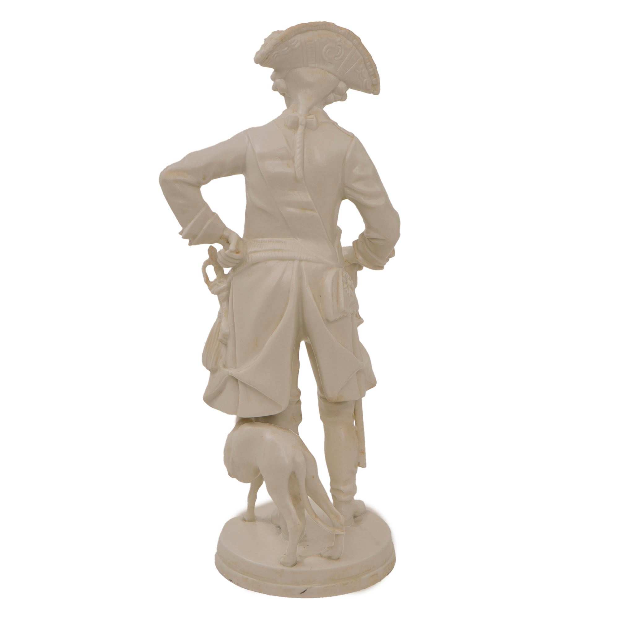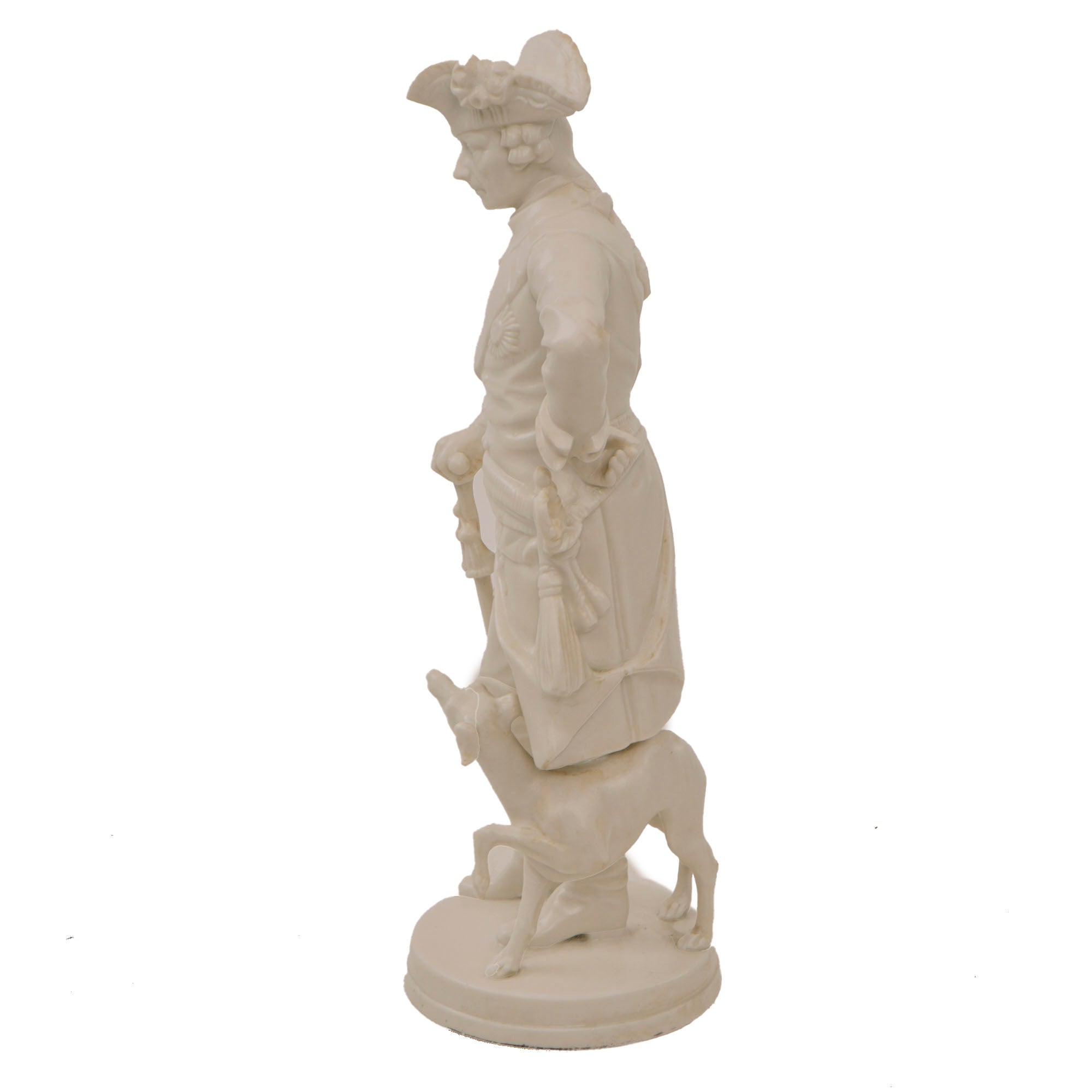This is a lovely porcelain statue of Frederick the Great, measuring roughly 11” with a base measuring roughly 3 3/4” in diameter. The statue depicts Frederick with his dog, but the bottom portion of his cane is broken away and gone. The bottom of the base is inscribed T. KUTTER over the maker mark for Hutschenreuther of Selb, Bavaria.