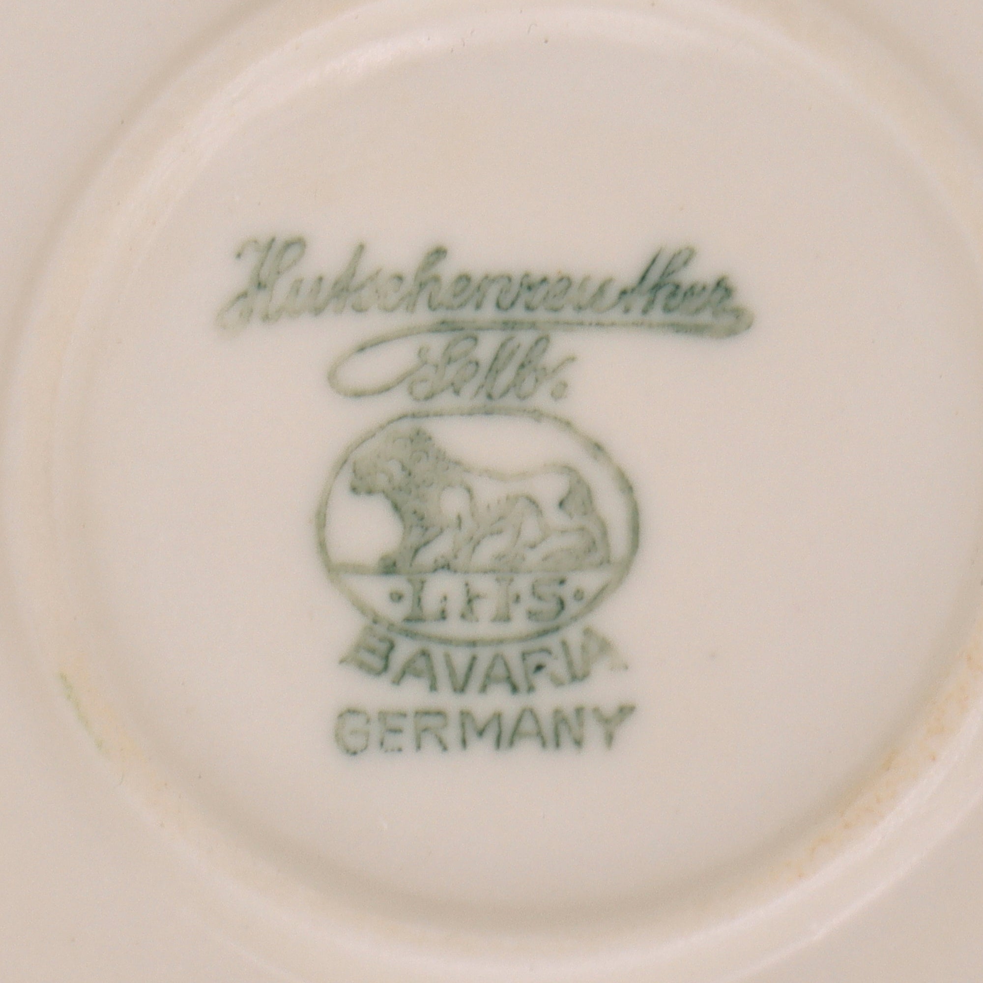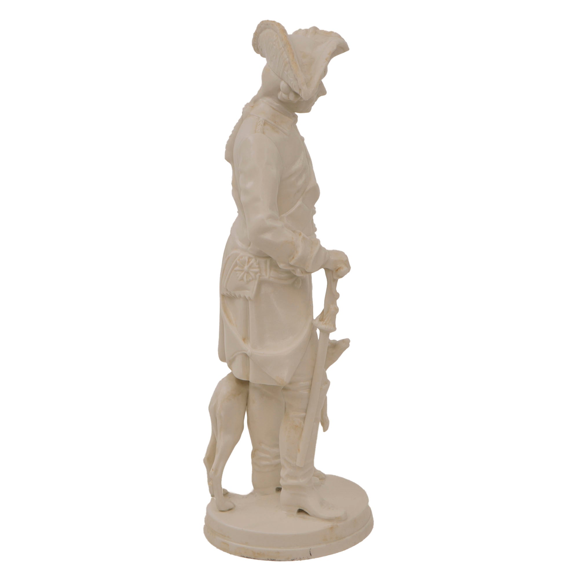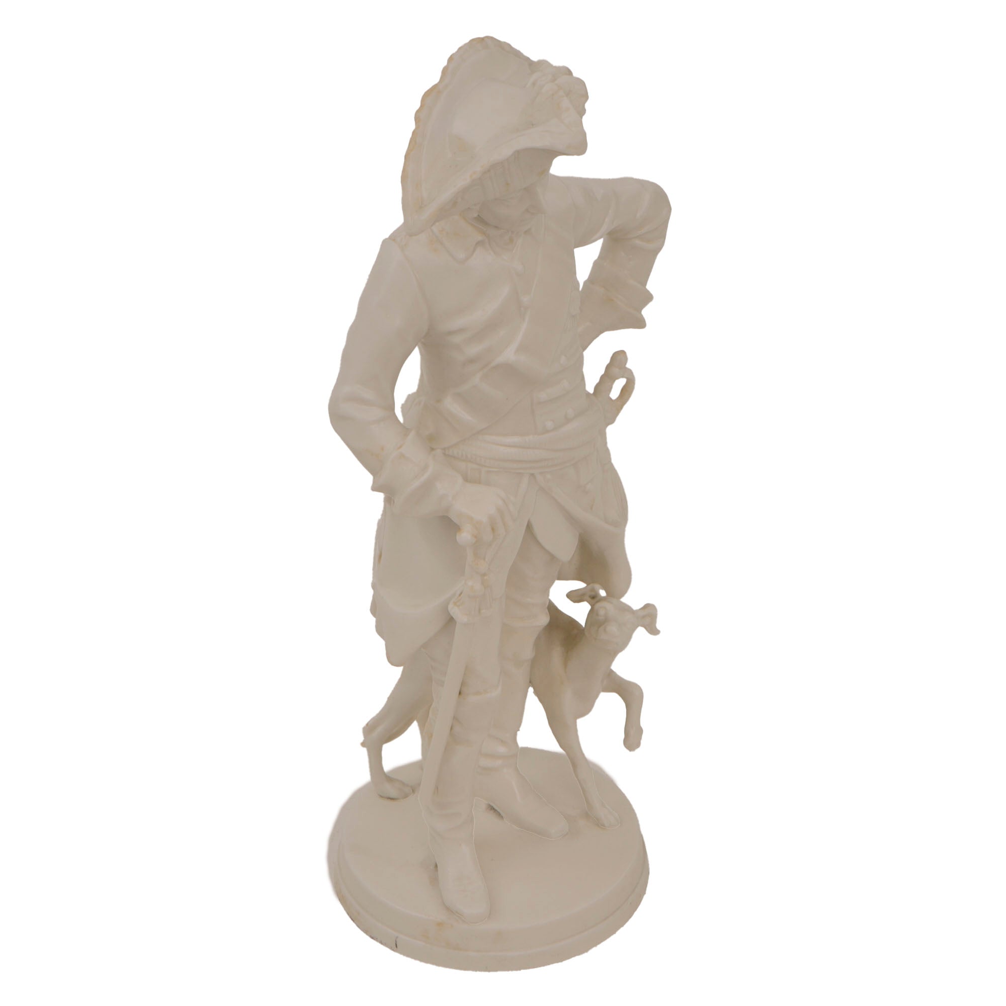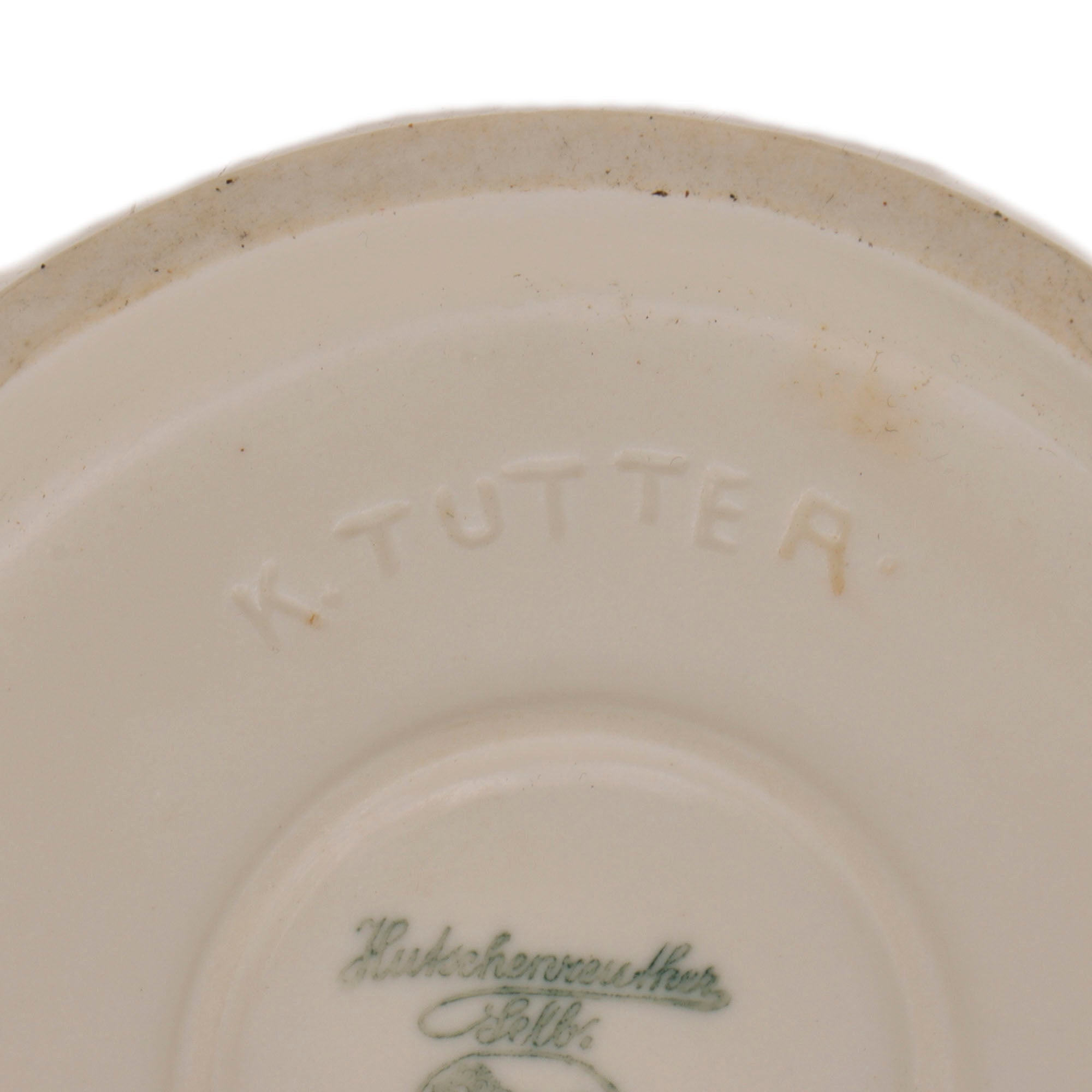 This is a lovely porcelain statue of Frederick the Great, measuring roughly 11” with a base measuring roughly 3 3/4” in diameter. The statue depicts Frederick with his dog, but the bottom portion of his cane is broken away and gone. The bottom of the base is inscribed T. KUTTER over the maker mark for Hutschenreuther of Selb, Bavaria.