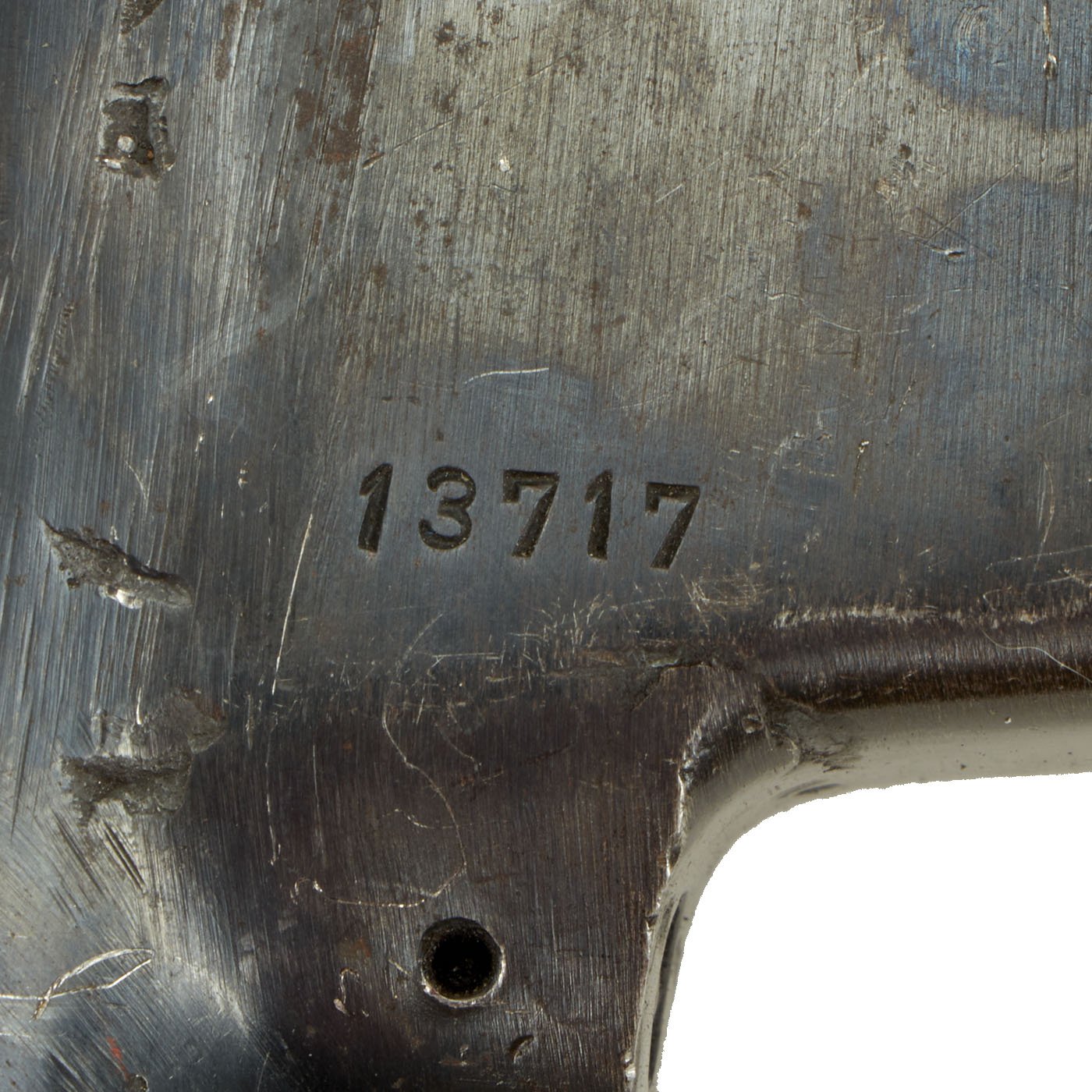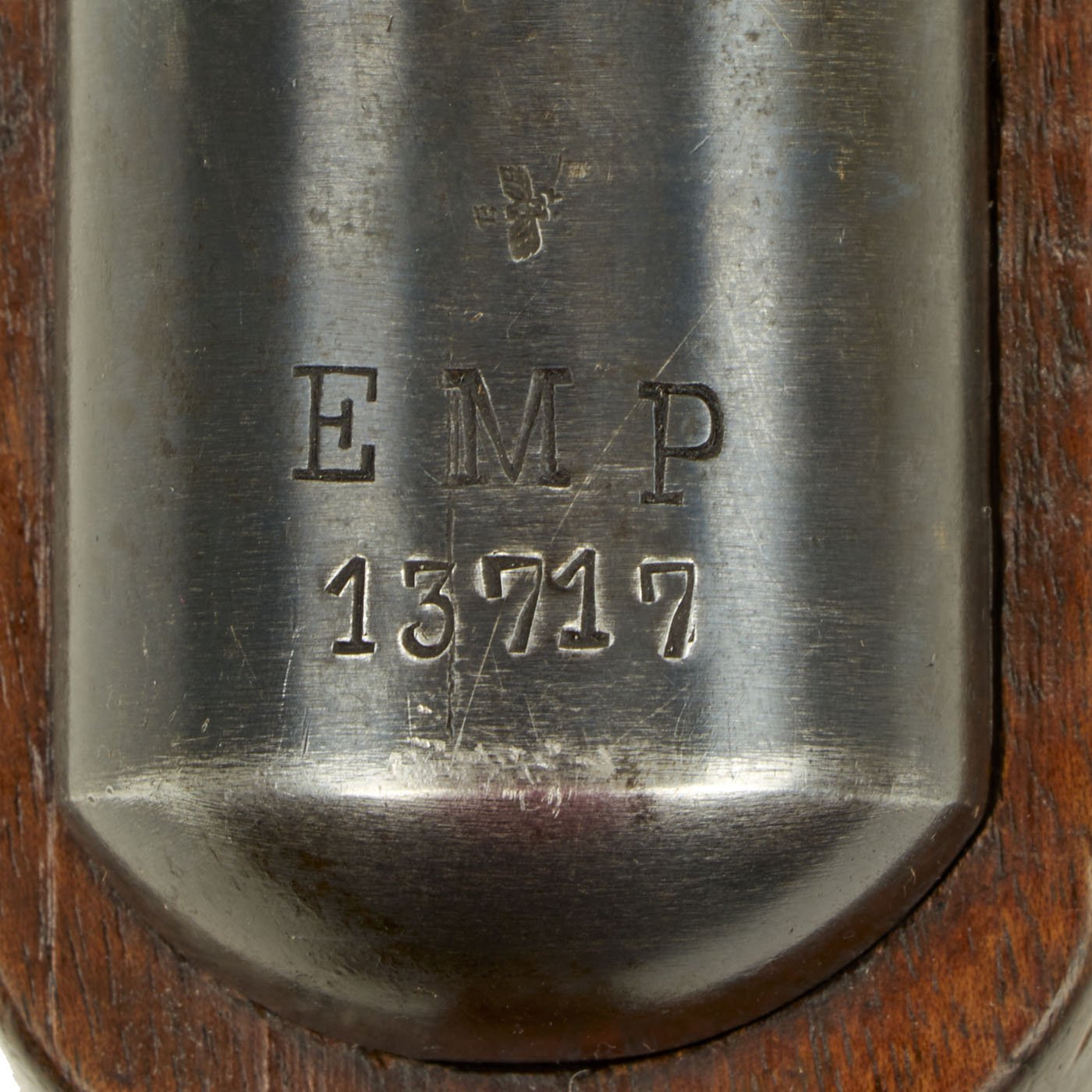 The rear receiver cup is marked E M P over serial number 13717, which is also present on the bottom of the magazine well and the bottom of the barrel jacket. This number was also present on the bolt, now welded into the receiver, so this was most likely an all matching example before deactivation.