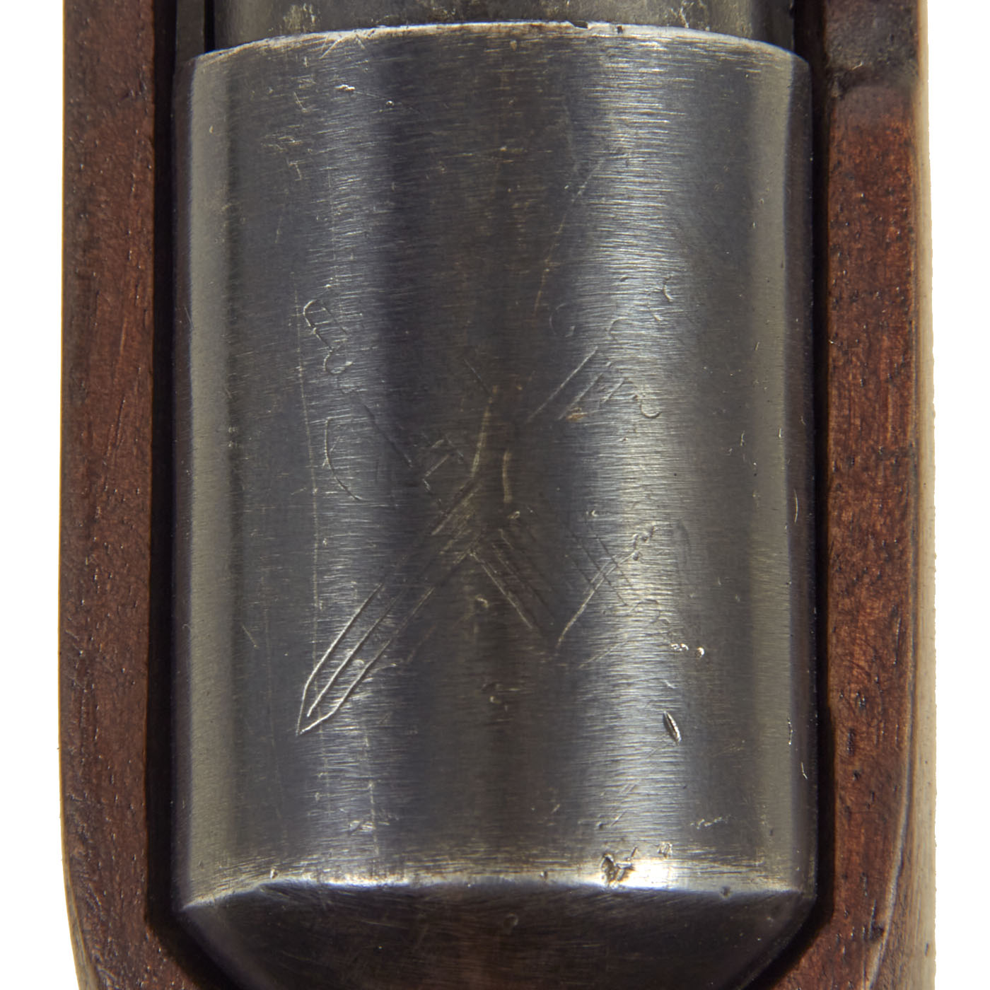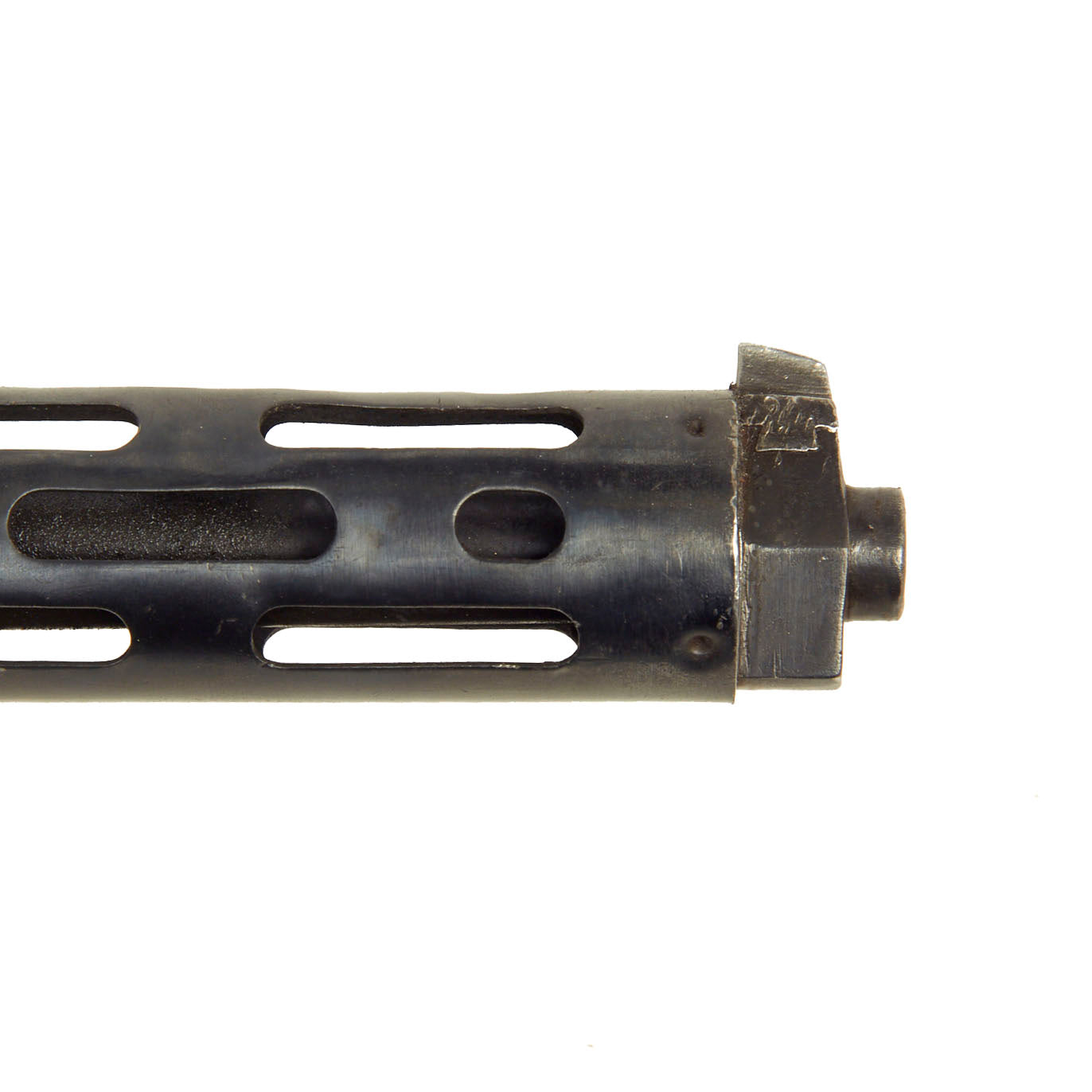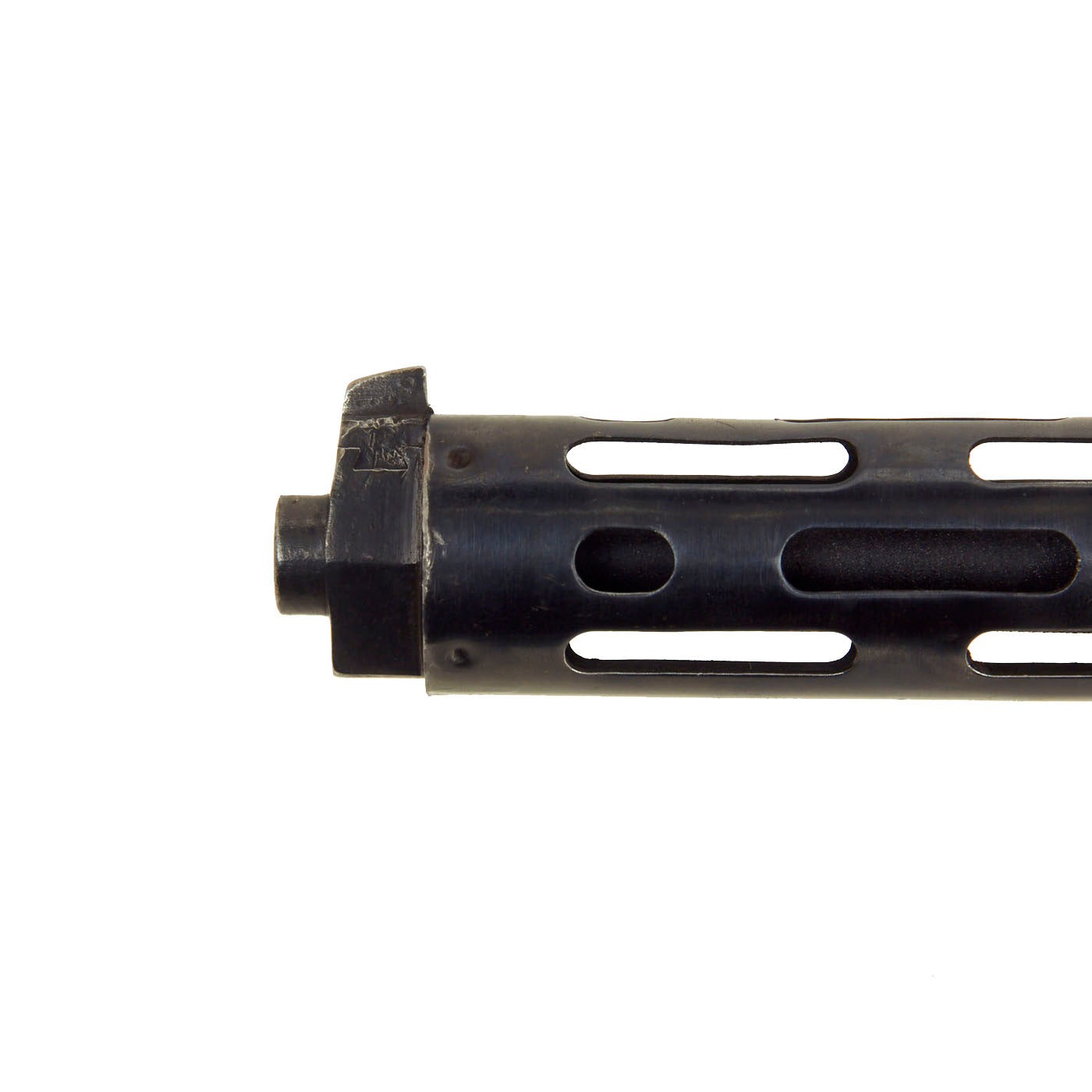 This is a very nice example of the ERMA EMP (Erma Maschinenenpistole) designed and manufactured by Erfurter Maschinenfabrik (Erfurt Machine Factory or ERMA), usually simply called ERMA Werke. The magazine well is marked with serial number D-2782, over a CAL.9.L. marking, indicating chambering in 9mm Largo, the standard round used for guns supplied to Spain. Both the magazine and the end cup of the receiver are marked faintly with a crossed Sword and Fasces, the insignia of the Spanish Guardia Civil (Civil Guard). We do not know when these markings were added, but we assume during the Francoist era, when the Civil Guard was utilized extensively.