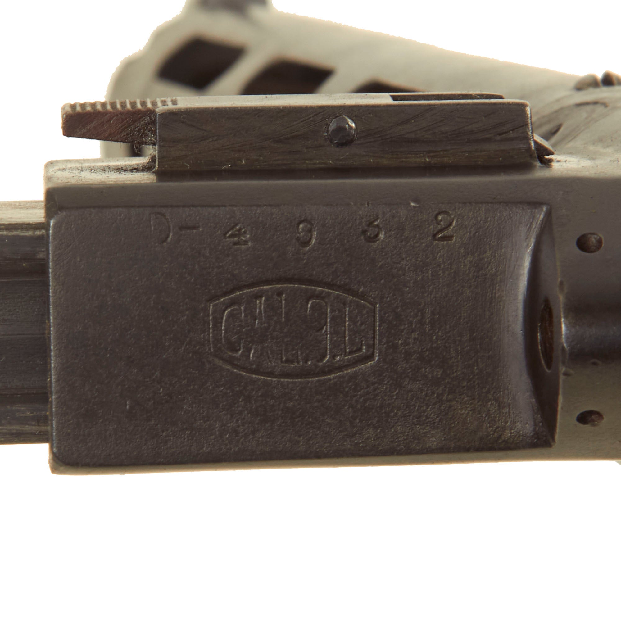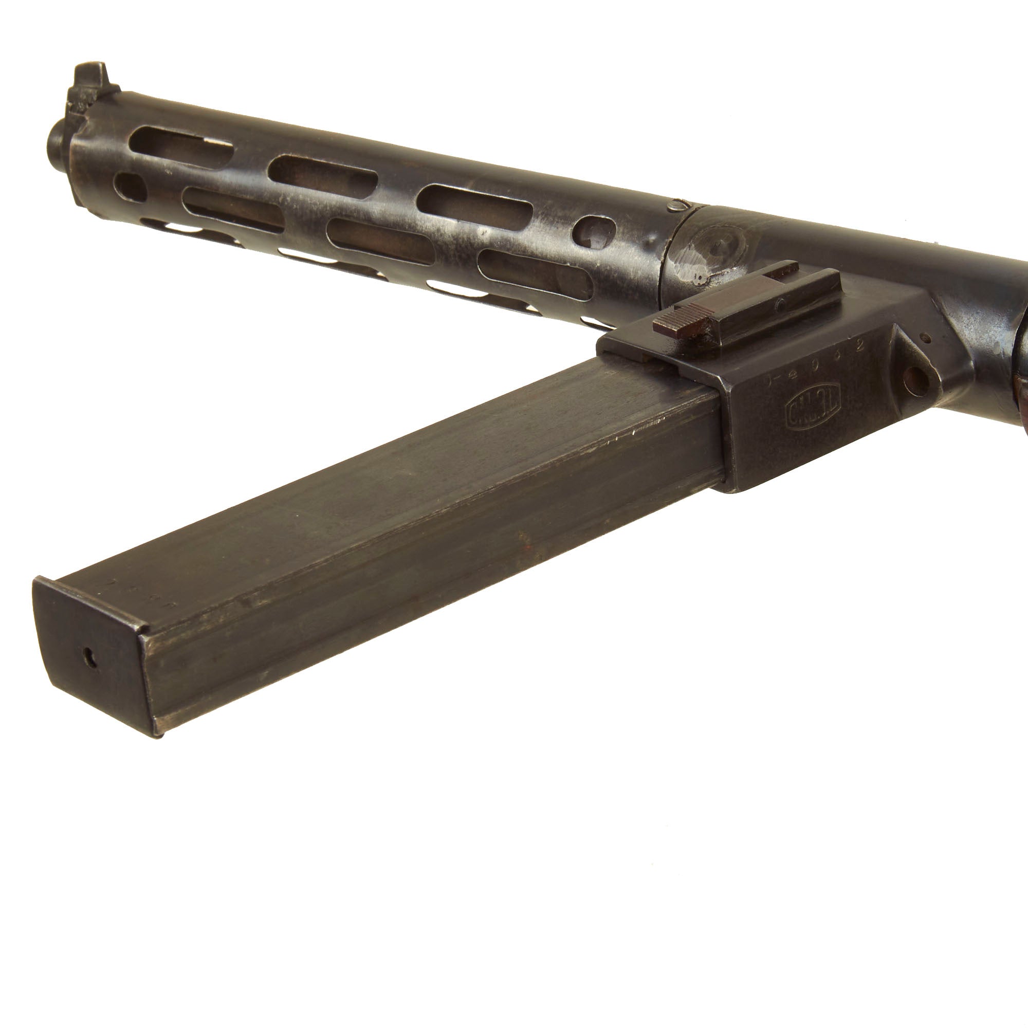 This is a very nice example of the ERMA EMP (Erma Maschinenenpistole) designed and manufactured by Erfurter Maschinenfabrik (Erfurt Machine Factory or ERMA), usually simply called ERMA Werke. The magazine well is marked with serial number D - 4932, over a CAL.9.L. marking, indicating chambering in 9mm Largo, the standard round used for guns supplied to Spain. It comes with an original magazine, marked with 2680 as well as the crossed Sword and Fasces, the insignia of the Spanish Guardia Civil (Civil Guard). We do not know when these markings were added, but we assume during the Francoist era, when the Civil Guard was utilized extensively. Please note that the magazine will not lock in place due to the steel portions inserted into the receiver.