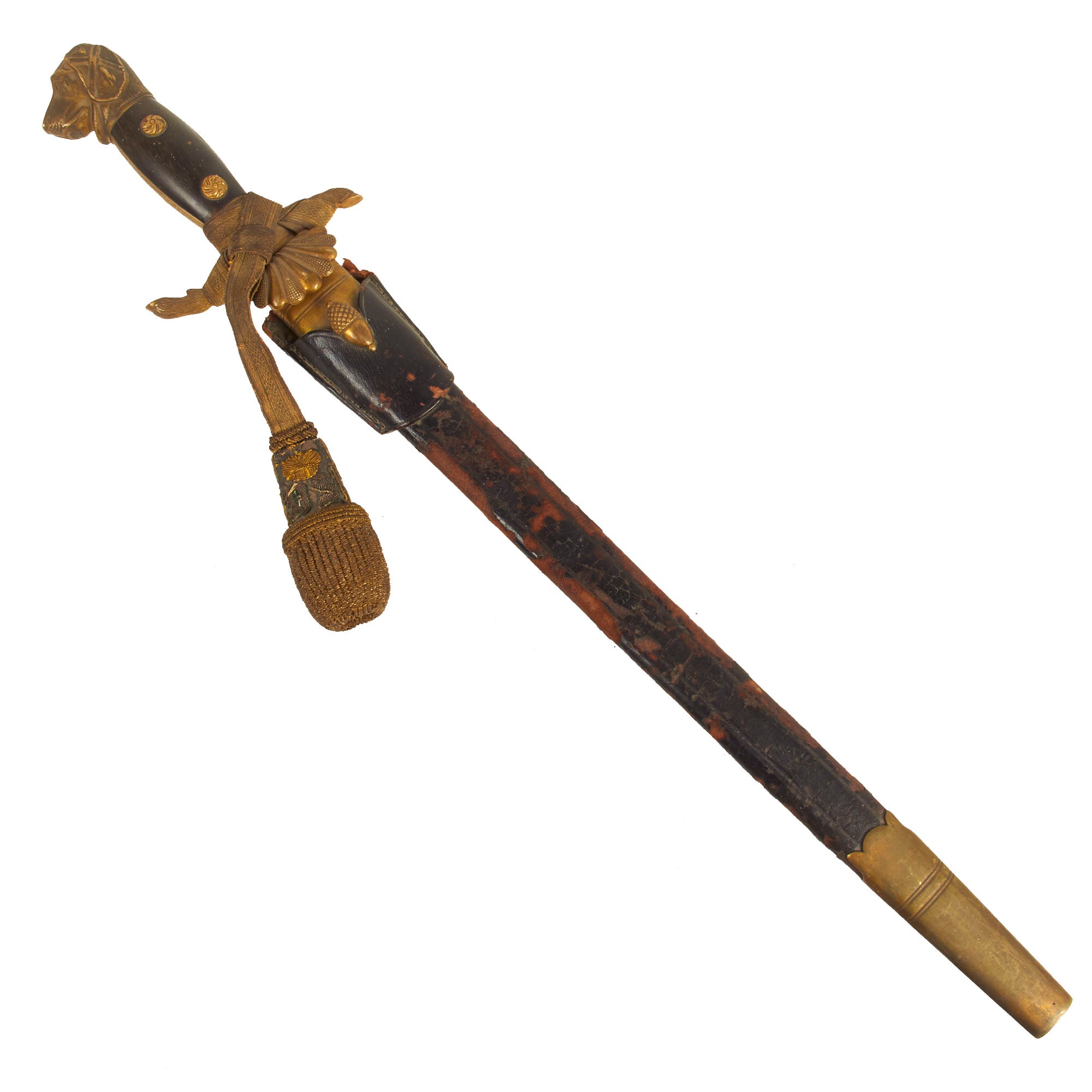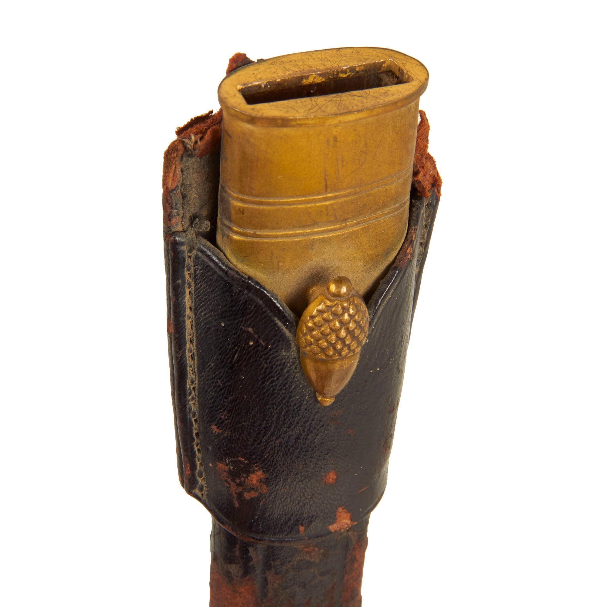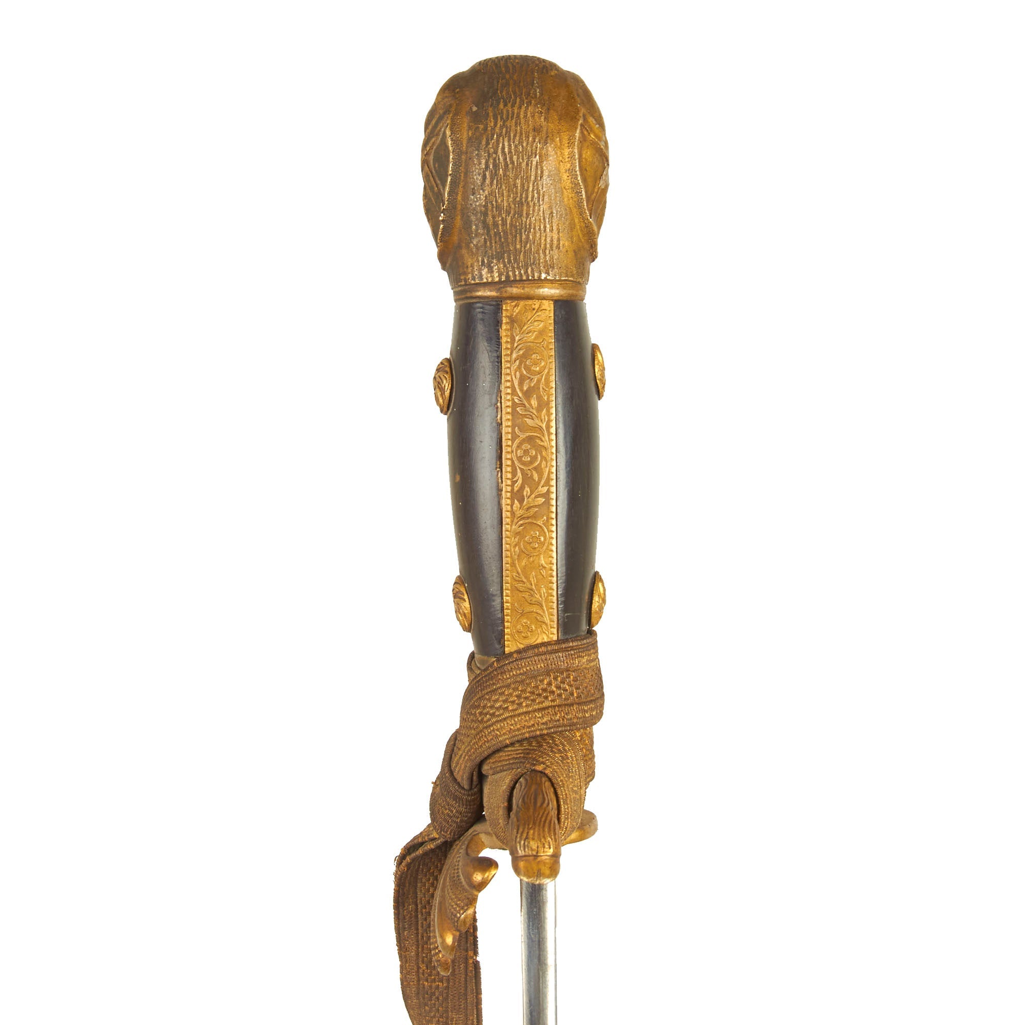 The leather scabbard is fitted with gilt brass, with an acorn frog button, as often seen. The leather is in good shape, though it does show some bending and scrapes in the finish. The gilding is very well retained, and it just looks great!