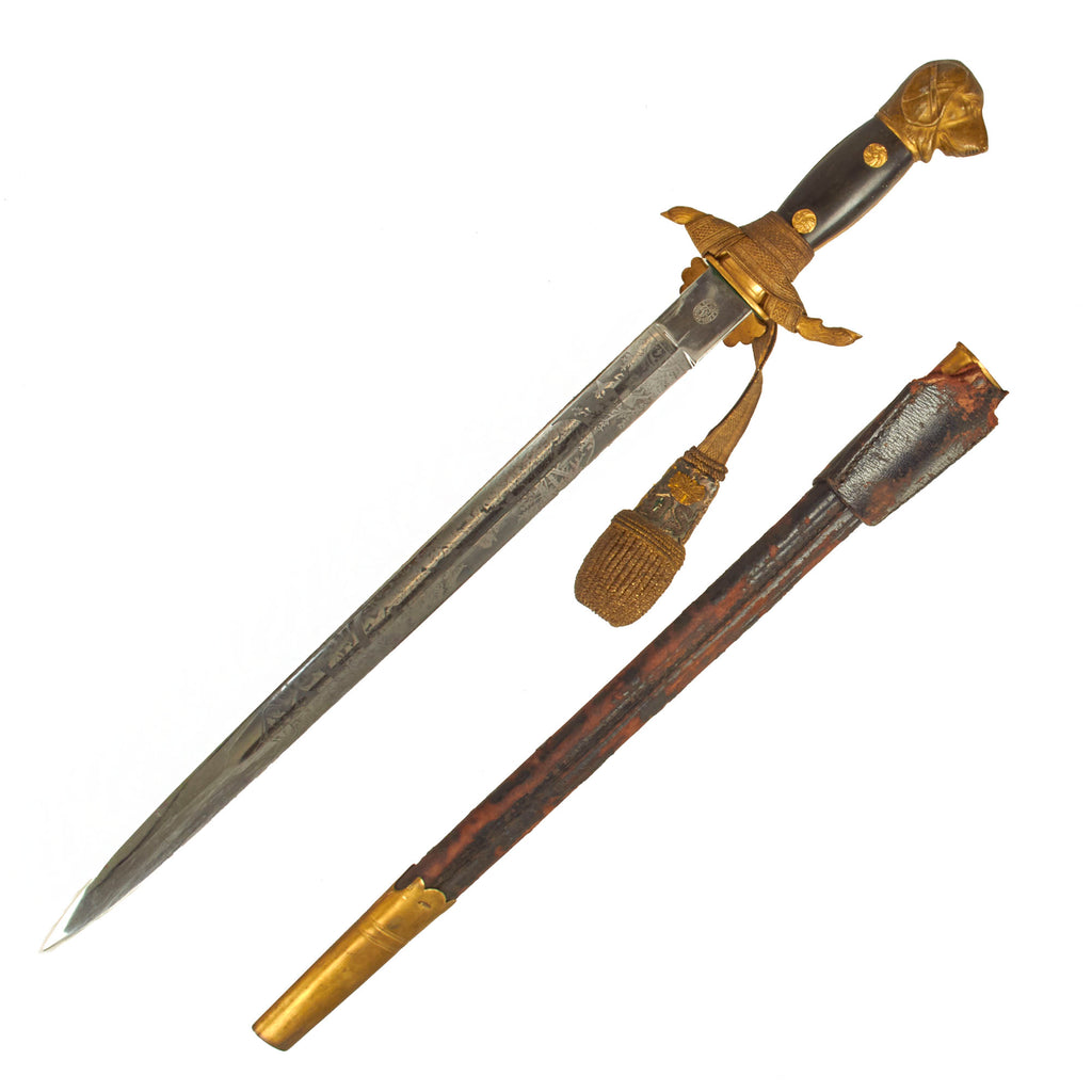 This is a fantastic pre WWII Era German Hirschfänger Stag Handled Long Shooting Cutlass by the legendary firm of Carl Eickhorn, complete with scabbard. The hilt is fitted with gilt brass, much of which is retained, with a straight wood grip. This is fitted with two brass ornaments on each side, which are loose and can fall out. The "S" shaped crossguard with opposed Deer's hoof finials that were hand enhanced. There is also a beautiful scallop shell guard on one side, much like those seen on earlier "hunting sword pistols", which in this case actually looks quite like an actual scallop.