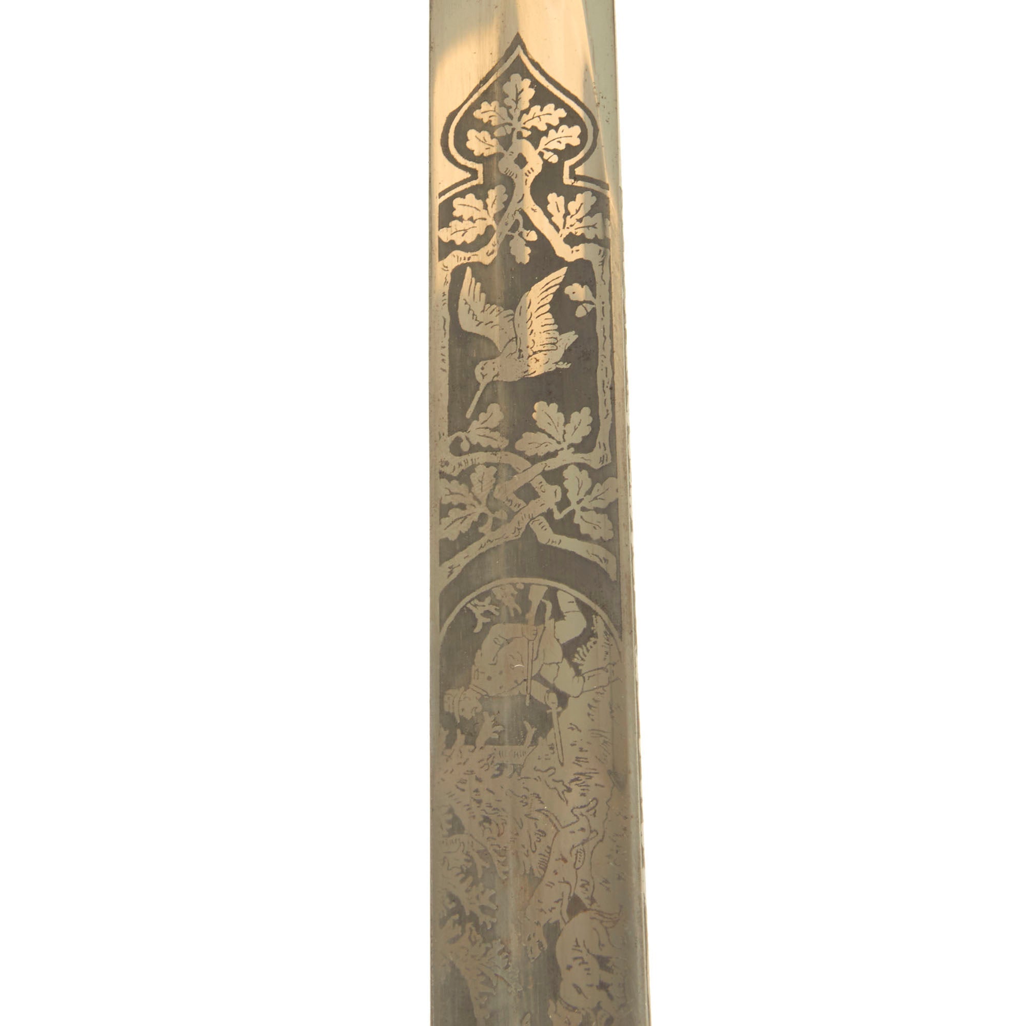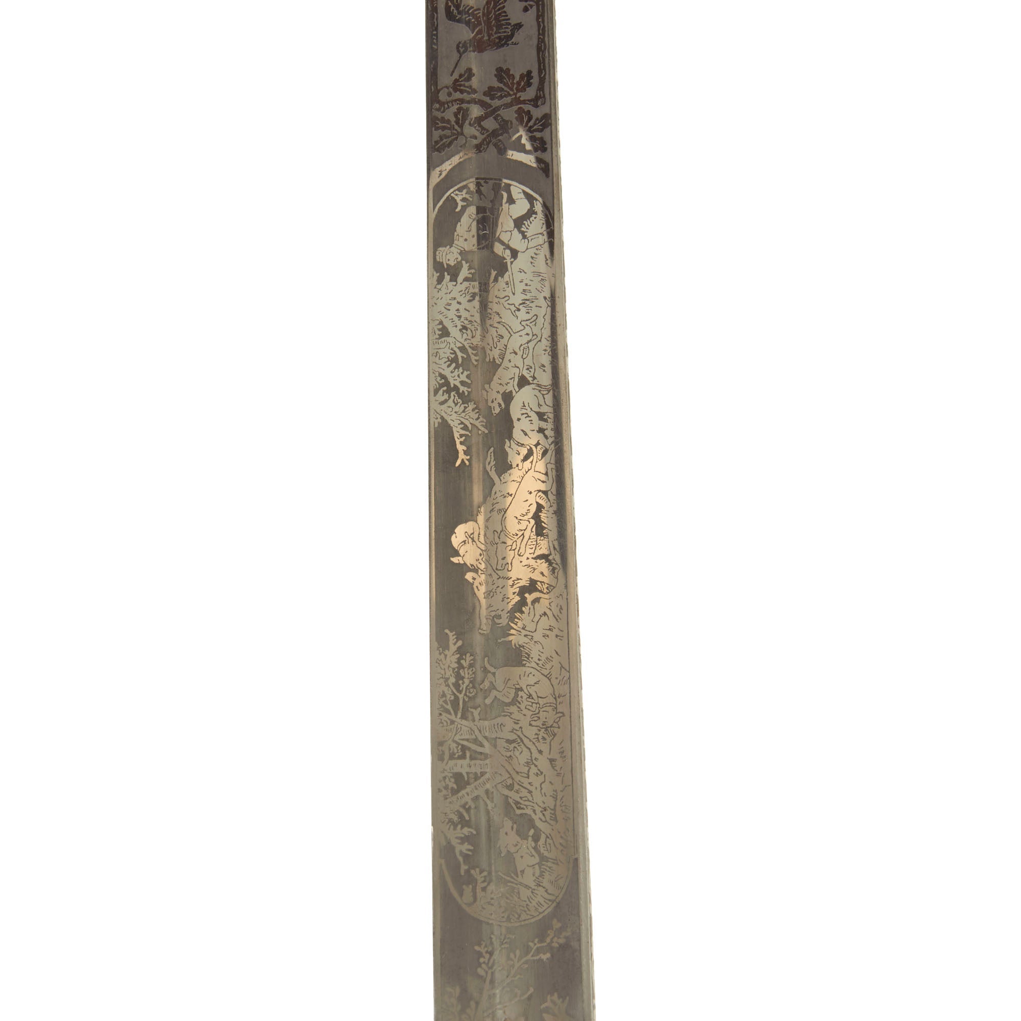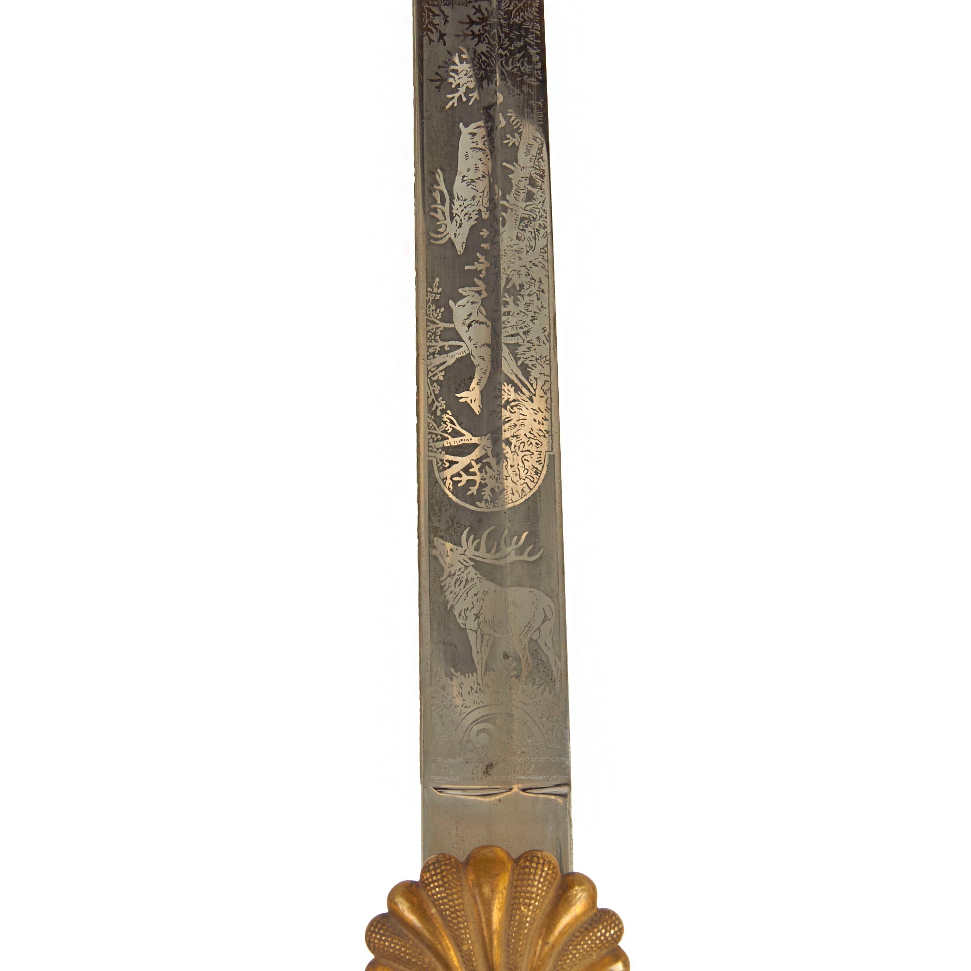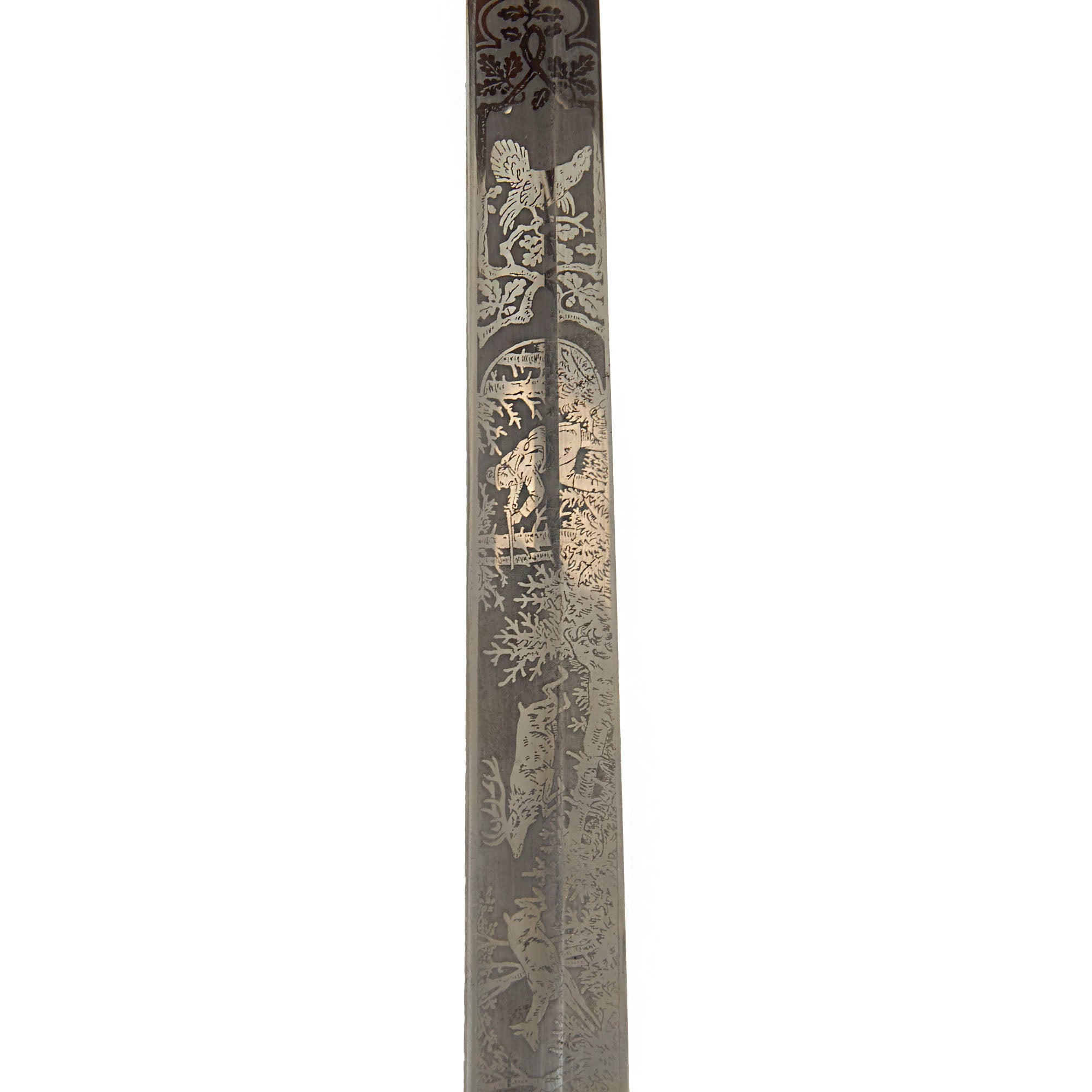 The lovely triple etched blade is still straight, free of major damage and shows only very minor staining and wear. The blade has no post manufacture sharpening to the edge, and these originally were generally intended for thrusting, to finish off their wounded catch. The etched panels on the sides of the blade are simply breathtaking, with one side showing a buck and doe with a hunger aiming his gun, and there is a game fowl to the right of this. The other side shows a pack of hunting hounds taking down a Wild boar, while a hunter runs towards the pile with his hunting cutlass. The panels are surrounded by lovely foliate engraving, and the spine of the blade has a lovely oak leaves and acorn leaf motif running up the back, a classic German design.