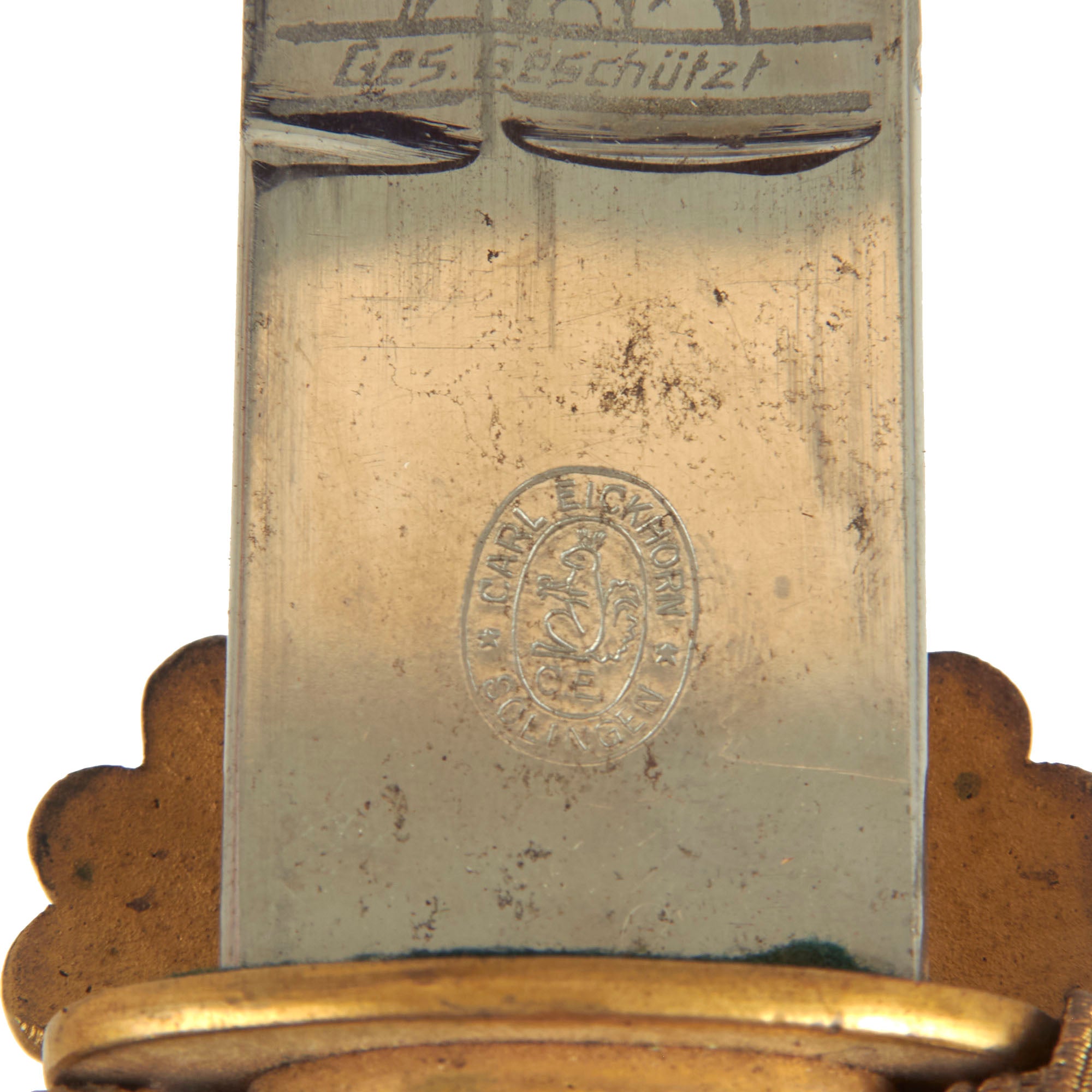The rear ricasso of the blade is stamped with the Carl Eickhorn 1934-35 style double oval trademark logo. It features the trademark squirrel looking to the viewer's left over C.E., surrounded by the first oval. Inside the second oval is CARL EICKHORN above and SOLINGEN below, with cross marks in between.