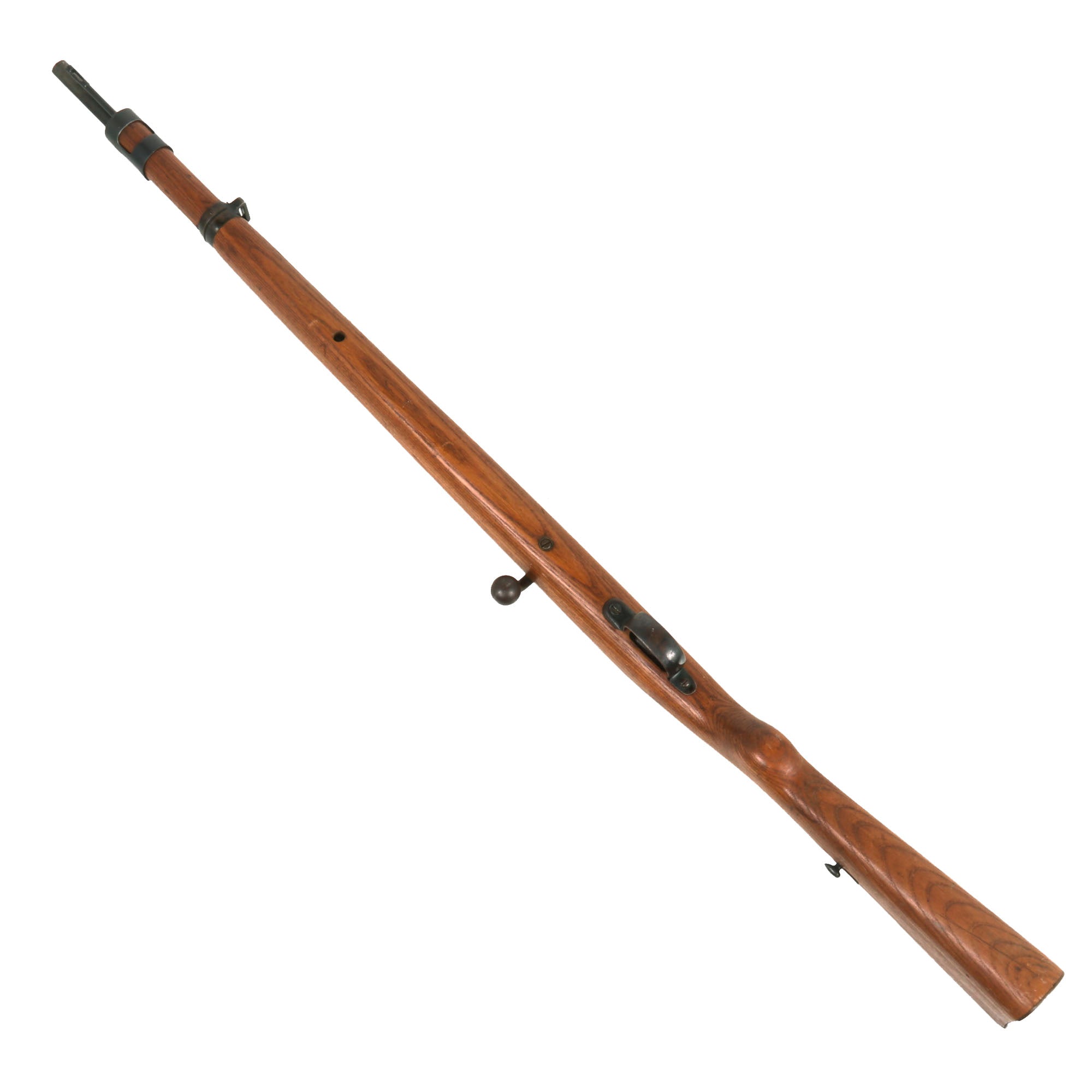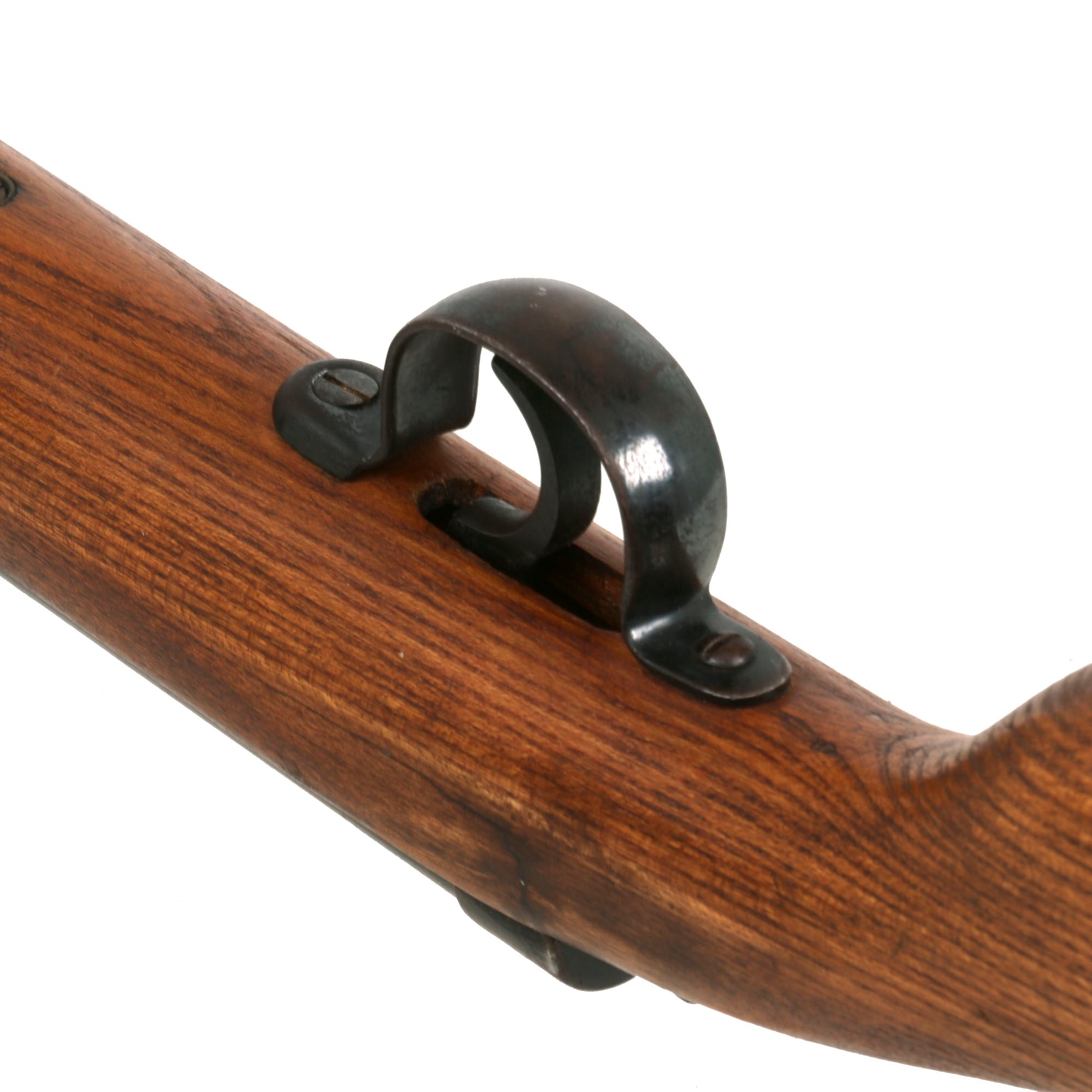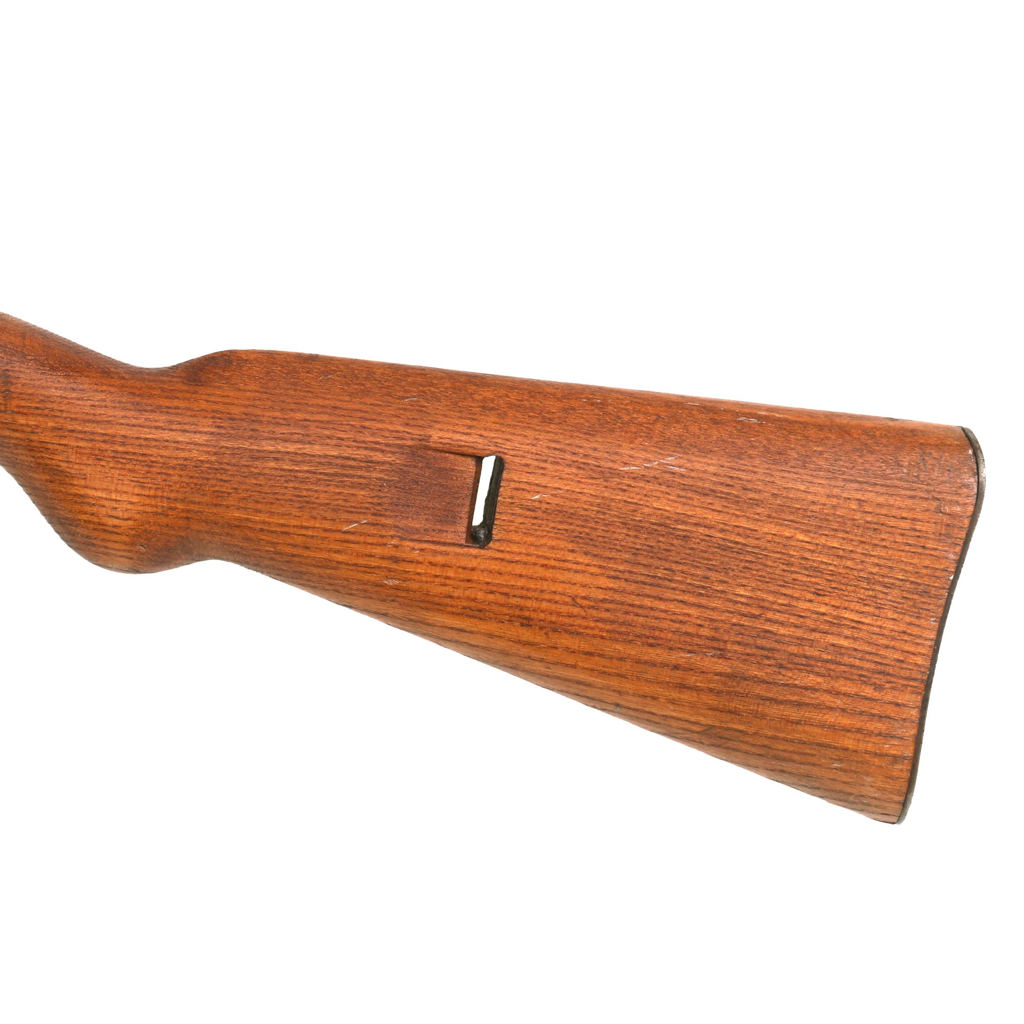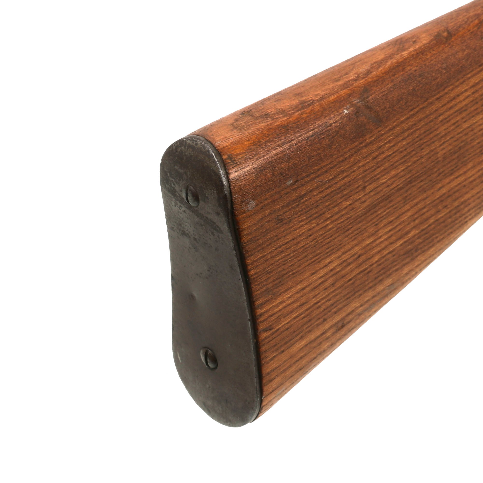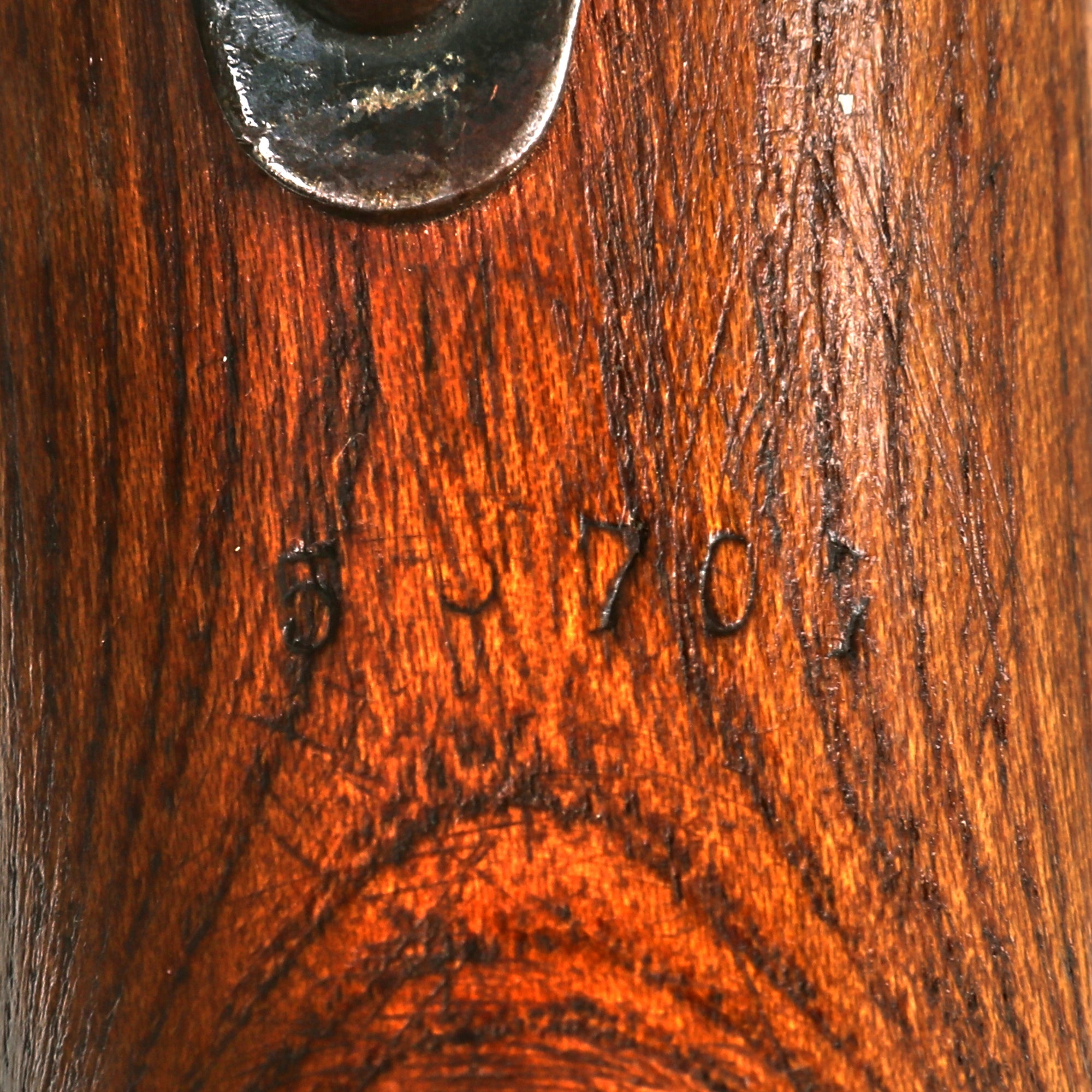 Condition of the air rifle is very good, with much of the original heavy blue finish now faded to a plum patina on the barrel, receiver, and fittings, and it does not look to have been refinished at any time. The "bolt" assembly was originally in the white, and now is stained to a somewhat brown color. The stock shows some denting and gouges from service and storage, and there are repaired cracks on both sides of the stock near the end of the receiver. We have tested the action, and it cycles correctly and has a working safety, though we have no way of testing to see if it is still functional.