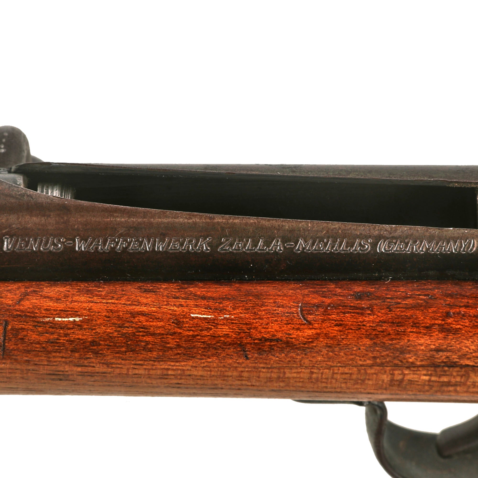 This is a very nice example of a rare MARS 100 pellet gun, which still has much of the original finish present, though it does show wear from use and cleaning. It is correctly marked MARS 100 on the top of the receiver to the rear of the sight, and the rear left is marked by the company that produced it under contract for Mars: VENUS-WAFFENWERK ZELLA-MEHLIS (GERMANY). On the underside of the stock just to the rear of the trigger guard it is stamped with serial number 56707.