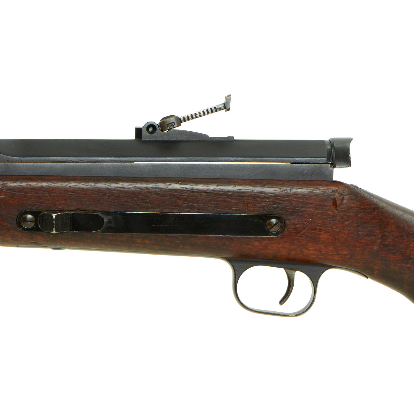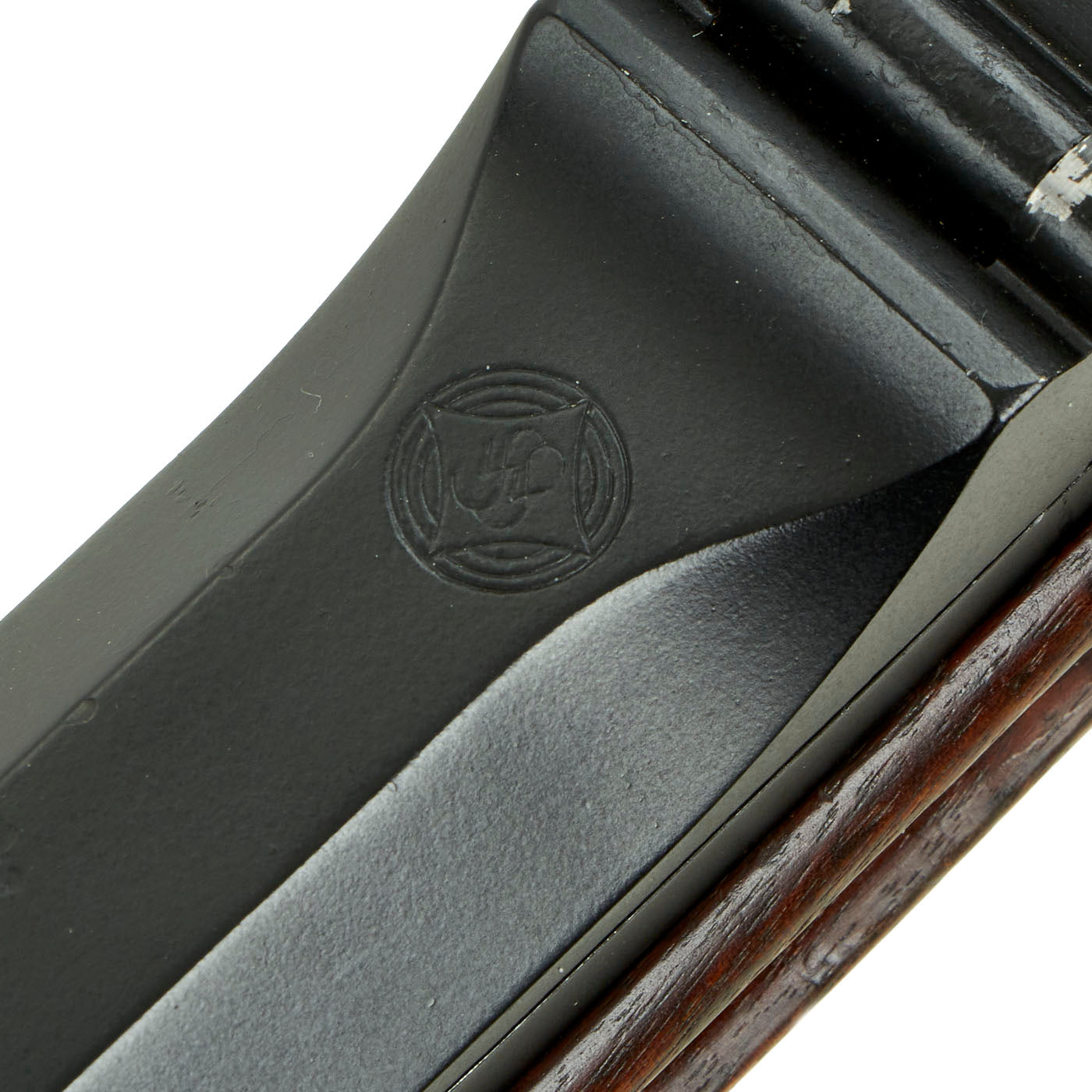 This example has the correct overlapping SSW marking on the top cover, for Steyr-Solothurn Waffen AG, the trading company in Zurich that handled the contracts to obscure the origin of the submachine gun. The left side of the butt stock is marked with serial number 7454 and shortened number 454 is stamped on the spring housing for the top cover latch. Aside from these and the markings on the safety switch, there are no other markings on the machine pistol.