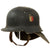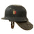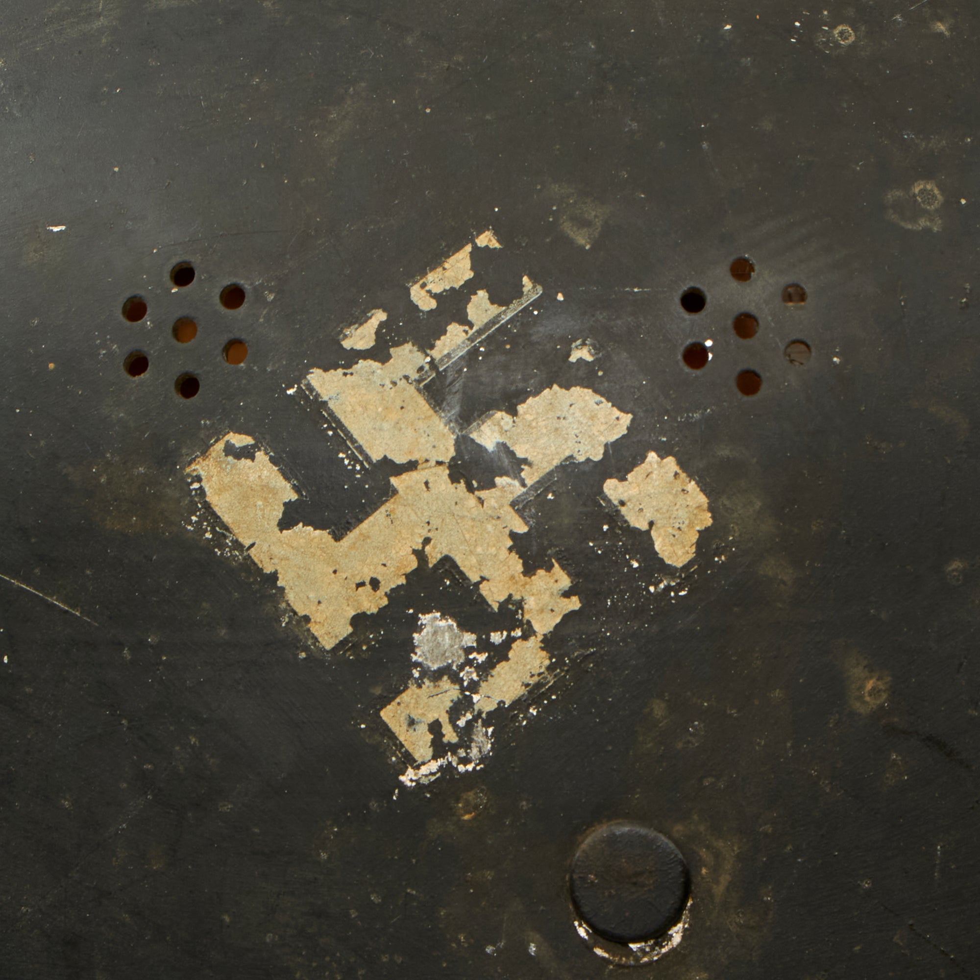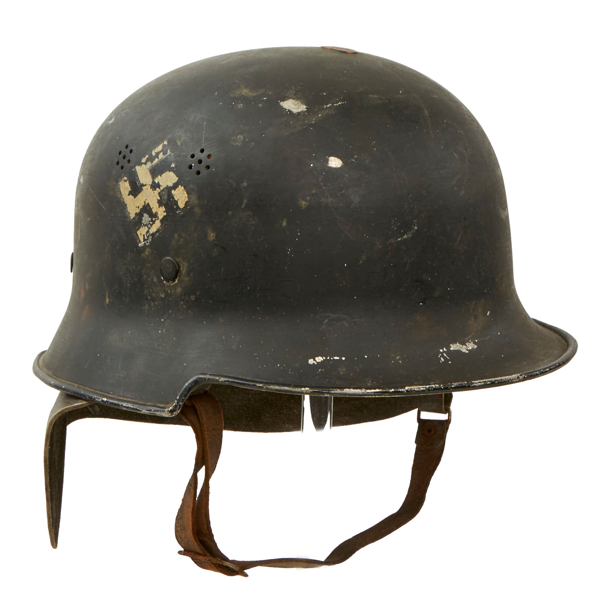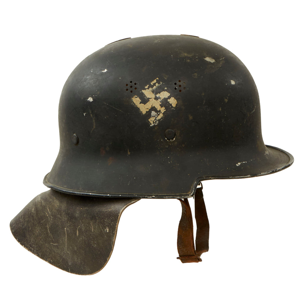 Original Item: Only One Available. This is a very nice rare all aluminum construction M34 "Square Dip" Third Reich Helmet, outfitted for German WWII Fire police (Feuerwehr) issue. Almost all of these that we have seen have a steel shell, however this shell is aluminum. It features genuine early pattern double decals of a Swas on the right, and a tilted national colors decal on the left. There is no comb on the top of the shell, though there a holes in the shell for it, plugged with copper inserts. However, it does have the rare rear leather neck protector, which is something we have only had a few times before!