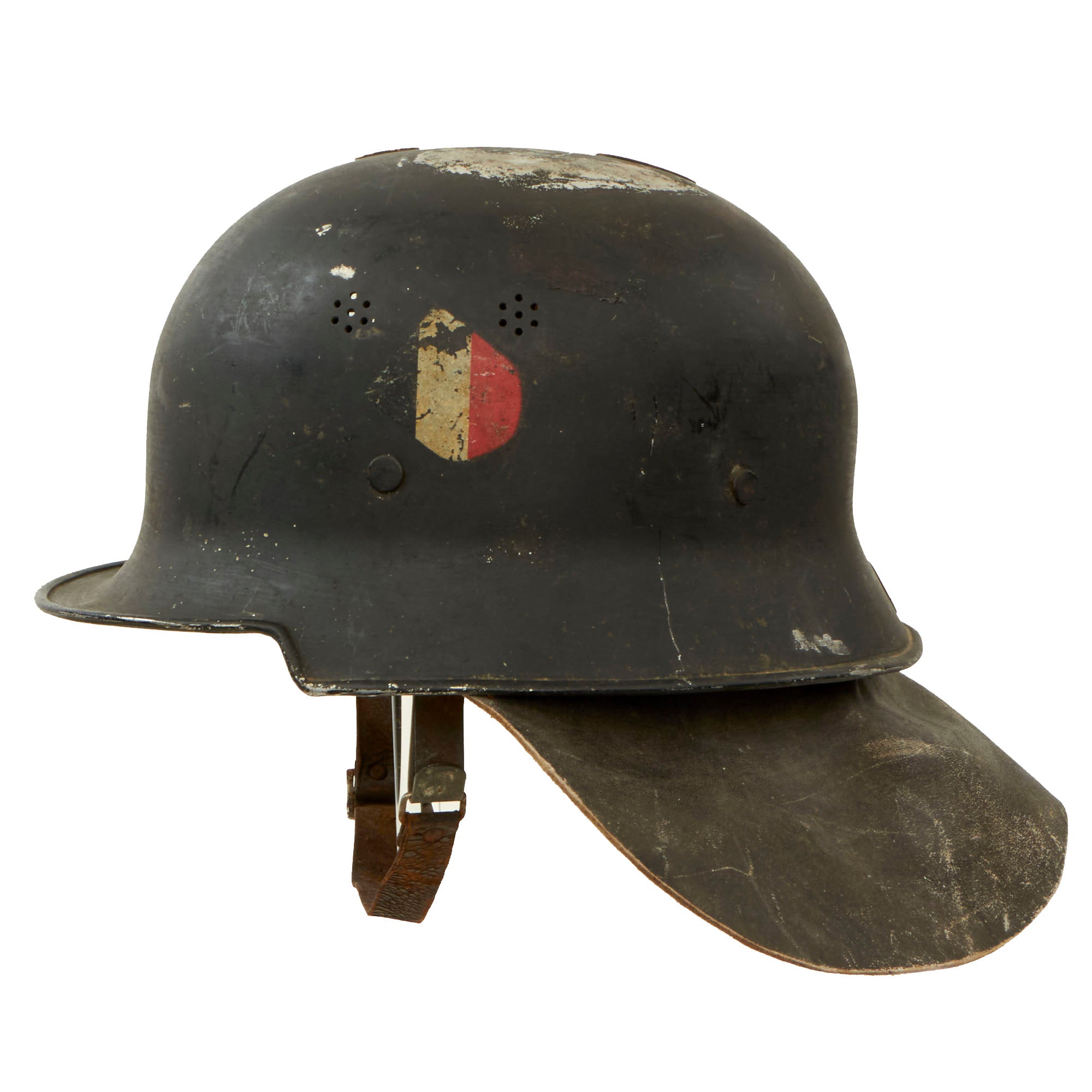 In 1929 a light-weight plastic fiber (Vulkanfiber) helmet was prototyped for general use by all fire-fighting units. The first models were issued in 1932 and proved unworthy of further consideration. As a result a second prototype was explored using light-weight steel alloy known as "Edelstahl." During this time leather fire-fighting helmets were slowly replaced with a combination of surplus World War I model steel helmets and privately manufactured versions in the “Austrian” pattern shell. These early helmets were generally painted black although some were left in their original field-gray World War I color.