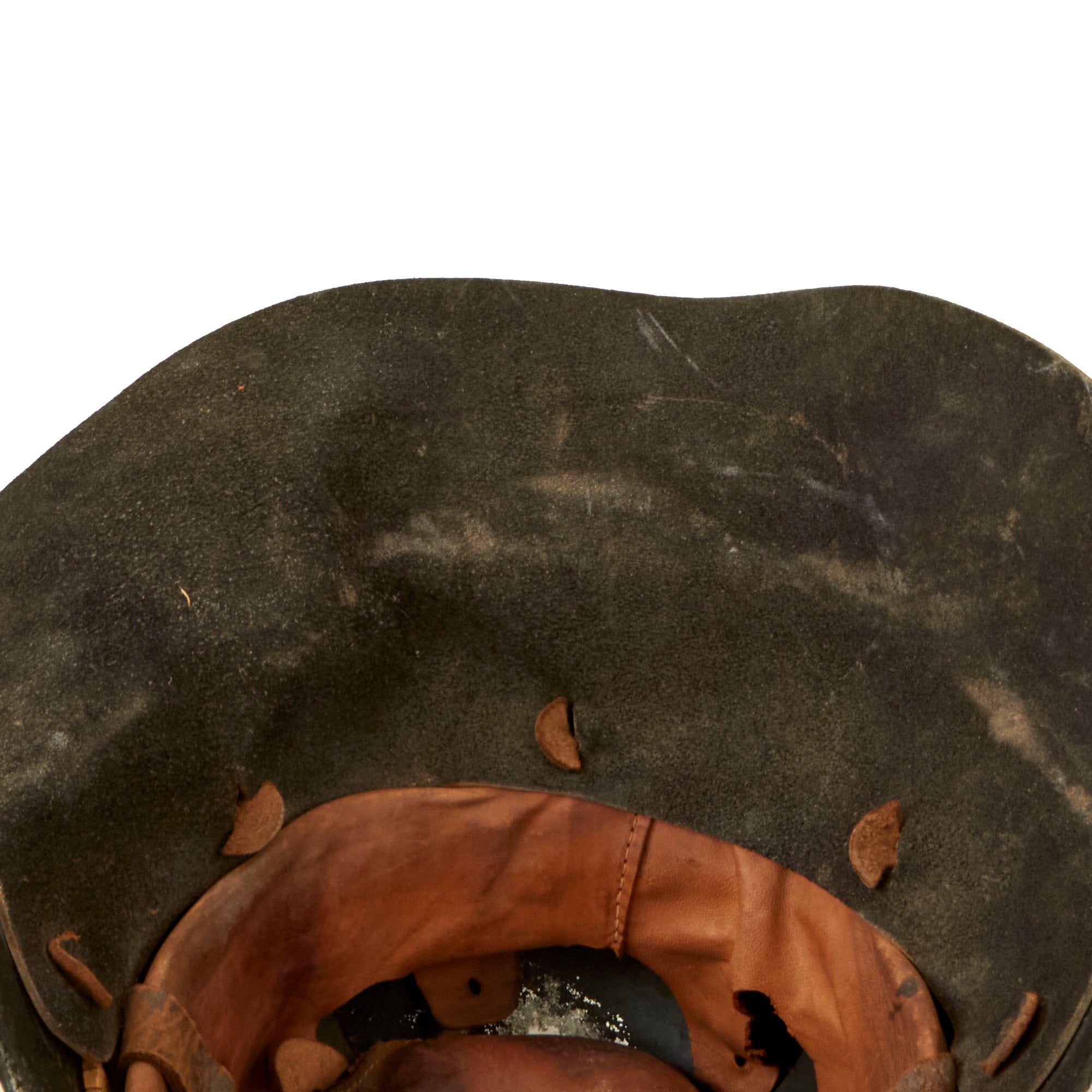 All four liner split pins are present, along with their cork spacers, and there is still a very nice leather liner in the helmet, which shows light wear and some possible rodent damage in a few areas. There is no top tie present, and one of the fingers is stamped with size 56. All five of the leather "tabs" for the rear neck shield are present, and are properly inserted through the neck shield, which is still in nice supple condition. The fiber cross top suspension is still good, and there is even an intact top pad, which was personalized by the USGI who brought it home! It reads: