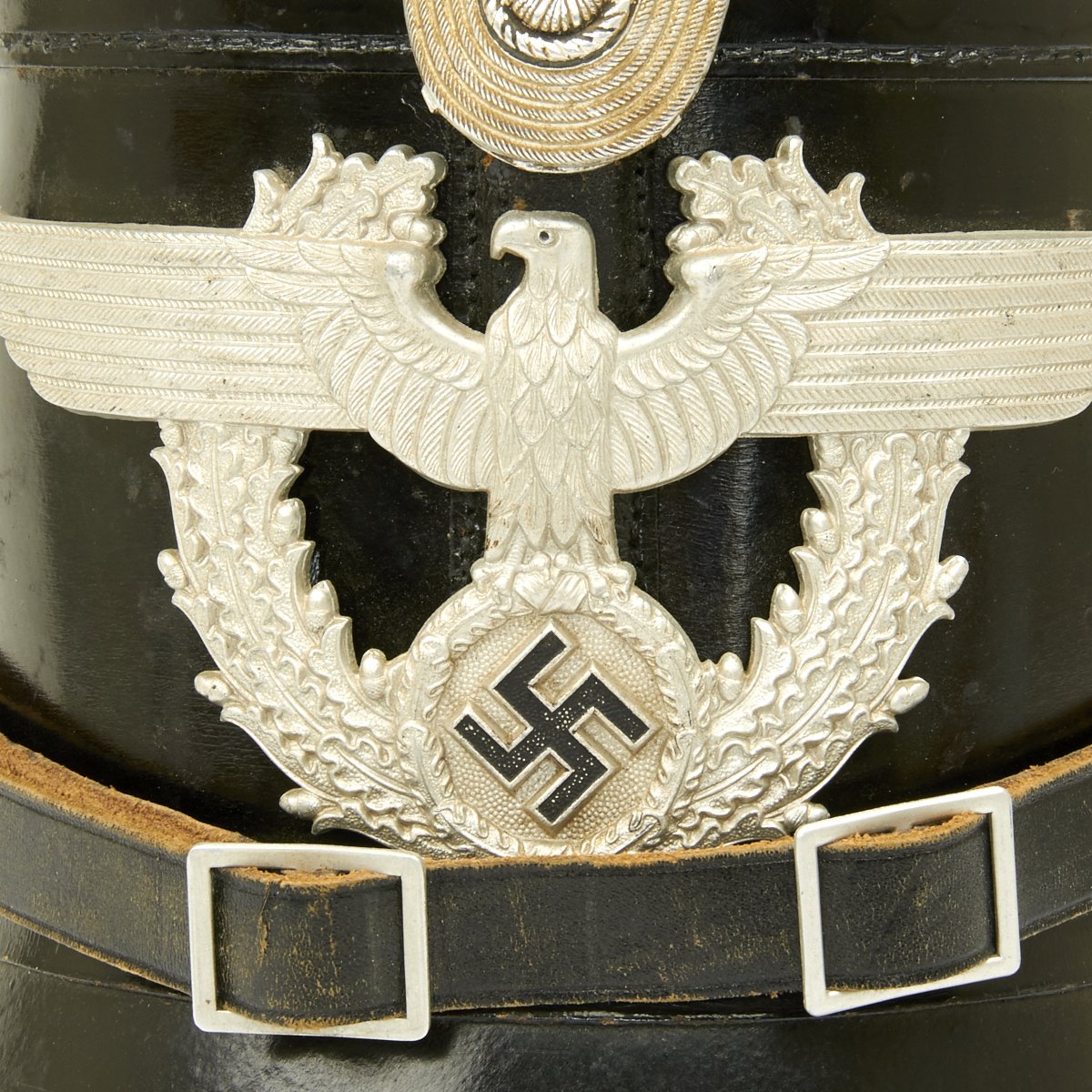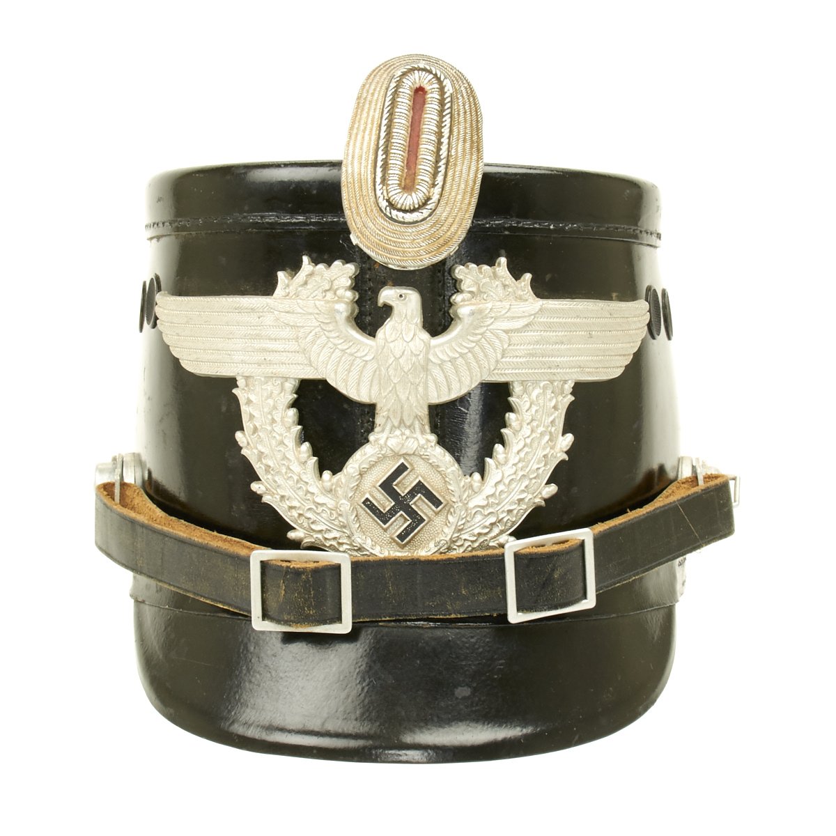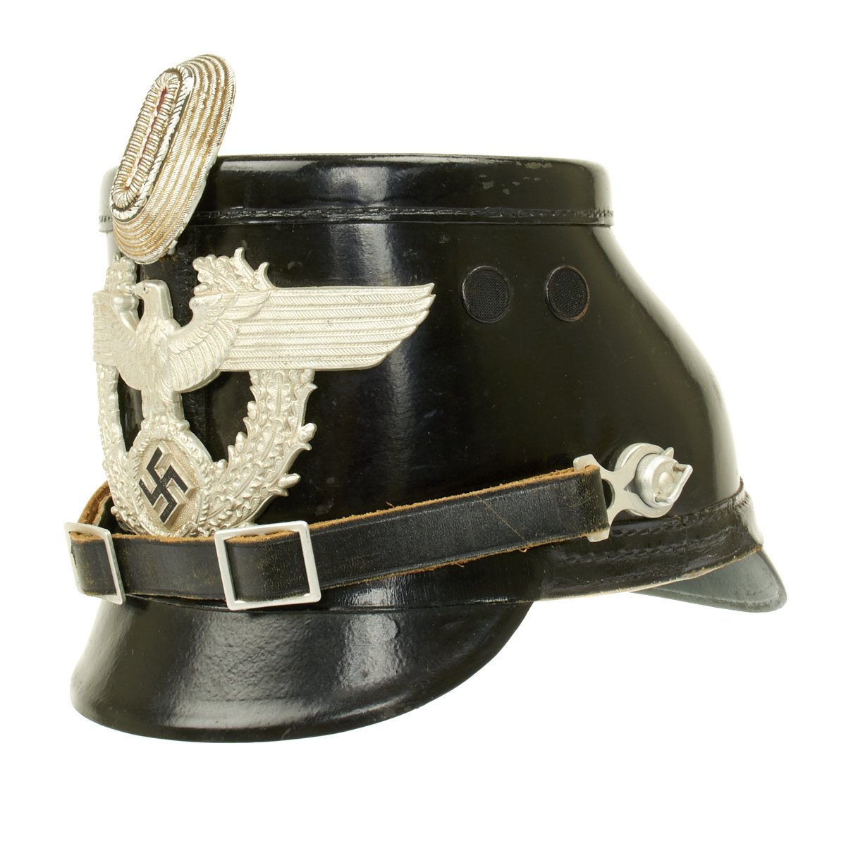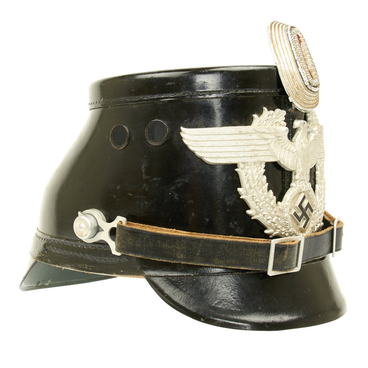Original Item: Only One Available. Early 1934-1935 produced police pattern Tschako in black that pre-dates the more common green wool body version. Has very fine quality police eagle with bullion wire cockade (often missing). A great Polizei helmet (shako) as used by the metropolitan police, unlike some of the more common ones found trimmed in brown for rural police, this one is with black trim for the metropolitan police. Interior is fine, leather is supple and shows only light age. Complete with original leather chin strap. Overall it shows only minor wear, black lacquered finish still excellent. Vents are perfect condition with working slide closure. Overall a fine looking rare police Shako.