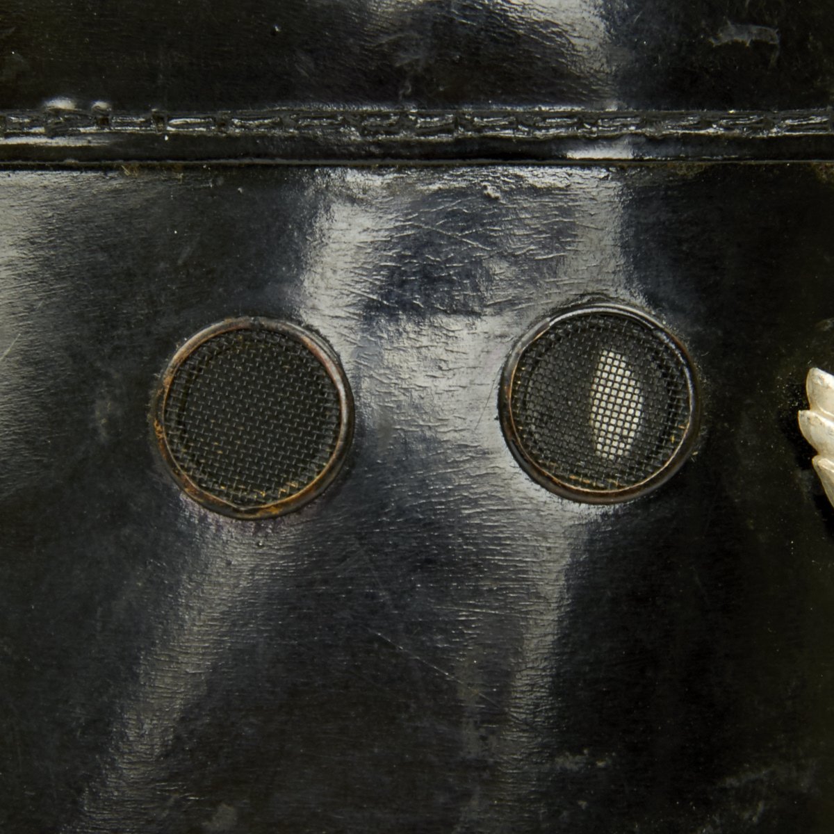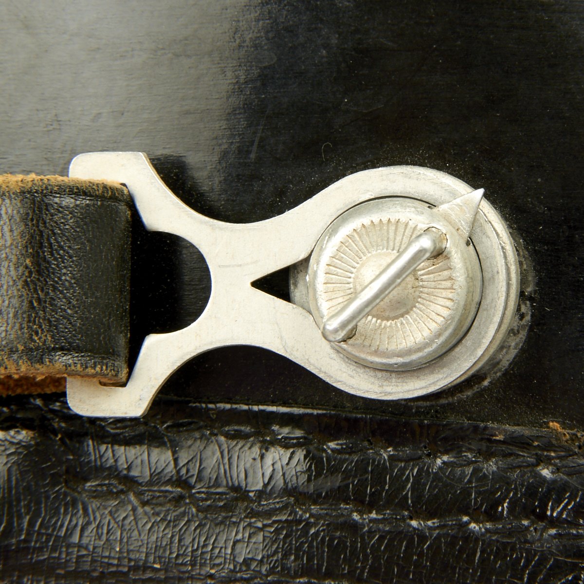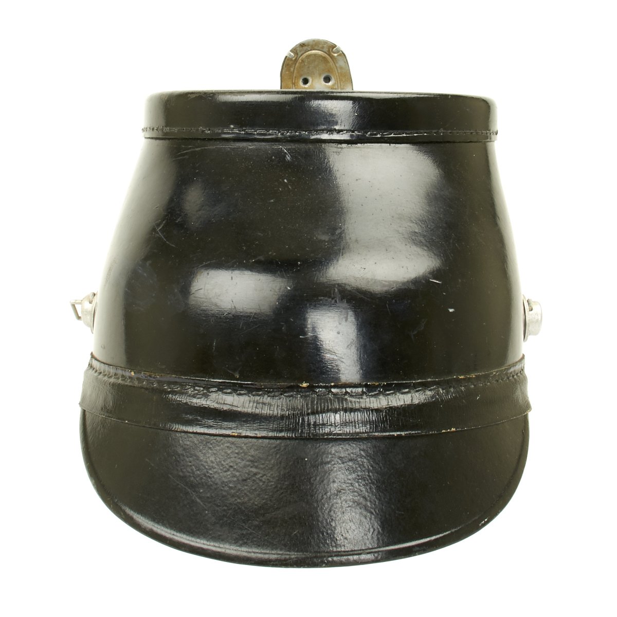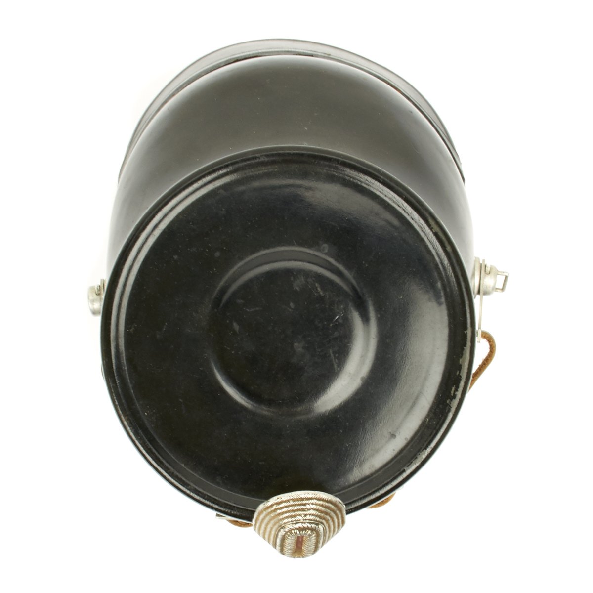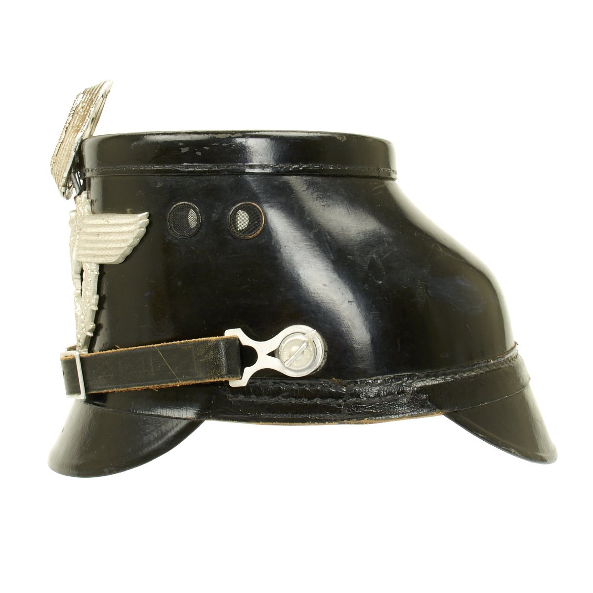 Original Item: Only One Available. Early 1934-1935 produced police pattern Tschako in black that pre-dates the more common green wool body version. Has very fine quality police eagle with bullion wire cockade (often missing). A great Polizei helmet (shako) as used by the metropolitan police, unlike some of the more common ones found trimmed in brown for rural police, this one is with black trim for the metropolitan police. Interior is fine, leather is supple and shows only light age. Complete with original leather chin strap. Overall it shows only minor wear, black lacquered finish still excellent. Vents are perfect condition with working slide closure. Overall a fine looking rare police Shako.