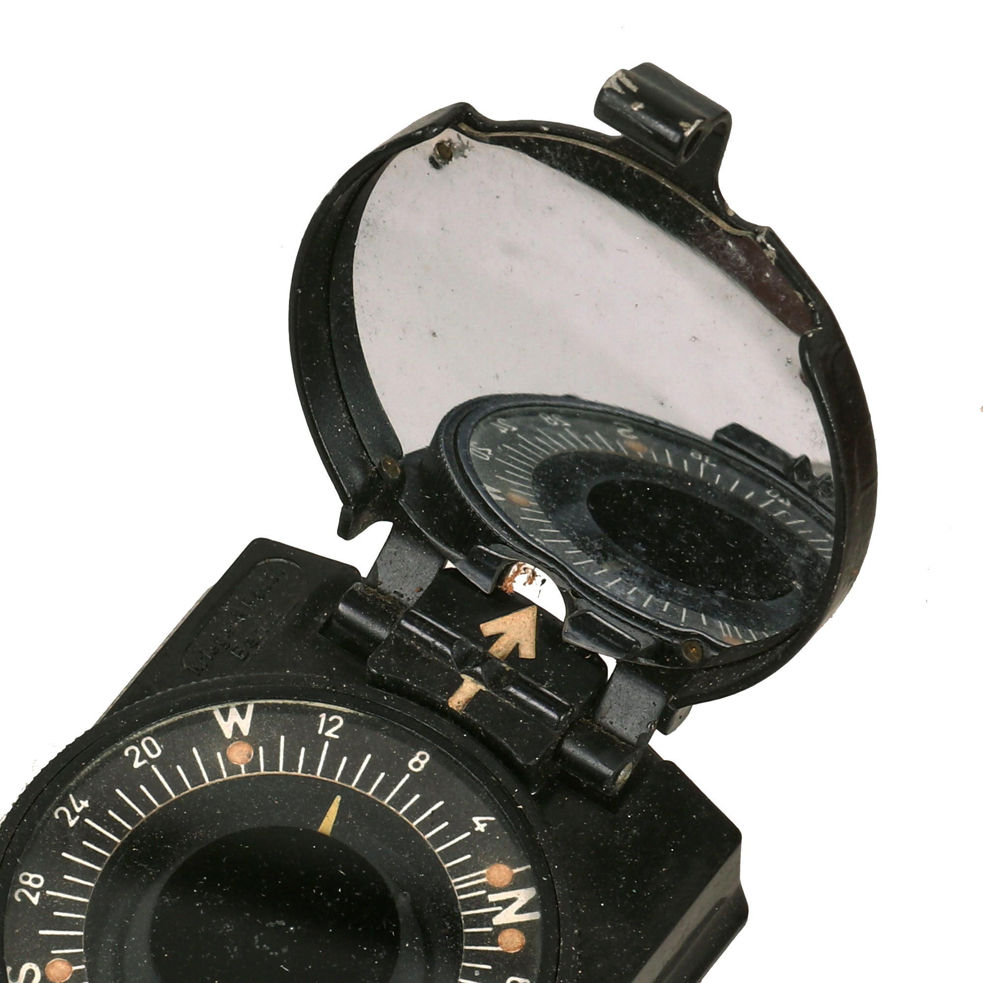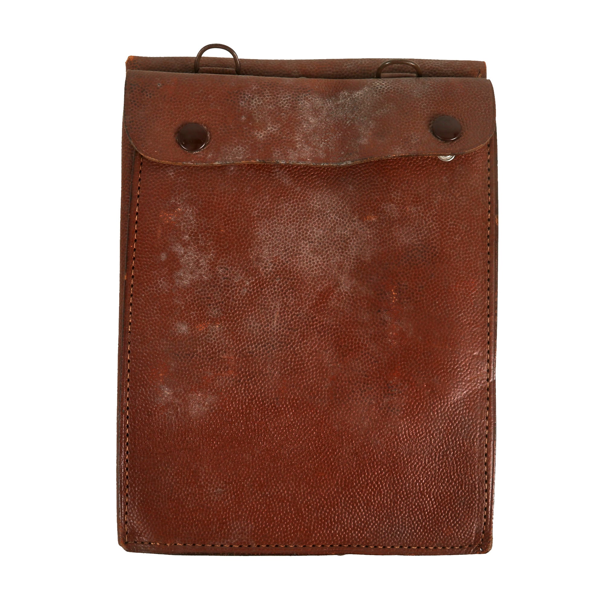 Original Item: One of a Kind. This is a “time capsule”, so to speak. This German Map Case was recently uncovered from an old collection just the way it was received decades ago from a WWII Veteran! This is really a quite interesting map case set from WWII! As best we can tell the set is contained in a brown pebble grain leather "private purchase" German map case, which was definitely not made in the standard M35 Military pattern. The Map Case is complete with original matching leather chinstrap and writing instrument “board”. In addition it contains a Wehrmacht Issue Bakelite Marching Compass.