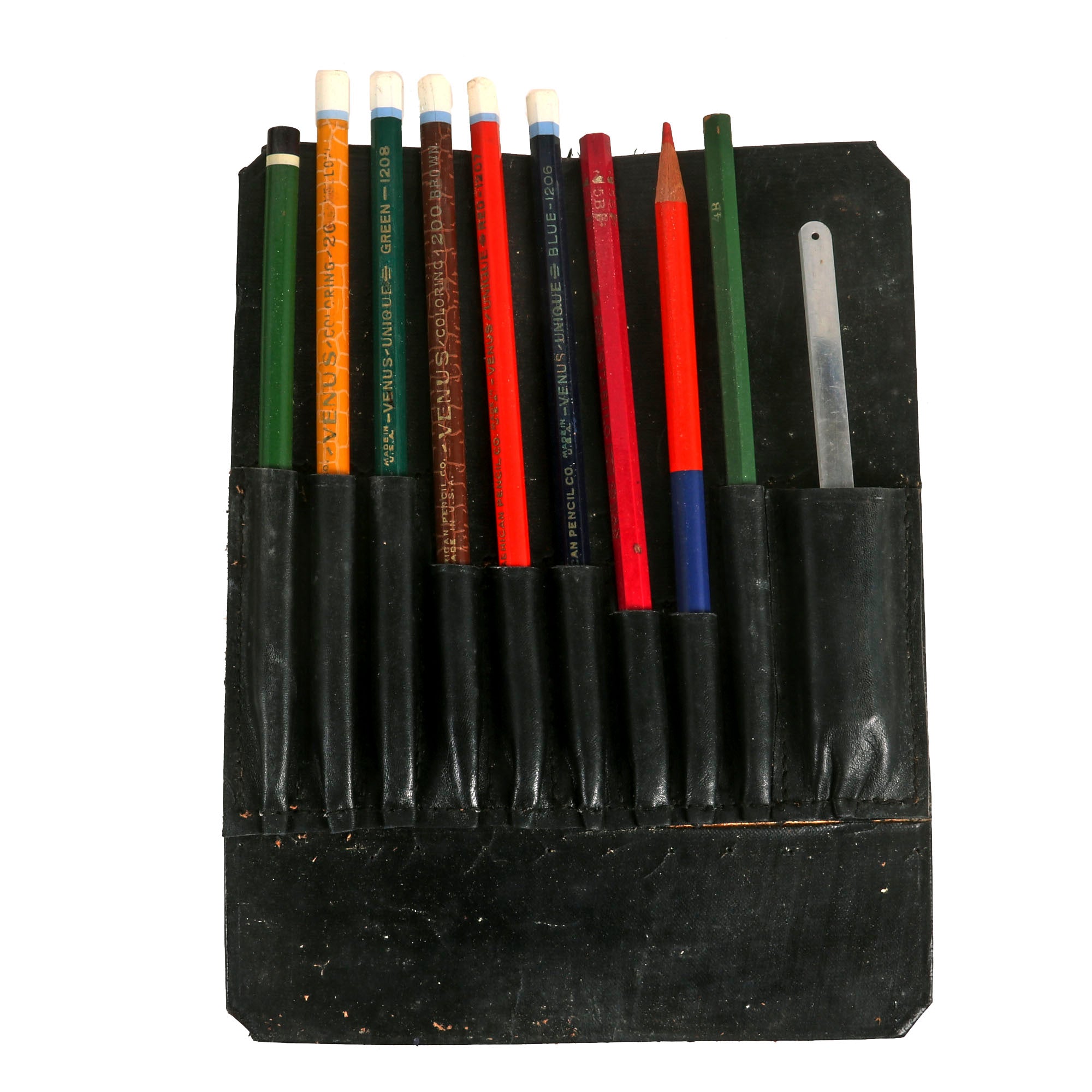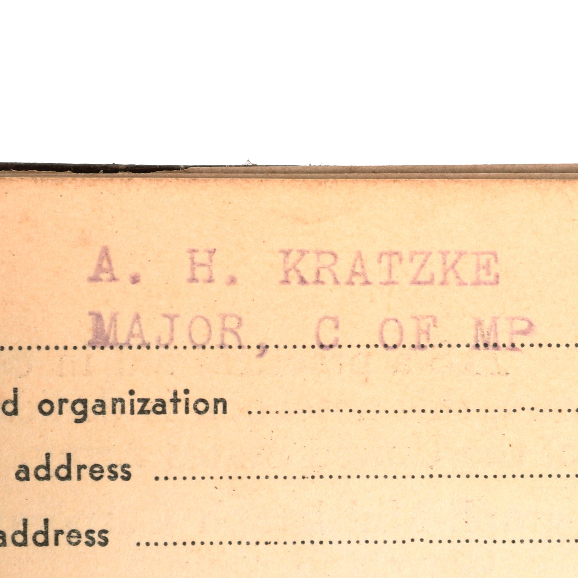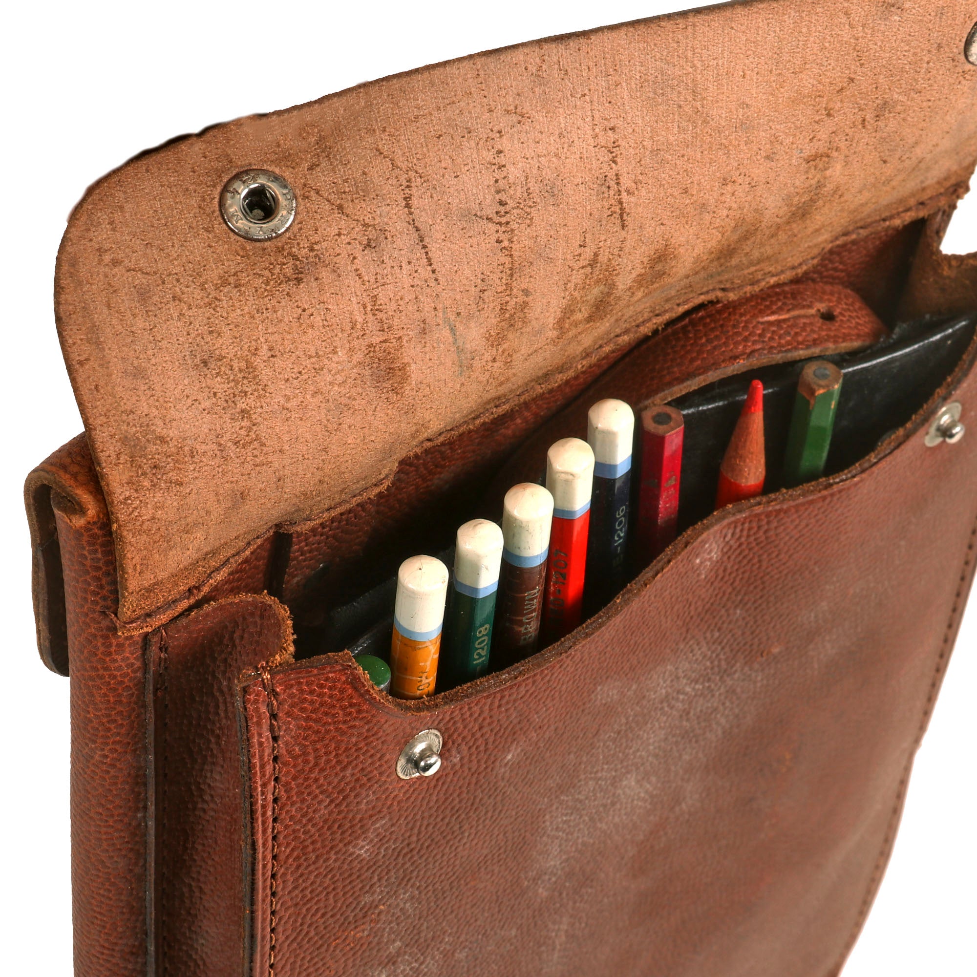 However, also inside is a 1941 dated ARMY OFFICER'S NOTEBOOK, with the Federal Eagle and U. S. A. below it, for the U.S. Army. Inside it is named to A. H. KRATZKE / MAJOR, C OF MP., and the writing inside is definitely in English. We also noted that the wooden ruler is marked A.H.KRATZKE along with what looks to be Army Serial Number O-147463, and was MADE IN ENGLAND. The pencils are all U.S. manufacture except for two, which were made in Germany. It also has a pencil sharpener inside, with a 1940s vintage "Goofy" sticker on it. The case measures approximately 10 1/4"H by 7 1/2"W by 2", and is in very good condition.