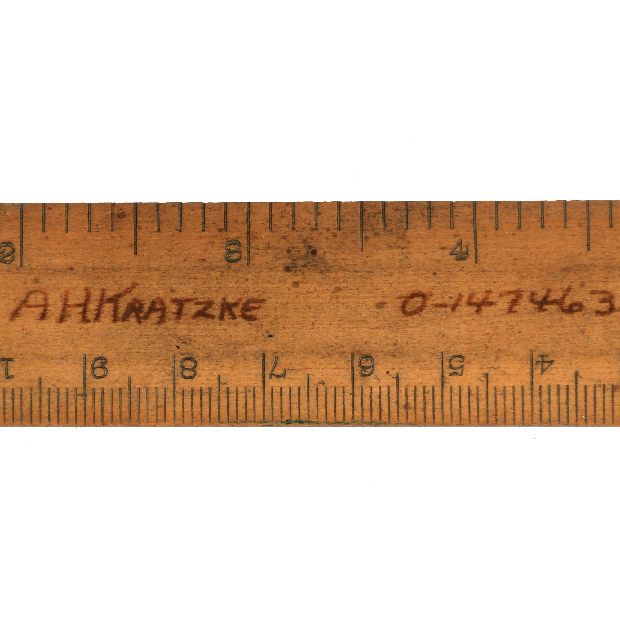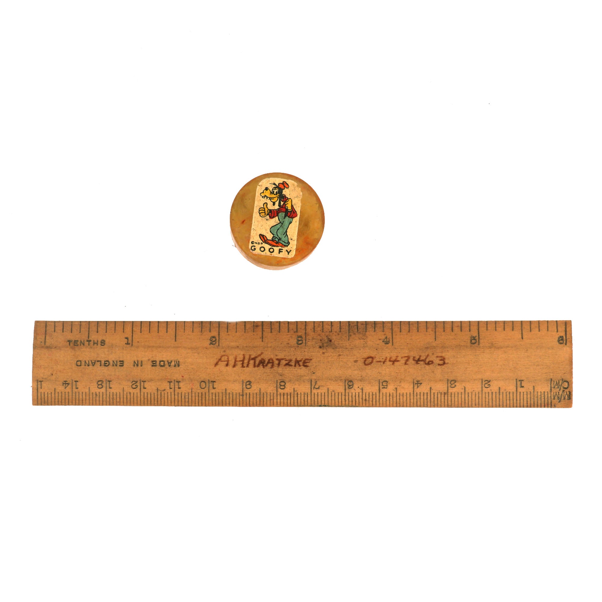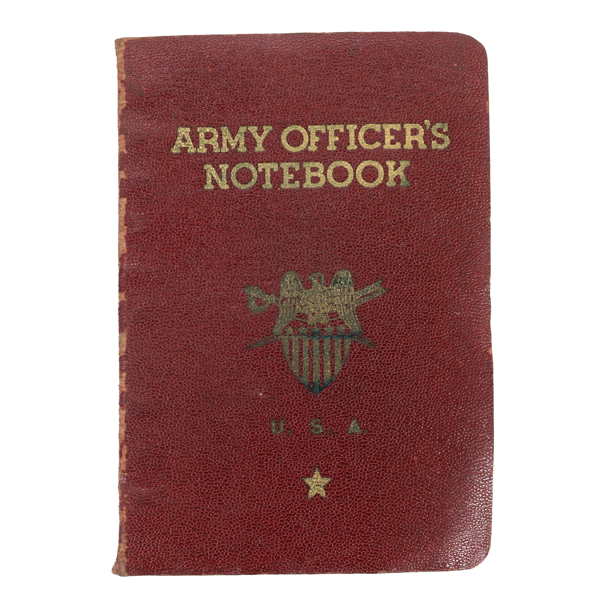 However, also inside is a 1941 dated ARMY OFFICER'S NOTEBOOK, with the Federal Eagle and U. S. A. below it, for the U.S. Army. Inside it is named to A. H. KRATZKE / MAJOR, C OF MP., and the writing inside is definitely in English. We also noted that the wooden ruler is marked A.H.KRATZKE along with what looks to be Army Serial Number O-147463, and was MADE IN ENGLAND. The pencils are all U.S. manufacture except for two, which were made in Germany. It also has a pencil sharpener inside, with a 1940s vintage "Goofy" sticker on it. The case measures approximately 10 1/4"H by 7 1/2"W by 2", and is in very good condition.