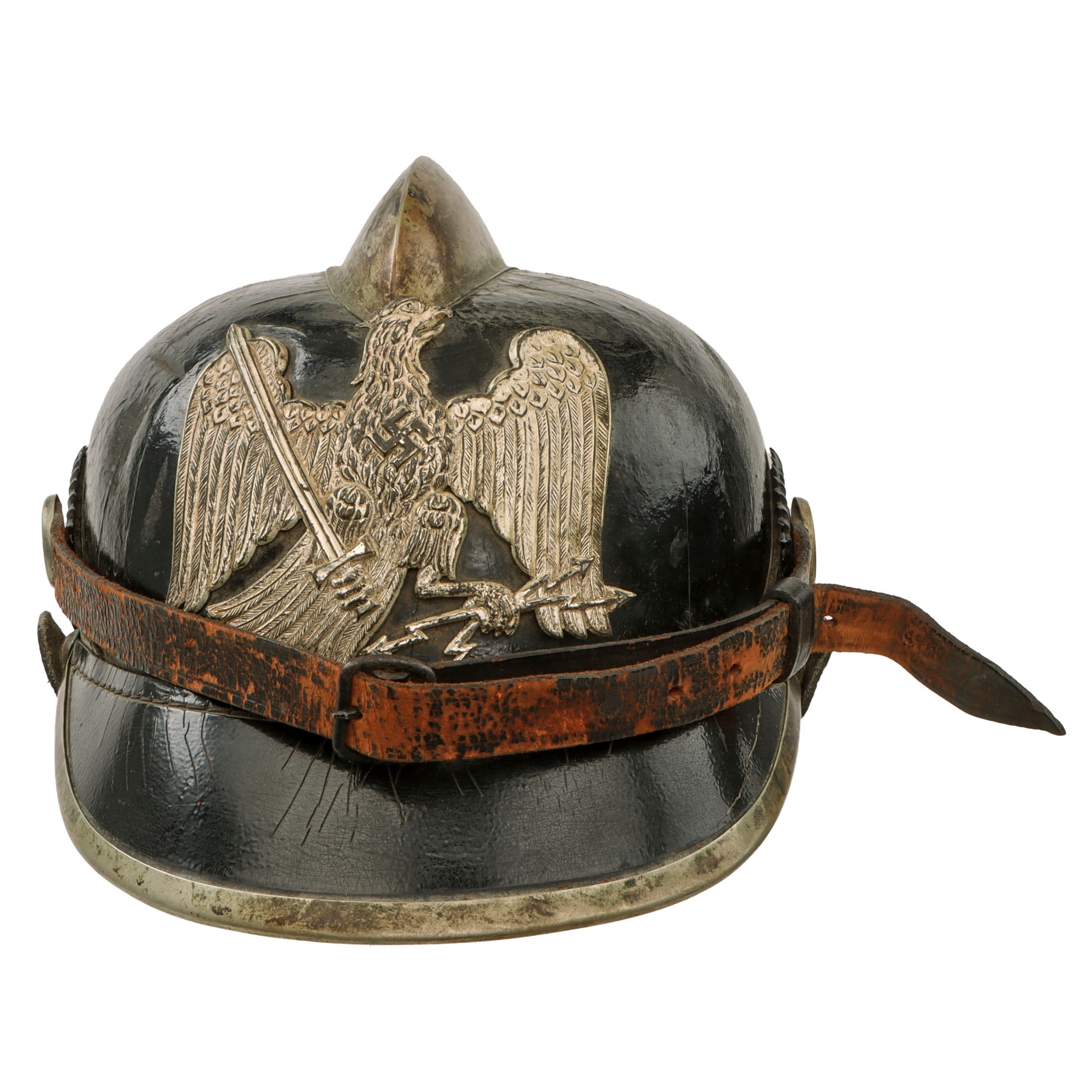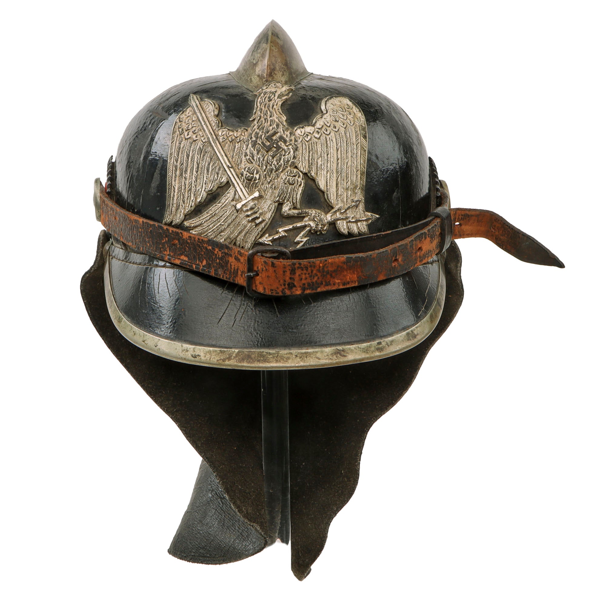 Original Item: Only One Available. This is a fantastic Circa 1933 pickelhaube Fire helmet, made with the standard boiled leather body, and all of the fittings look to be very attractive German Silver alloy. These include the fire brigade top comb, the trim for the front visor, as well as the wappen. The front plate (wappen) looks to be silver plated nickel silver, and is a very large dramatic eagle with dropped down wings holding a sword in one slaw and lightning bolts in the other with a swas on its chest. This is what dates the helmet to around 1933-1934.
