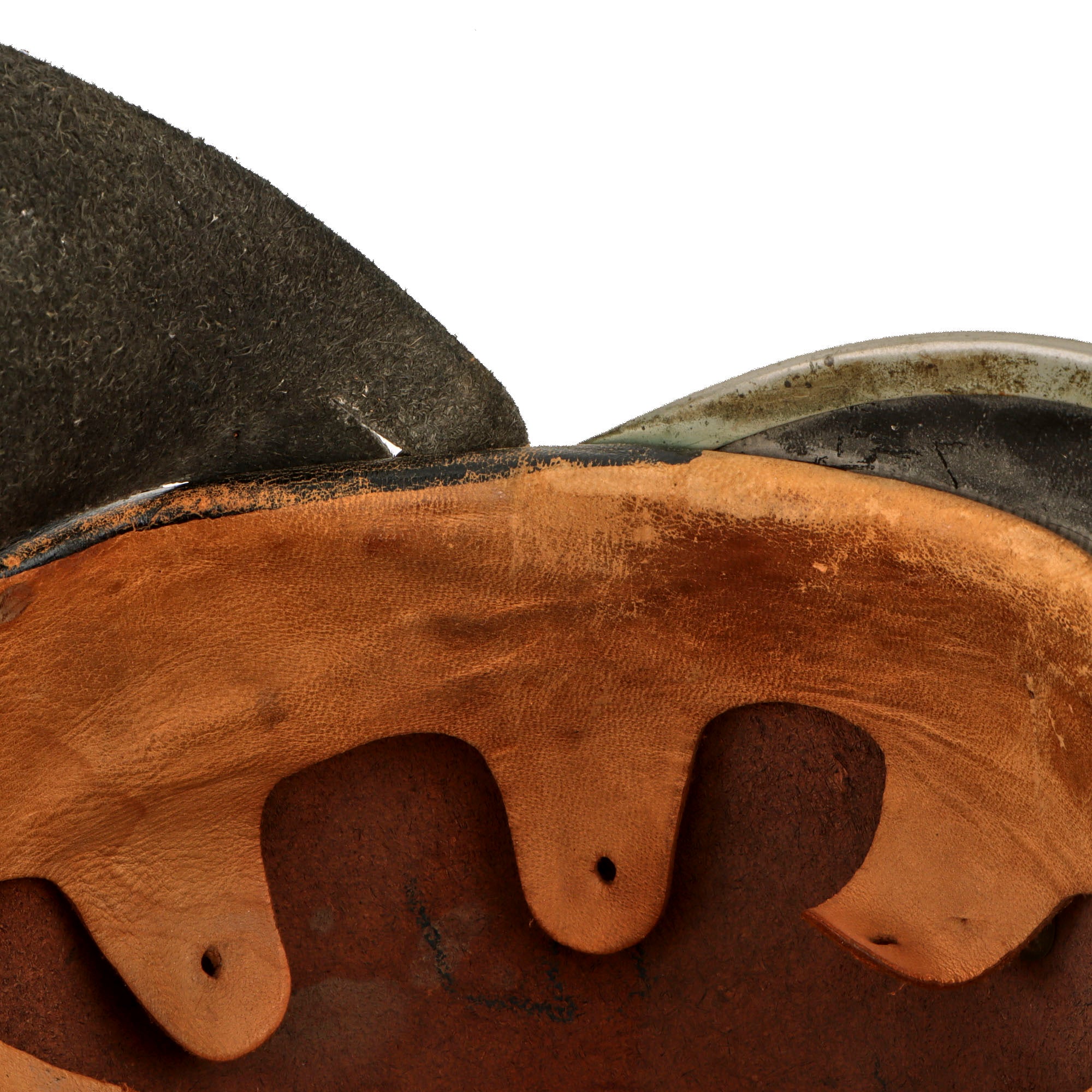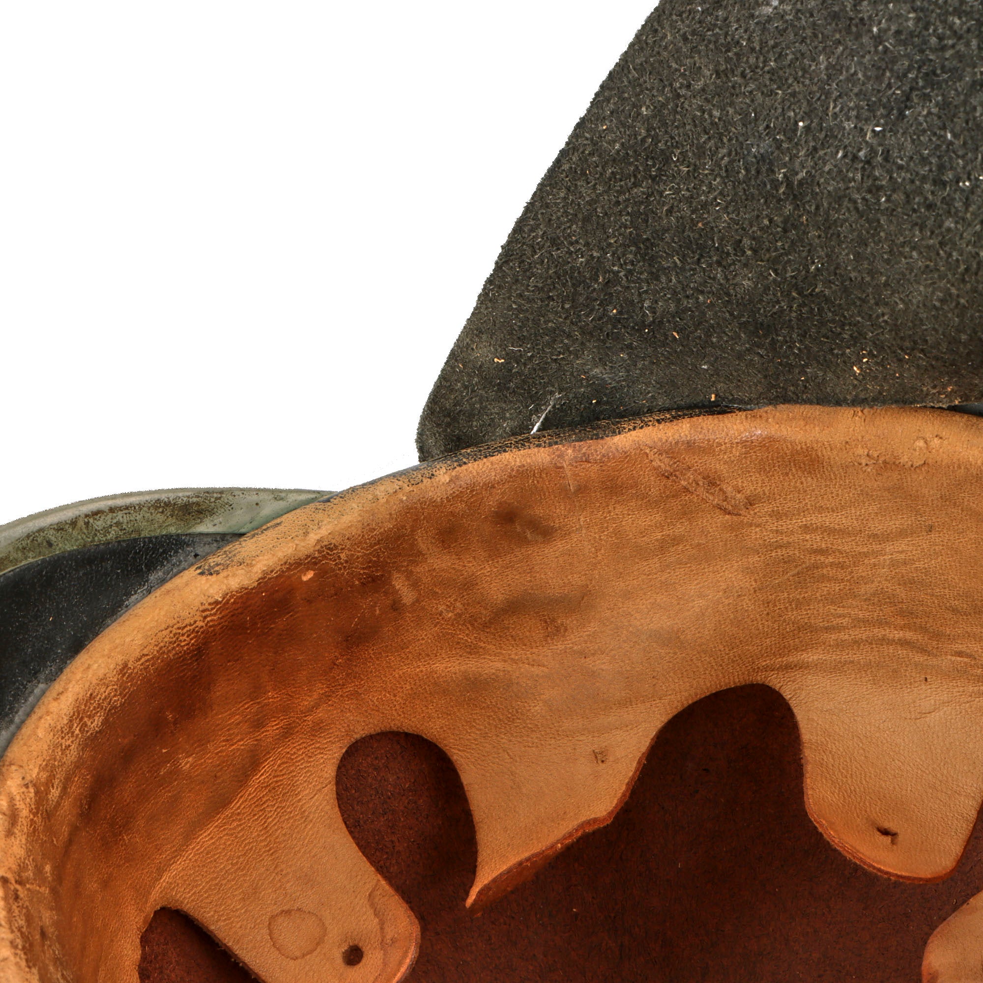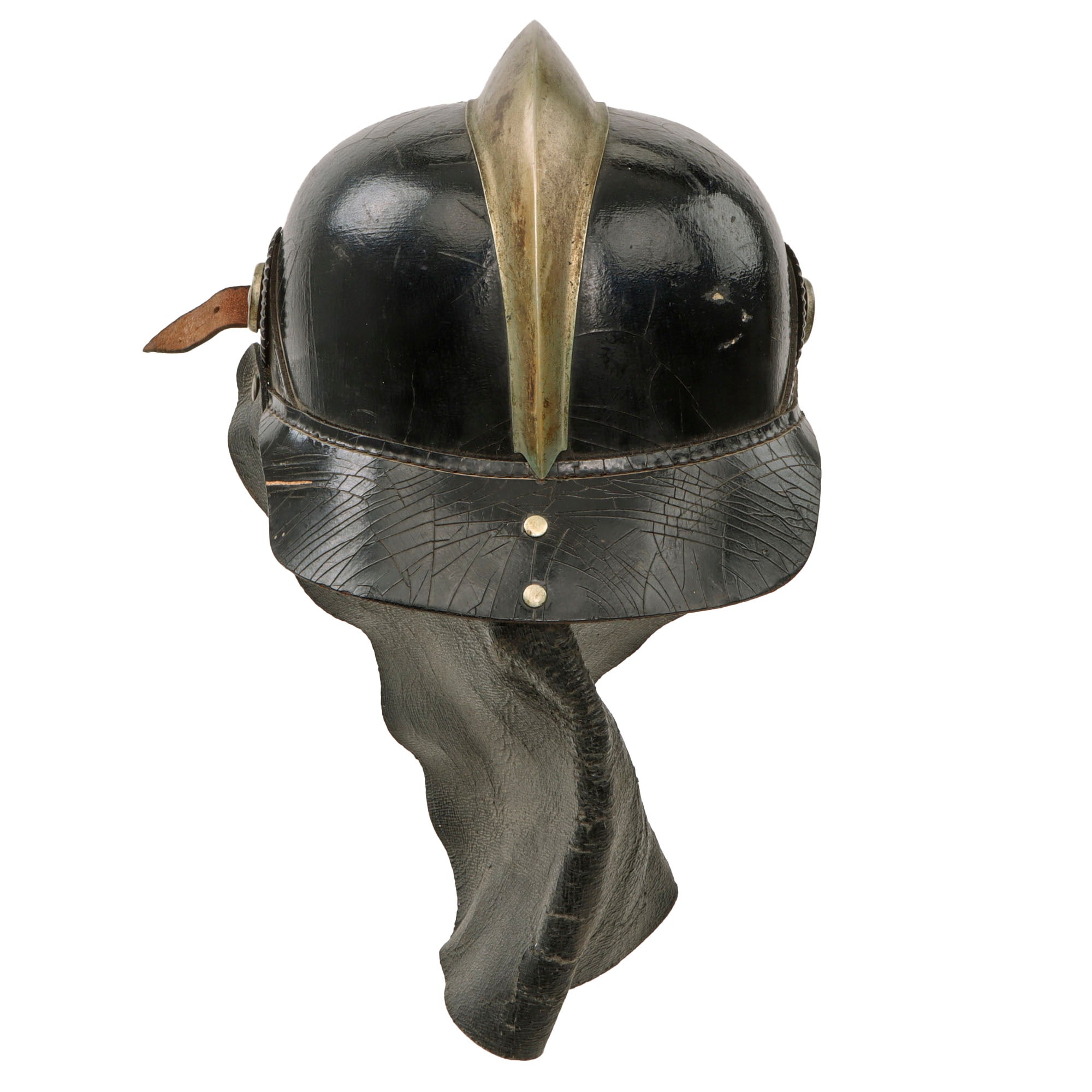 This example retains the rare detachable rear leather neck flap which shows heavy crazing and cracking but is still solid overall. It displays great on a mannequin head.