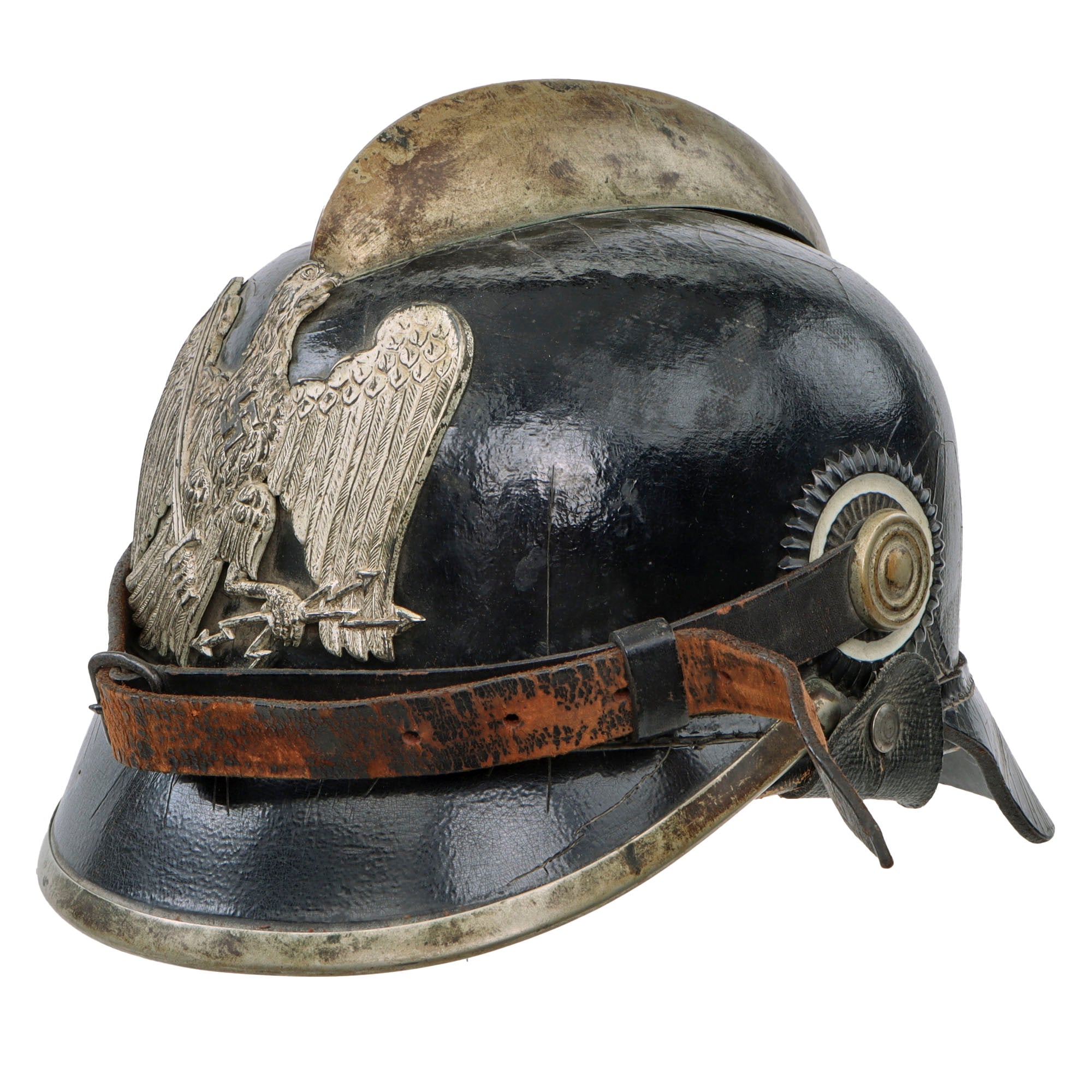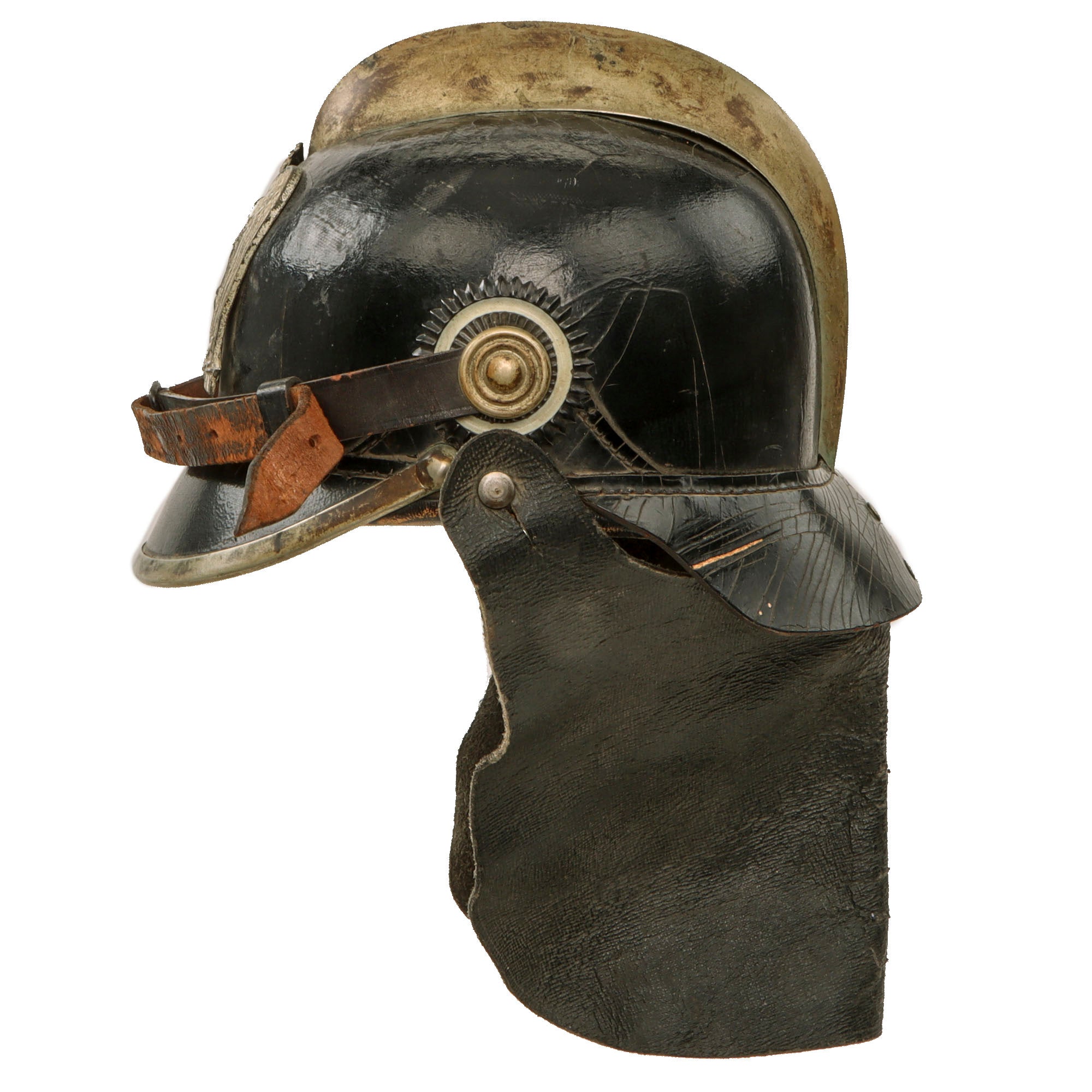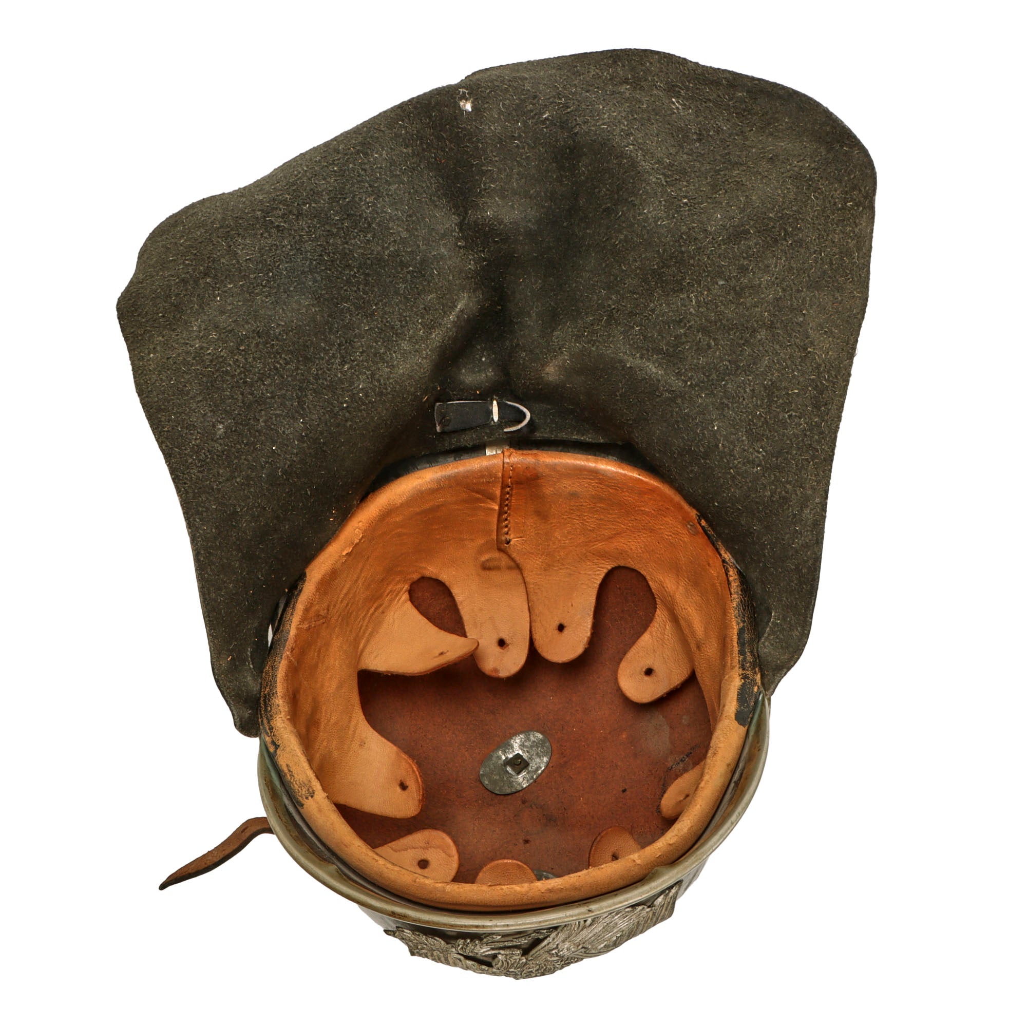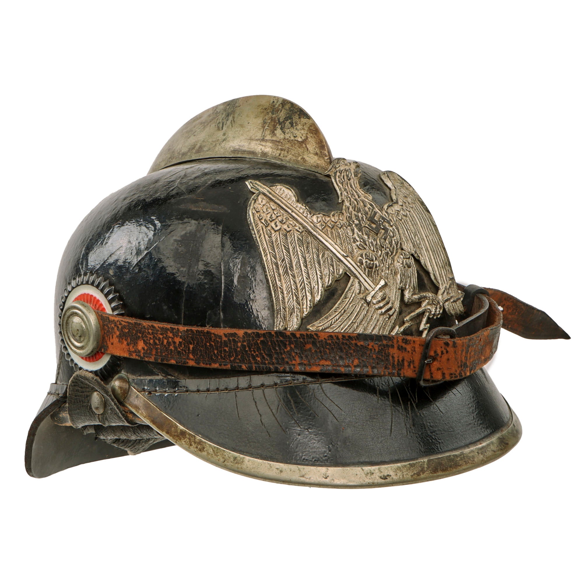 It is complete with original Prussian (black and white) and German National Colors (red white and black) Kokarden (cockades) around the chin strap lugs. This was still done up to the Pre-WWII era on Fireman’s helmets. They are held in by the rough leather chinstrap which is well-retained with heavy crazing in the leather.