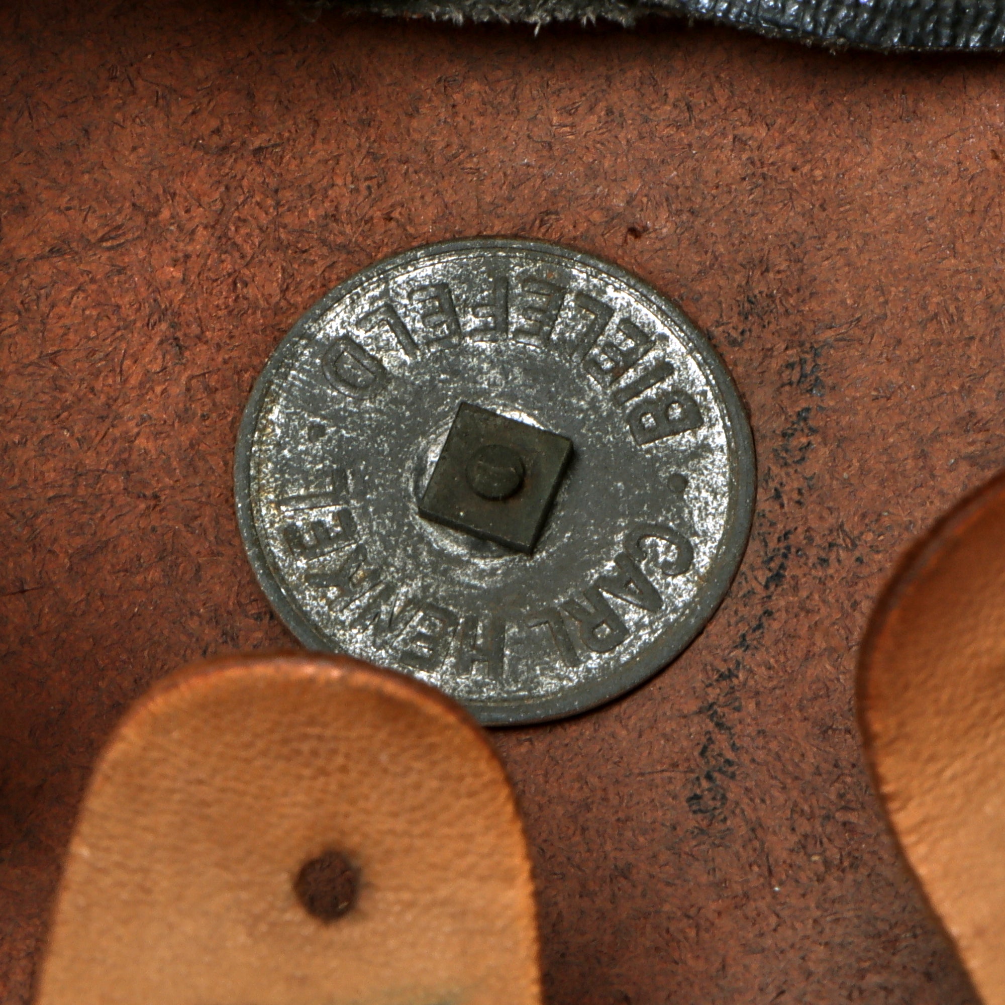 The 9-tongue liner is in great order with some rubbing away of the finish, but there is not any serious tearing. The front of the comb is held in place by a nut with a washer embossed with a maker’s mark, CARL HENKEL of BIELEFELD. There is no size marking, but it's roughly a size 6 ¾.