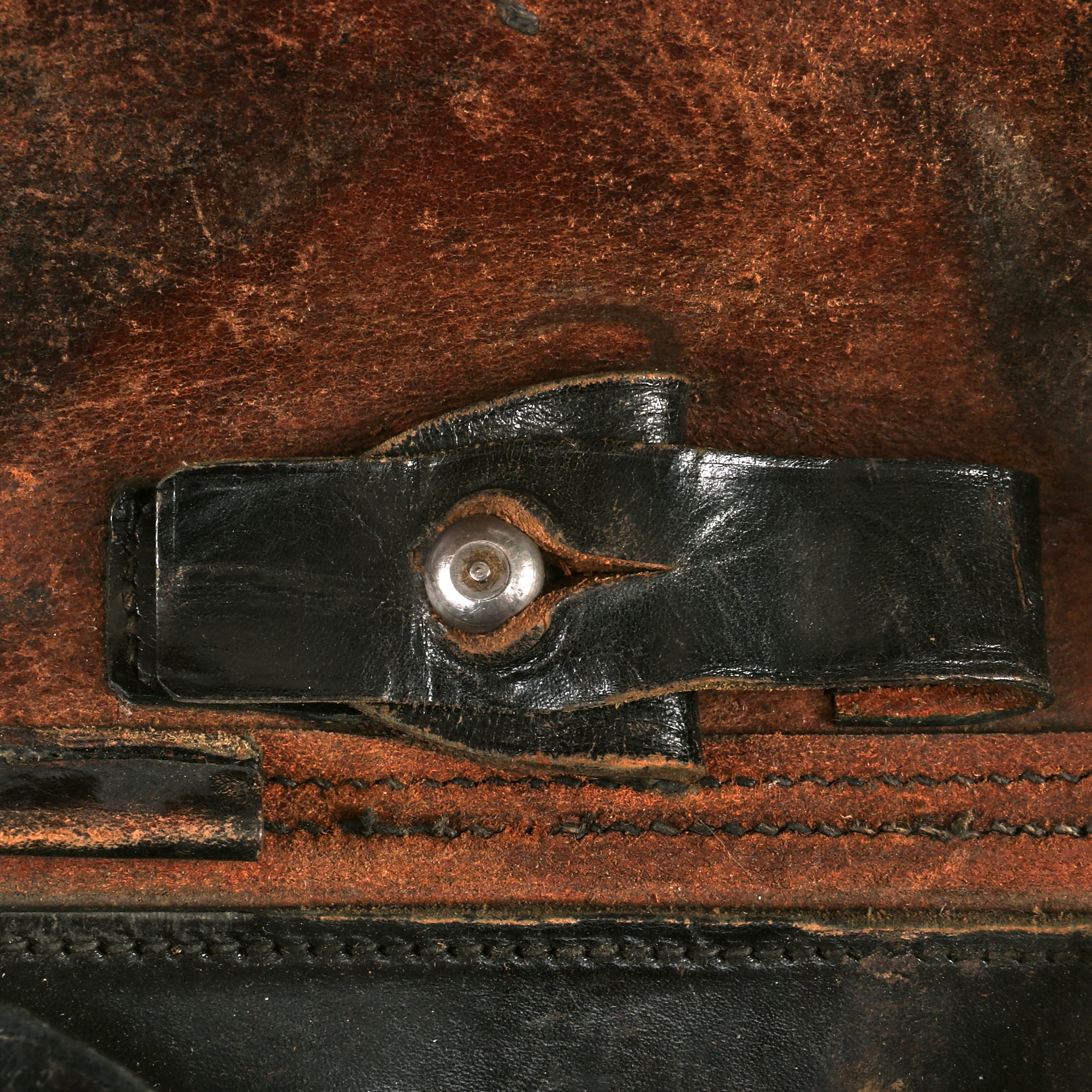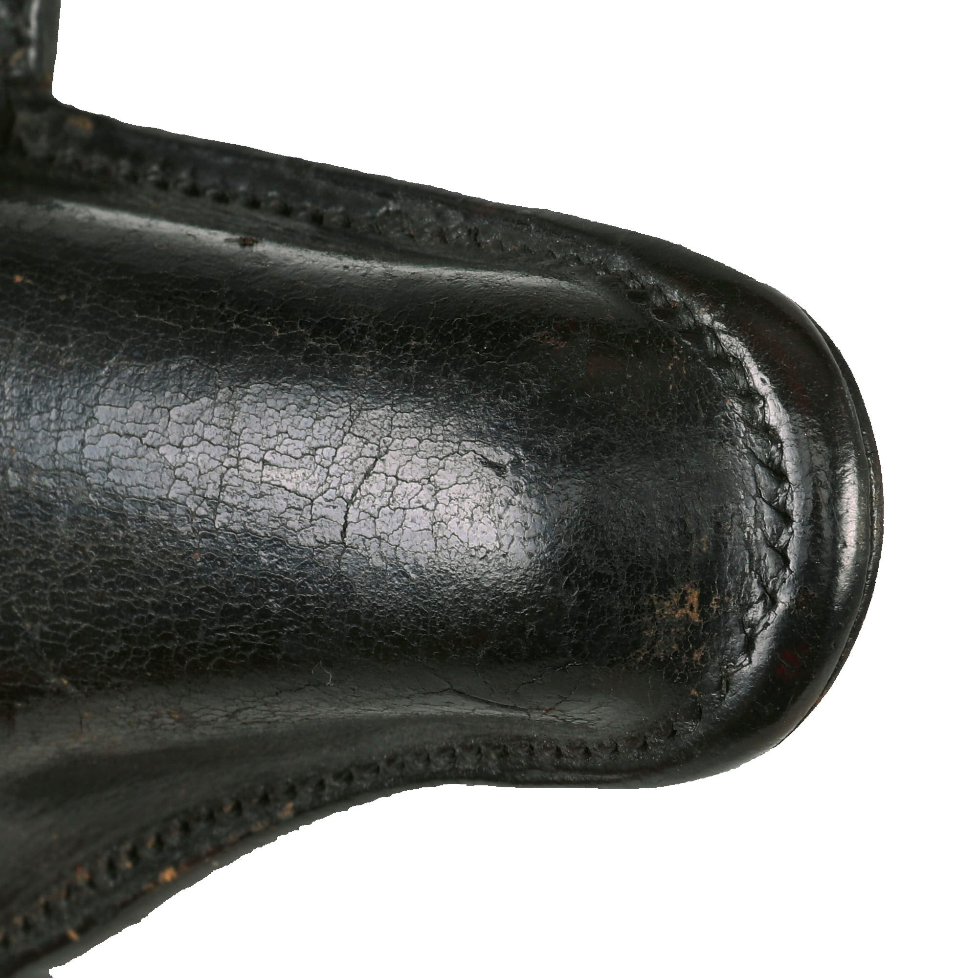 The overall condition of the holster is very good, with supple brown dyed leather and intact heavy stitching, original loops, and pistol ejection strap. The original flap securing strap and buckle are present and in functional condition. Both belt loops are intact and complete. The tool pouch on the lid of the holster is intact, although there is no tool in this one. There is an extra strap on top of the tool strap which we do see on other 1934 dated holsters, but we are unsure of its purpose.