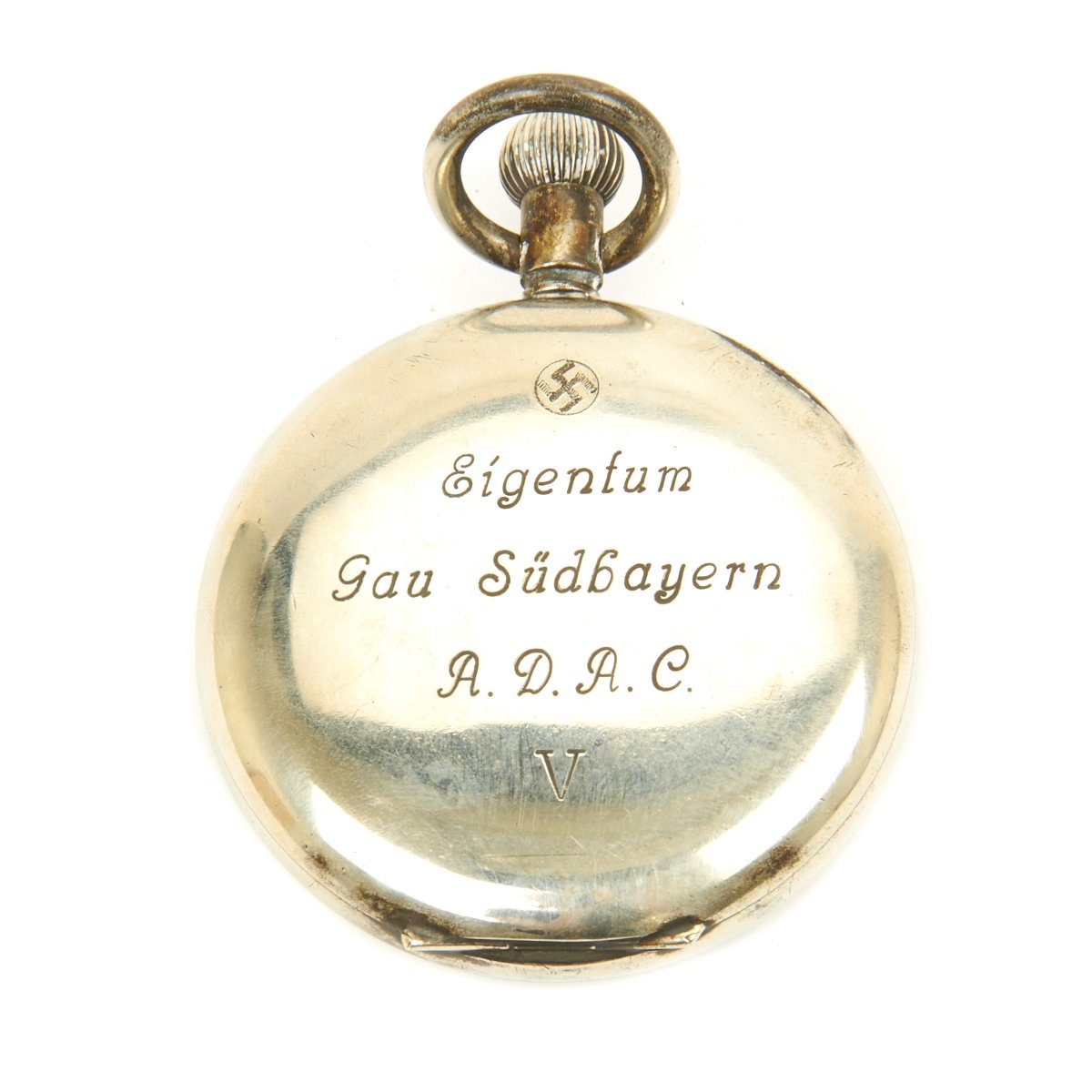 It is in fully working order and on the rear there is an engraving of a NSDAP circled swas over engraved inscription Eigentum Gau Südbayern A.D.A.C. V, indicating that it is the Property of Southern Bavarian District's A.D.A.C.. This was a chapter of a German "automobile club", which was founded in 1903 as as a motorcycle club. In 1911 the name was changed to the Allgemeiner Deutscher Automobil-Club (ADAC), and in 1927 it launched it's roadside assistance program. Unfortunately, all clubs such as this were taken over by the NSDAP Party in 1934,and merged into the "German Car Club". These "Clubs" were used by the NSDAPs to encourage Automobile skills as they did for Flying skills during the time when Germany was not allowed and Military organisations. The Swas on this watch looks to have been added after the club was taken over in 1934.